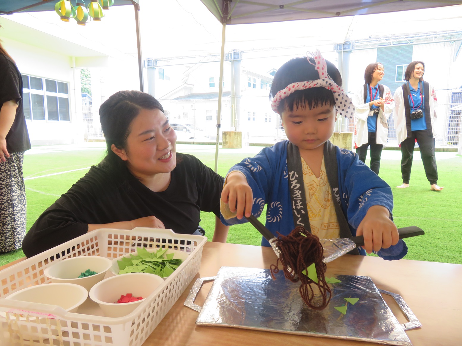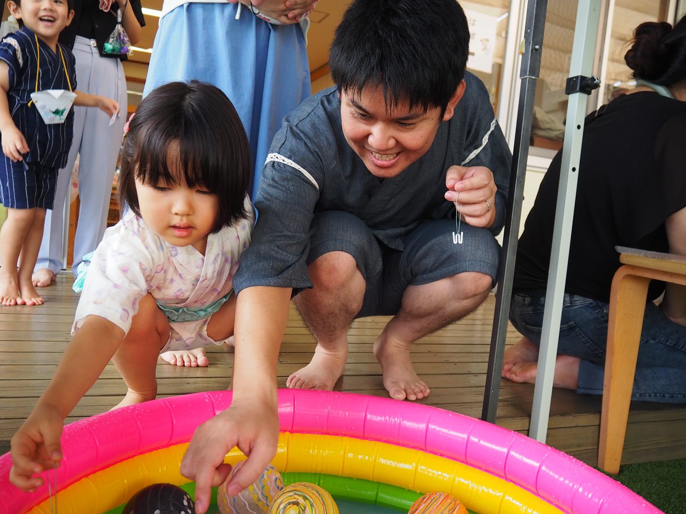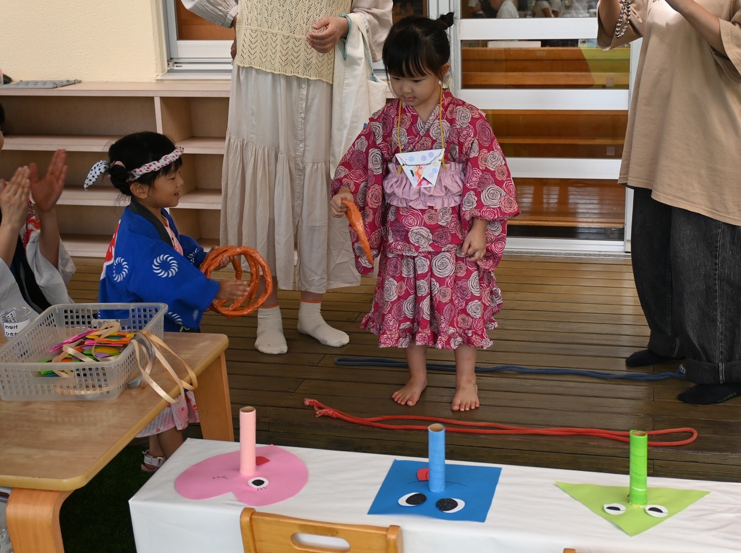 『夏祭り』をテーマに、お父さんお母さんと一緒にお店屋さんごっこを行いました。