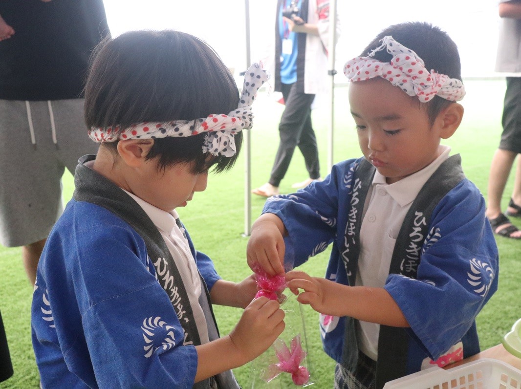 夏祭りがスタートすると、「いらっしゃいませー!」と元気に声掛けを行うお店屋さんチーム。