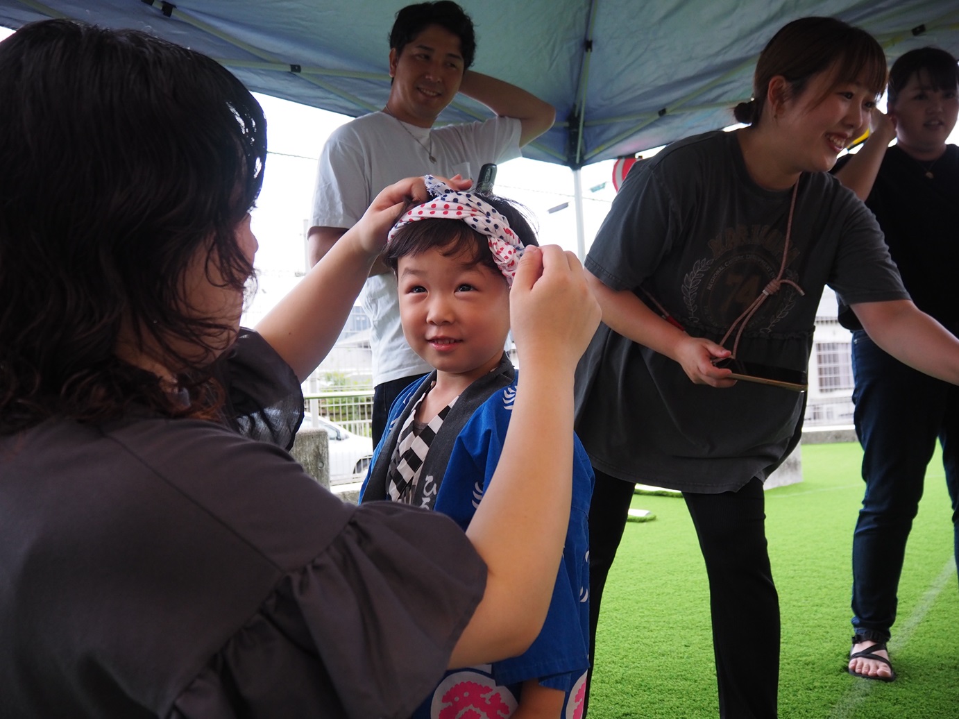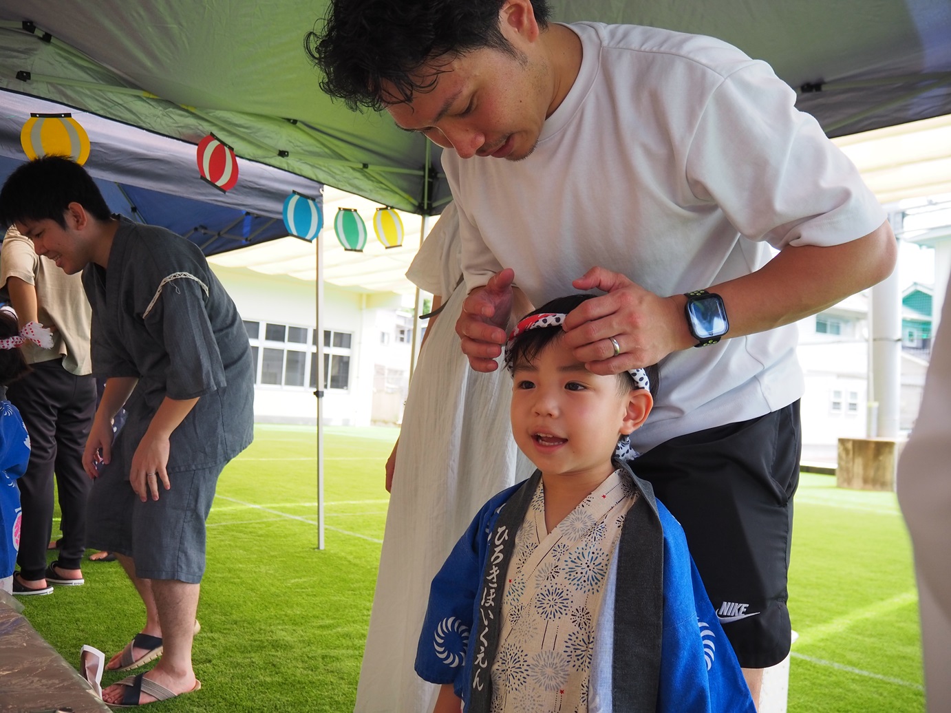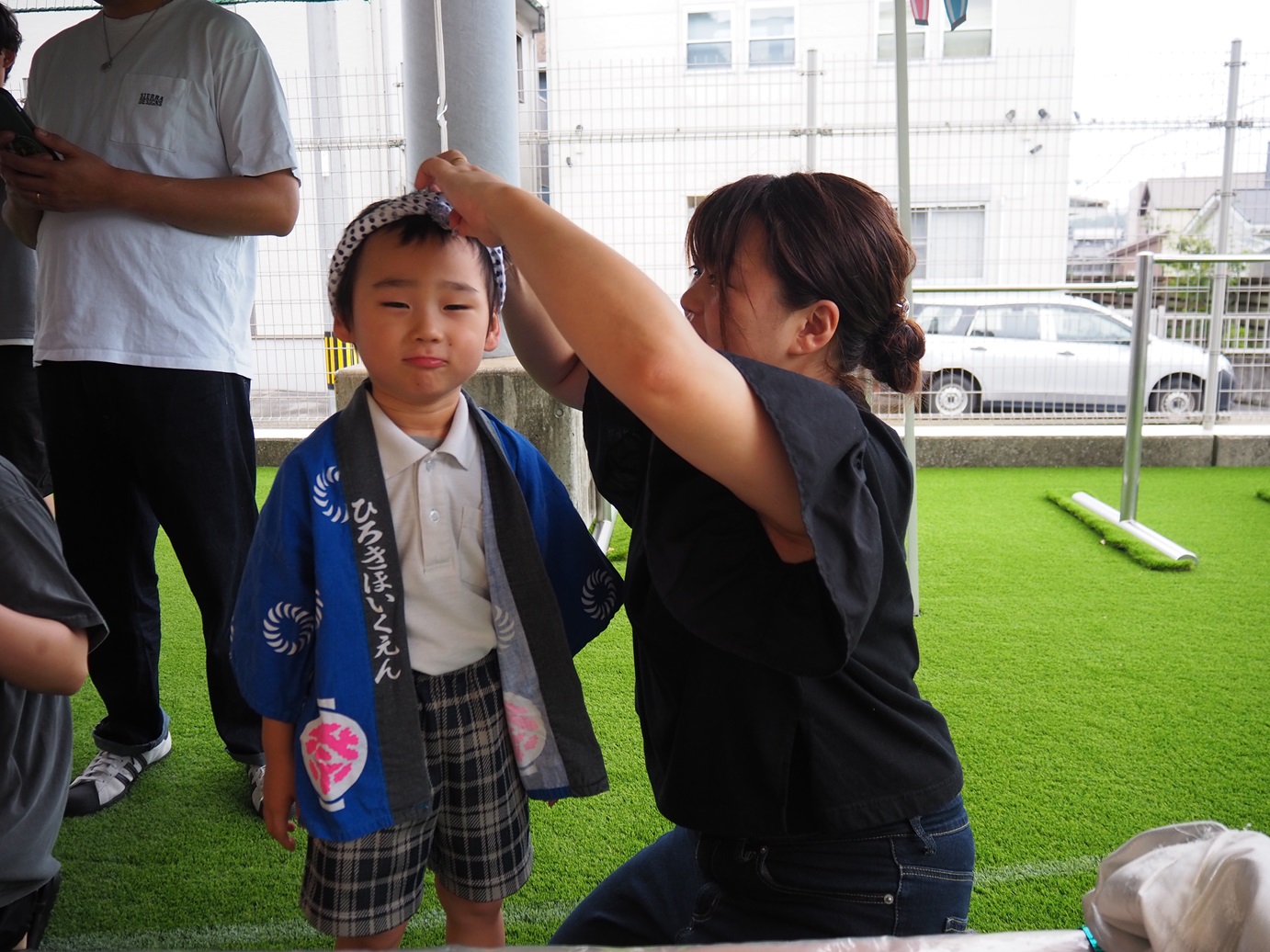 甚平や浴衣姿で登園してくると、少し緊張した様子のりす組さんでしたが、法被を着てはちまきを付けると気合十分な姿がありました。