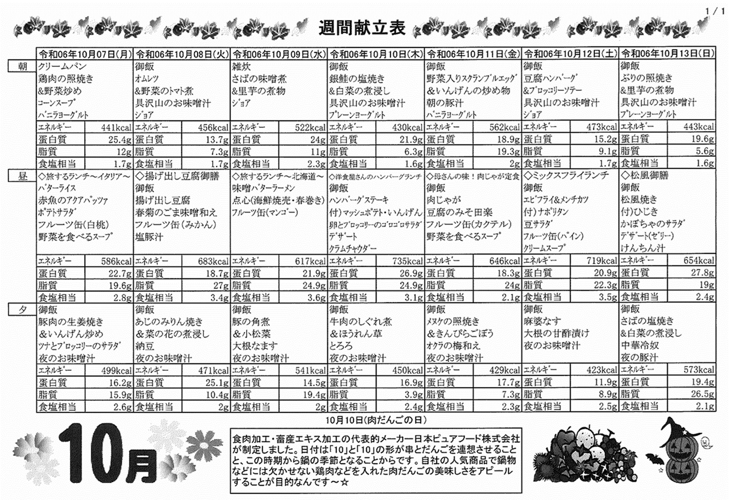 10月7日(月)~10月13日(日)の献立表になります。ぜひご覧ください。