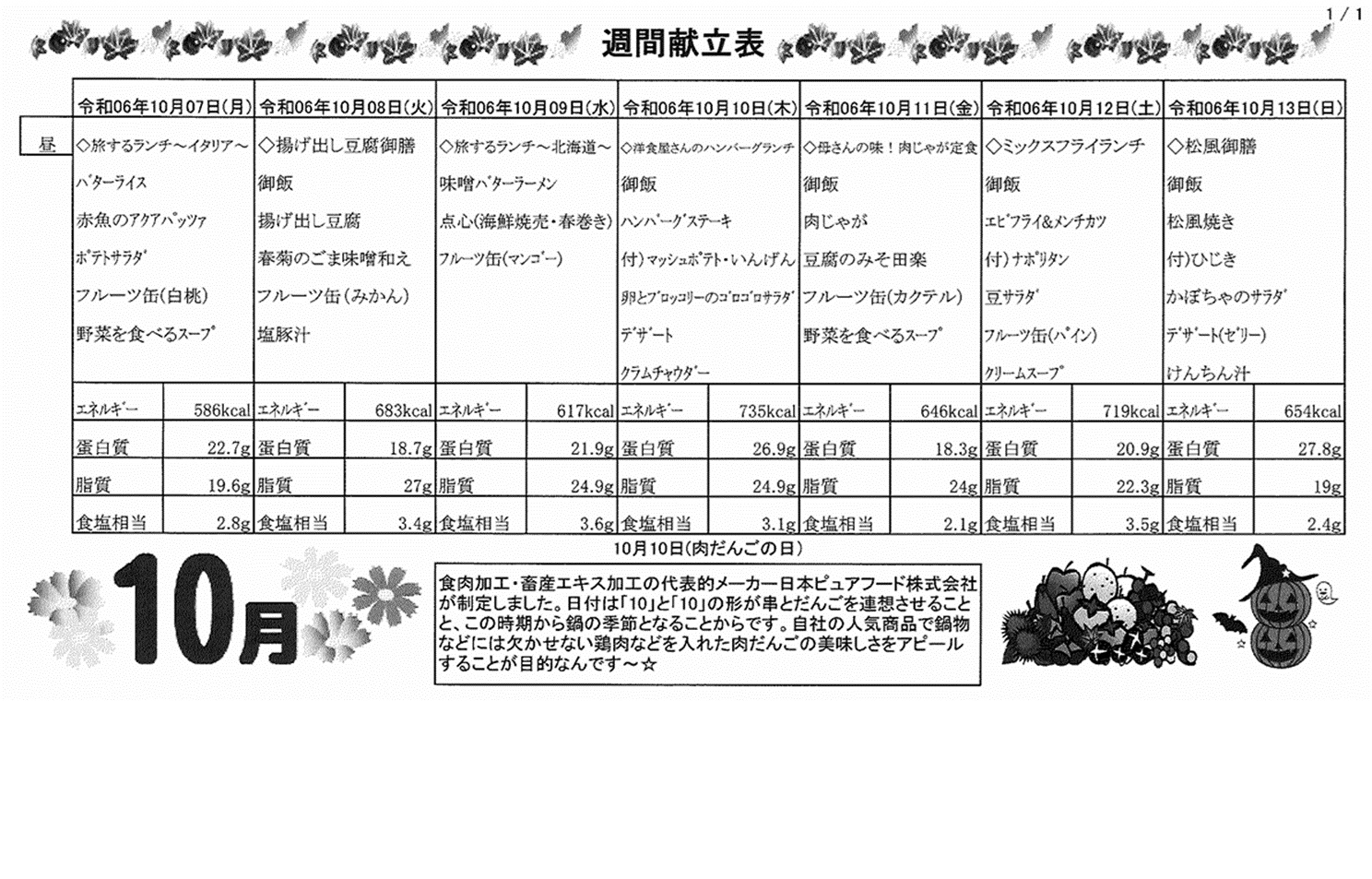 10月7日(月)~10月13日(日)の献立表になります。ぜひご覧ください。