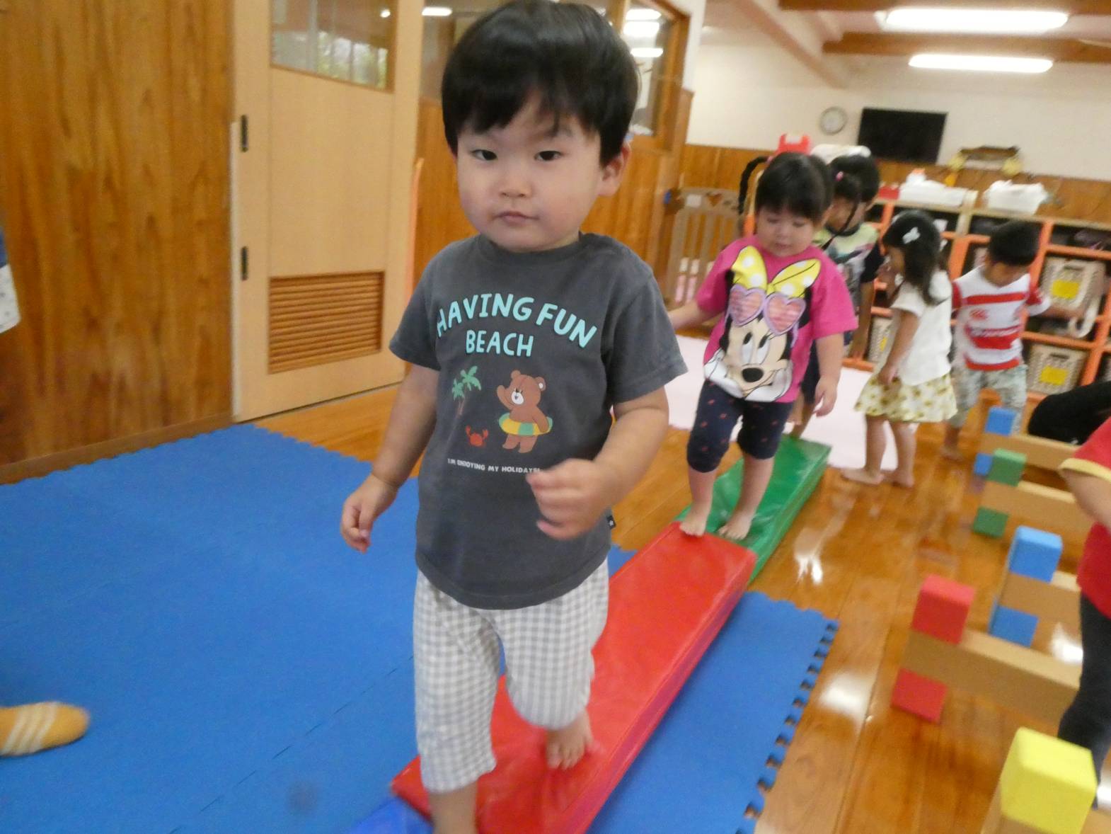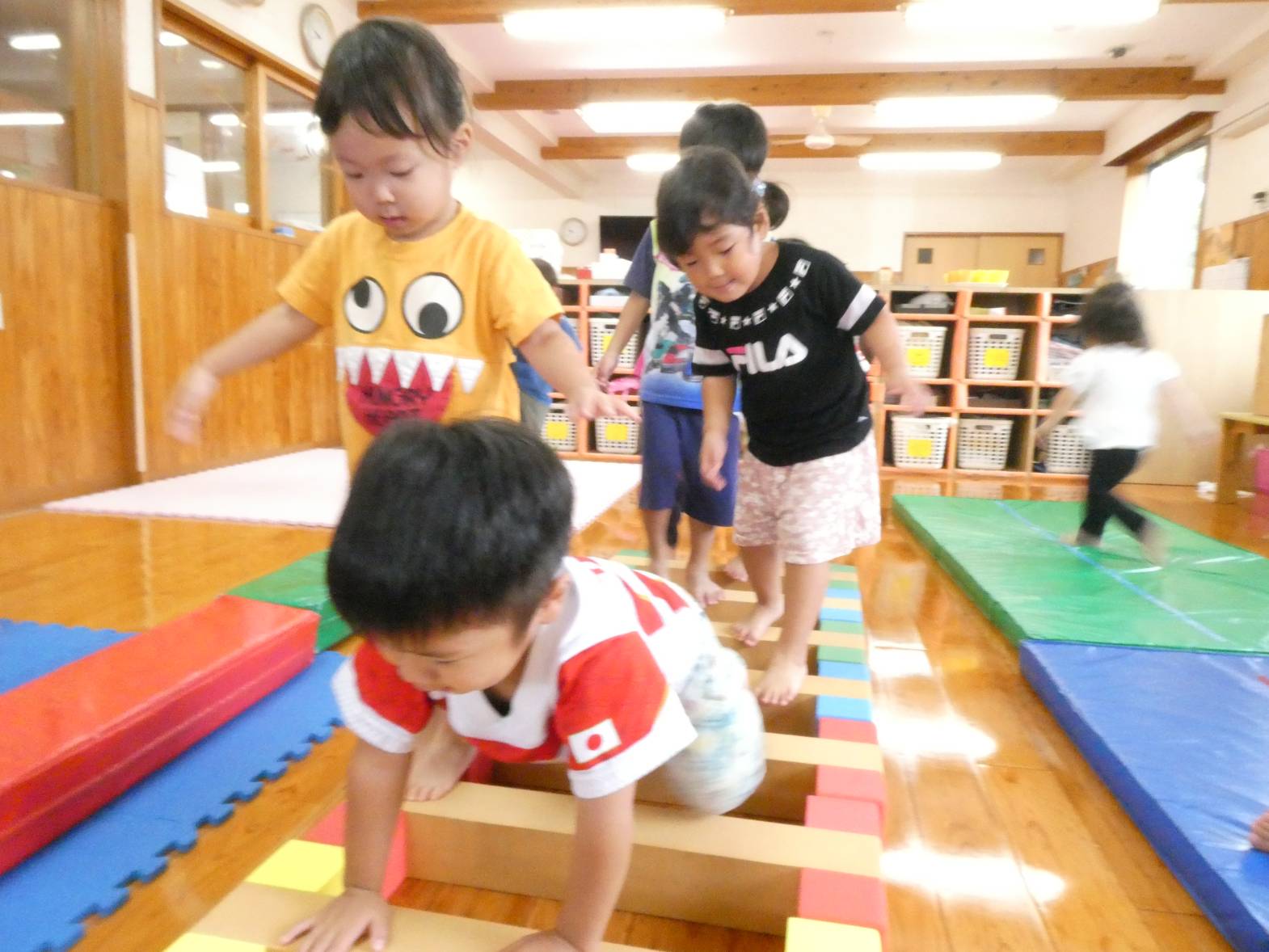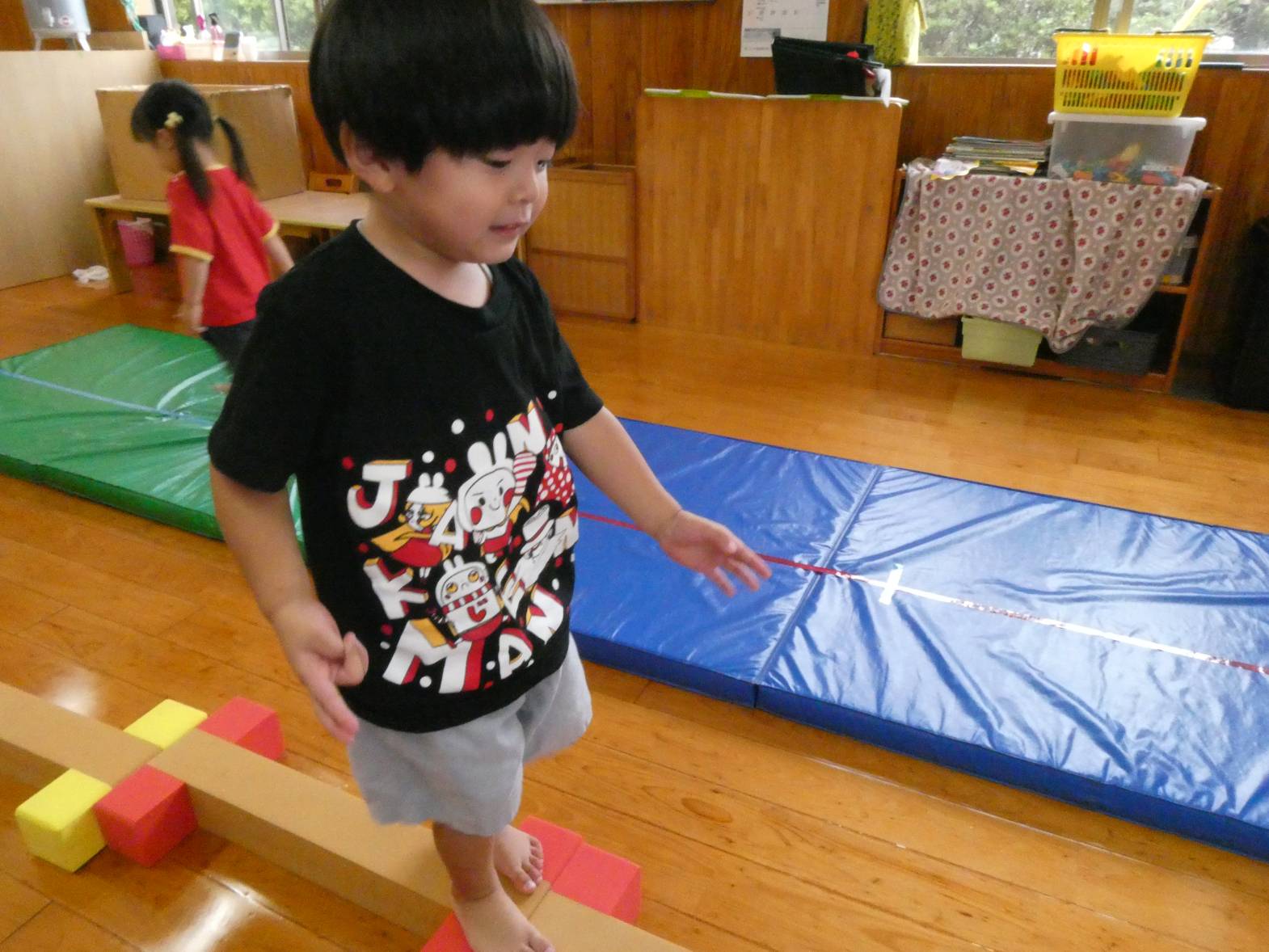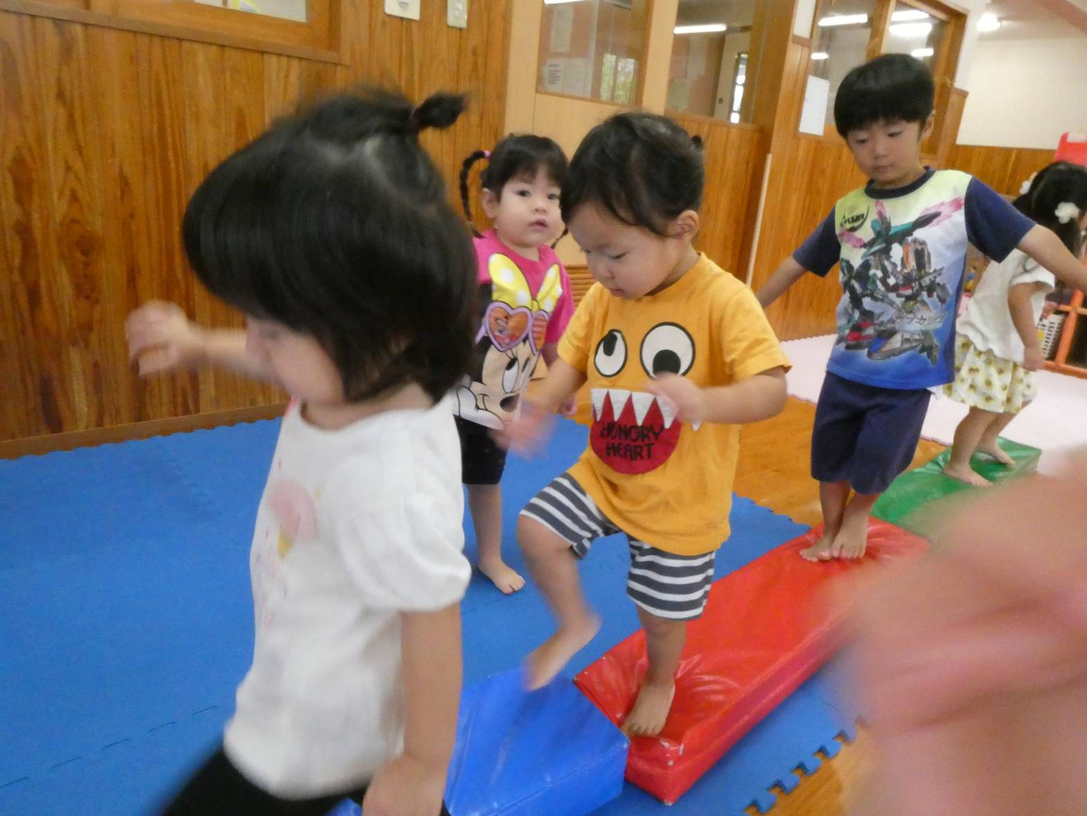 体を動かすことが大好きな子どもたち。 今日は、天気が雨だったため室内で遊びました。 大きなマットでは、ごろんっと横になる子どもたち。 とても気持ちよさそうです。 細長いマットでは、マットから落ちないように慎重に歩いていく子どもたちです。 ハードルでは、ハードルを倒さないようにまたいだり、ジャンプをしたりしました。 「難しいね~。」、「私は全然倒れなかったよ!」と、様々な声が聞こえてきました。 汗をかきながらたくさん体を動かせて、大満足なぱんだ組さんです♪