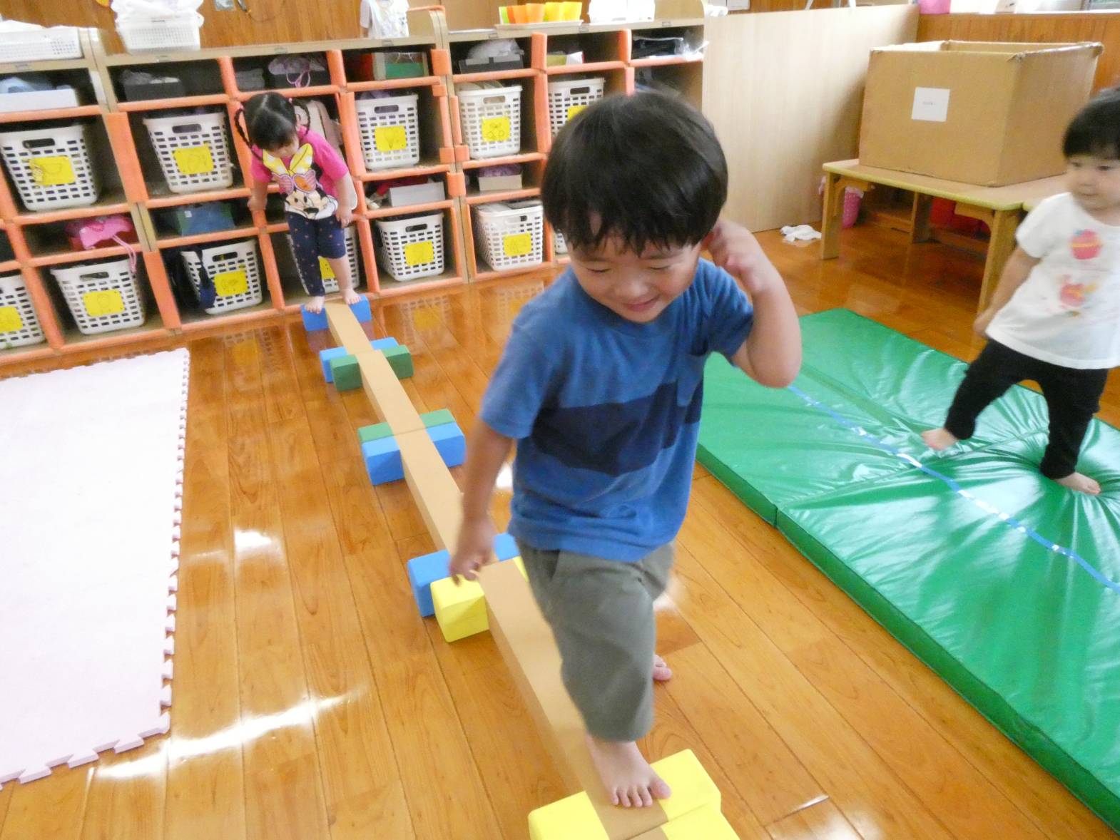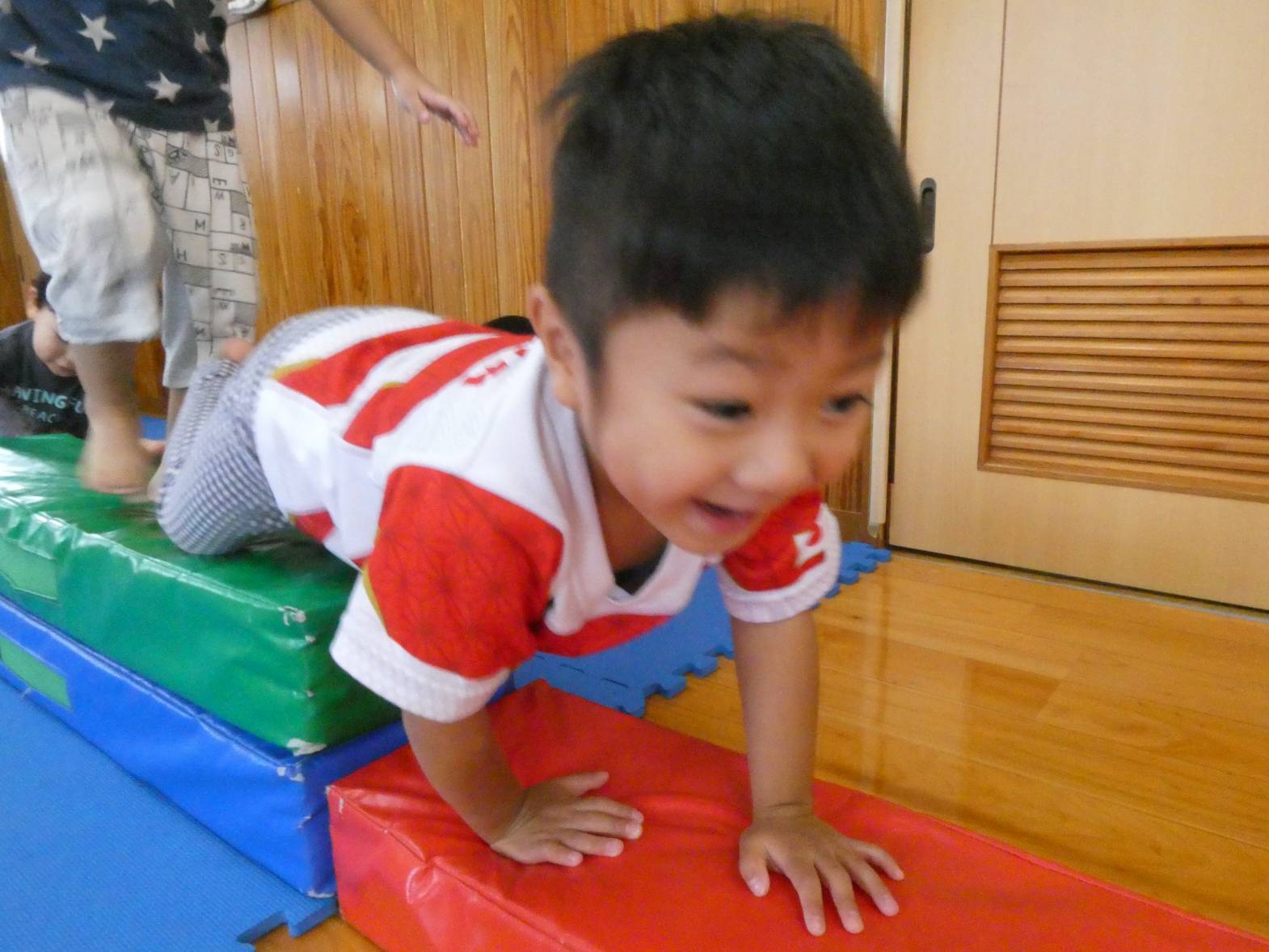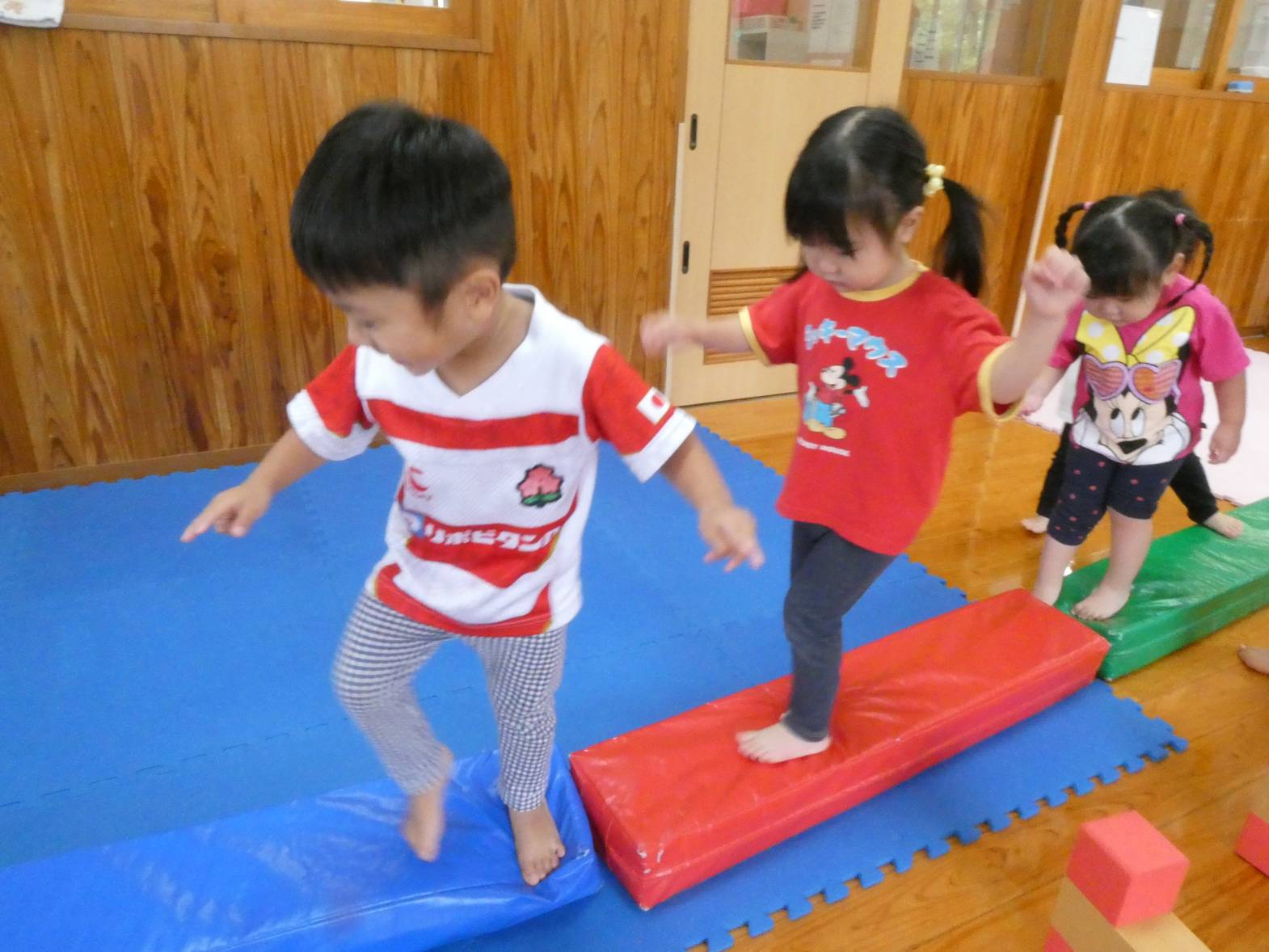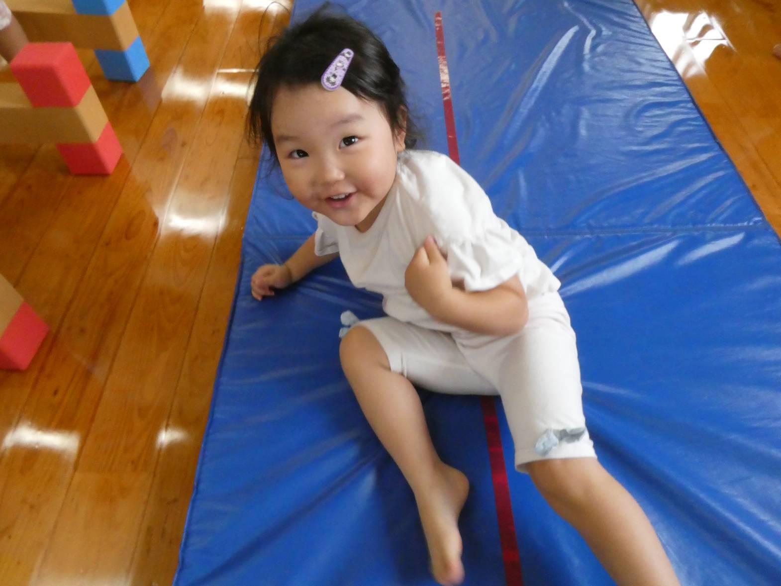 体を動かすことが大好きな子どもたち。 今日は、天気が雨だったため室内で遊びました。 大きなマットでは、ごろんっと横になる子どもたち。 とても気持ちよさそうです。 細長いマットでは、マットから落ちないように慎重に歩いていく子どもたちです。 ハードルでは、ハードルを倒さないようにまたいだり、ジャンプをしたりしました。 「難しいね~。」、「私は全然倒れなかったよ!」と、様々な声が聞こえてきました。 汗をかきながらたくさん体を動かせて、大満足なぱんだ組さんです♪