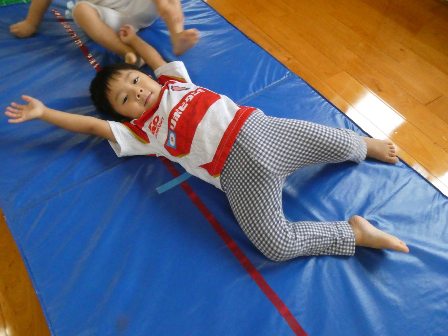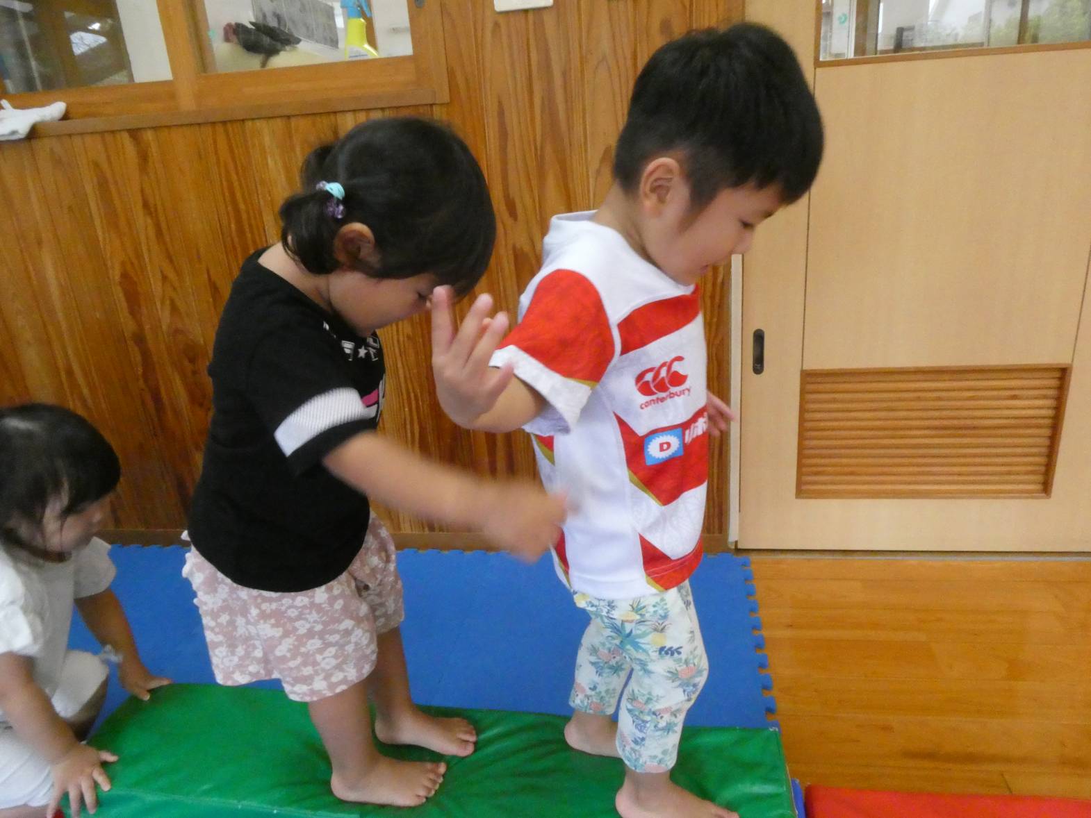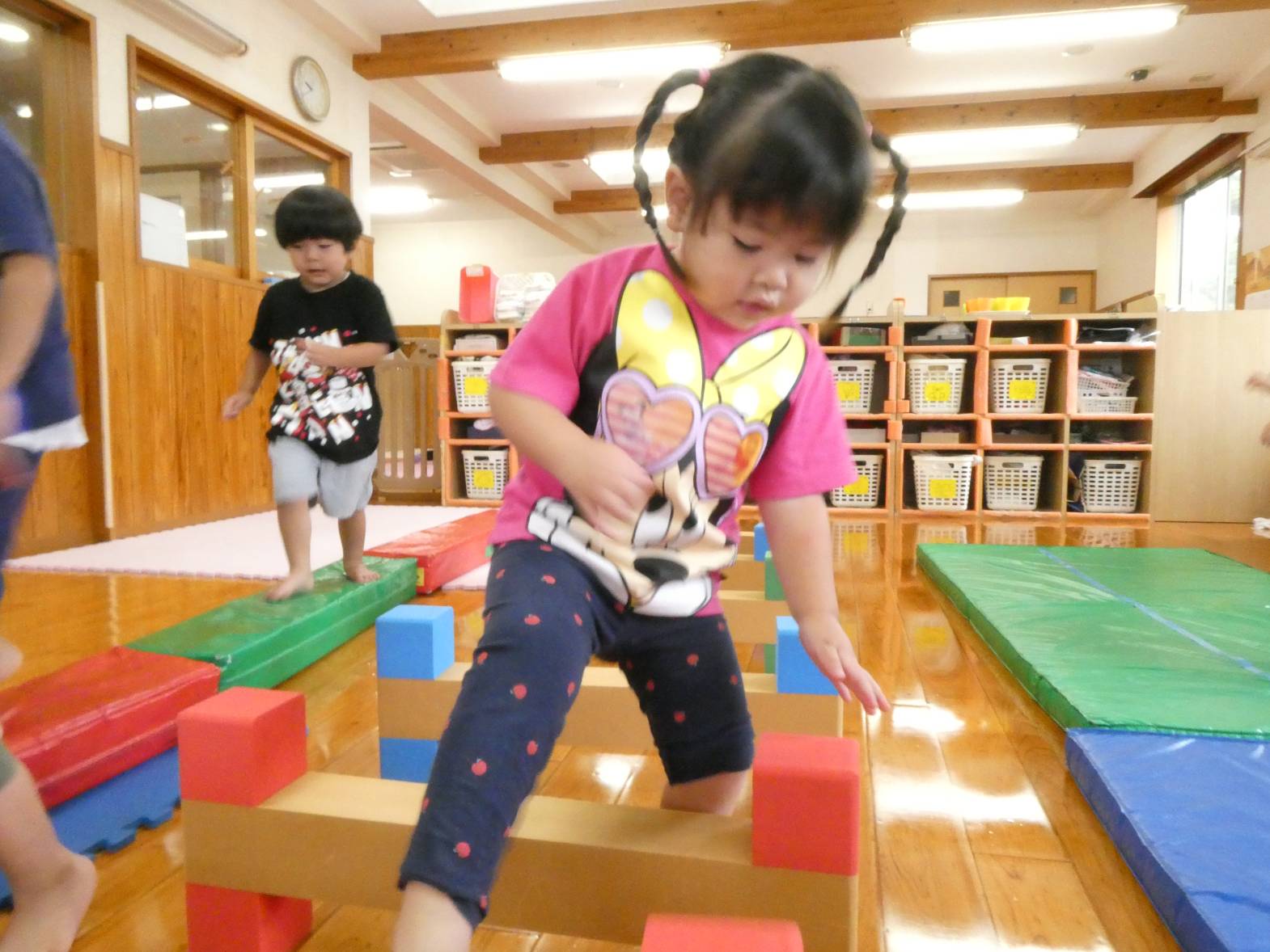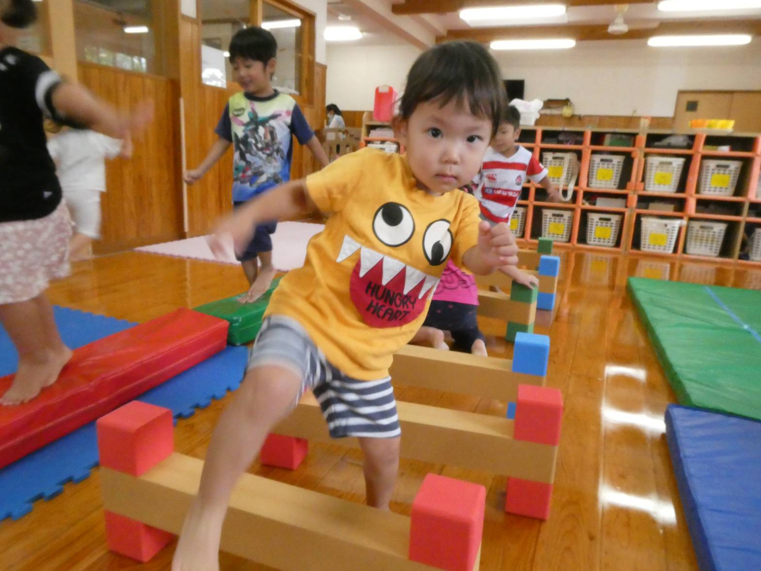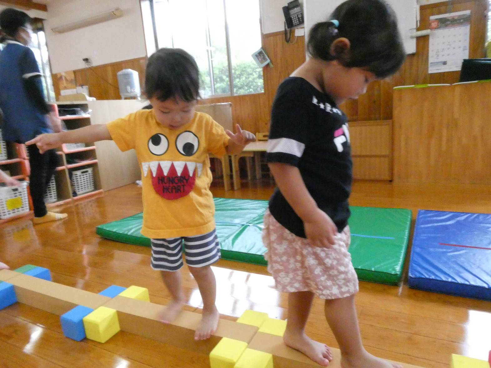 体を動かすことが大好きな子どもたち。 今日は、天気が雨だったため室内で遊びました。 大きなマットでは、ごろんっと横になる子どもたち。 とても気持ちよさそうです。 細長いマットでは、マットから落ちないように慎重に歩いていく子どもたちです。 ハードルでは、ハードルを倒さないようにまたいだり、ジャンプをしたりしました。 「難しいね~。」、「私は全然倒れなかったよ!」と、様々な声が聞こえてきました。 汗をかきながらたくさん体を動かせて、大満足なぱんだ組さんです♪