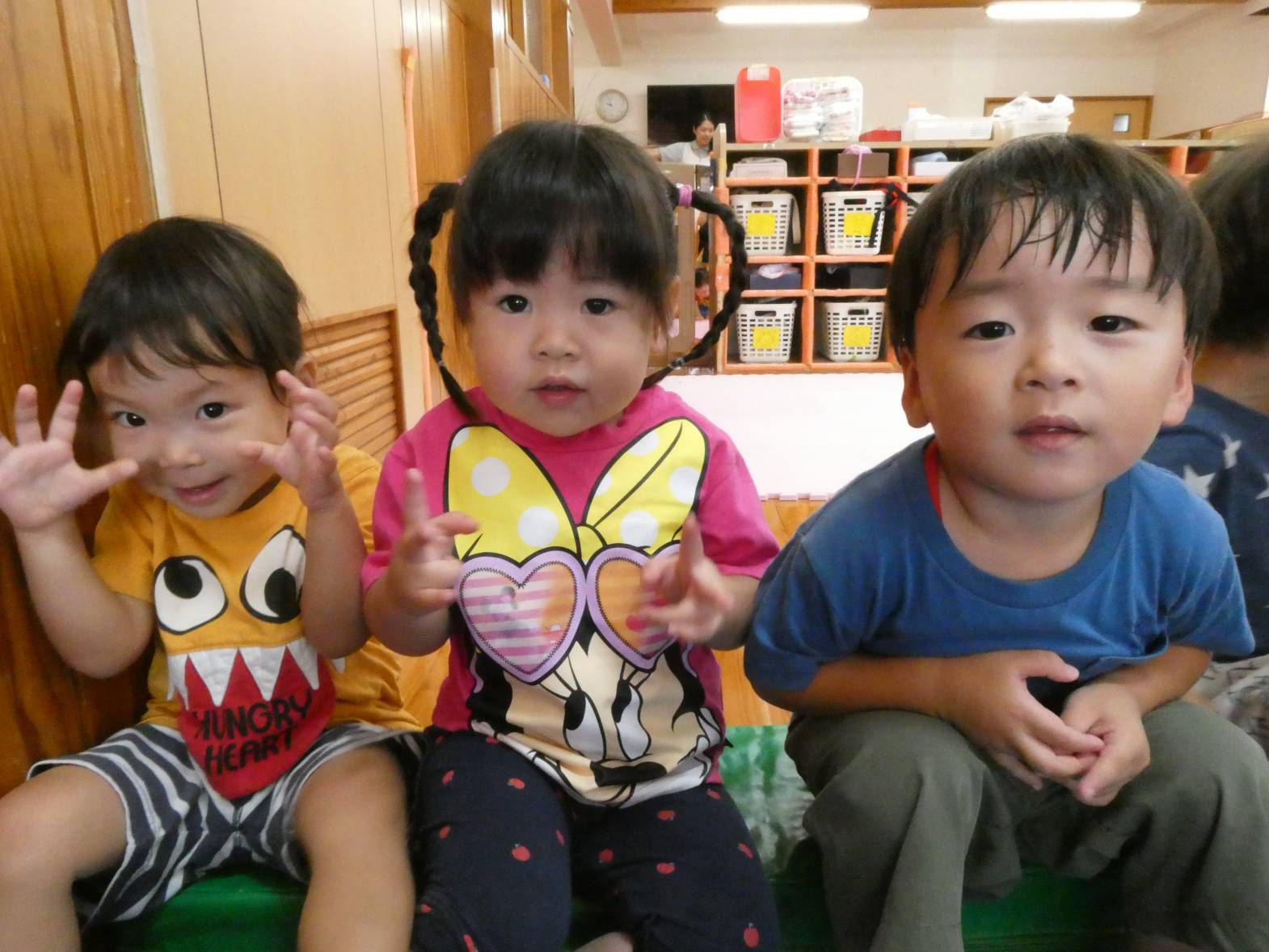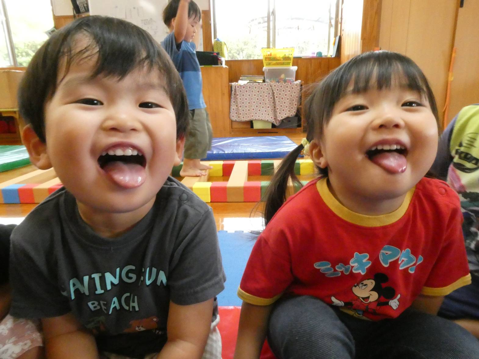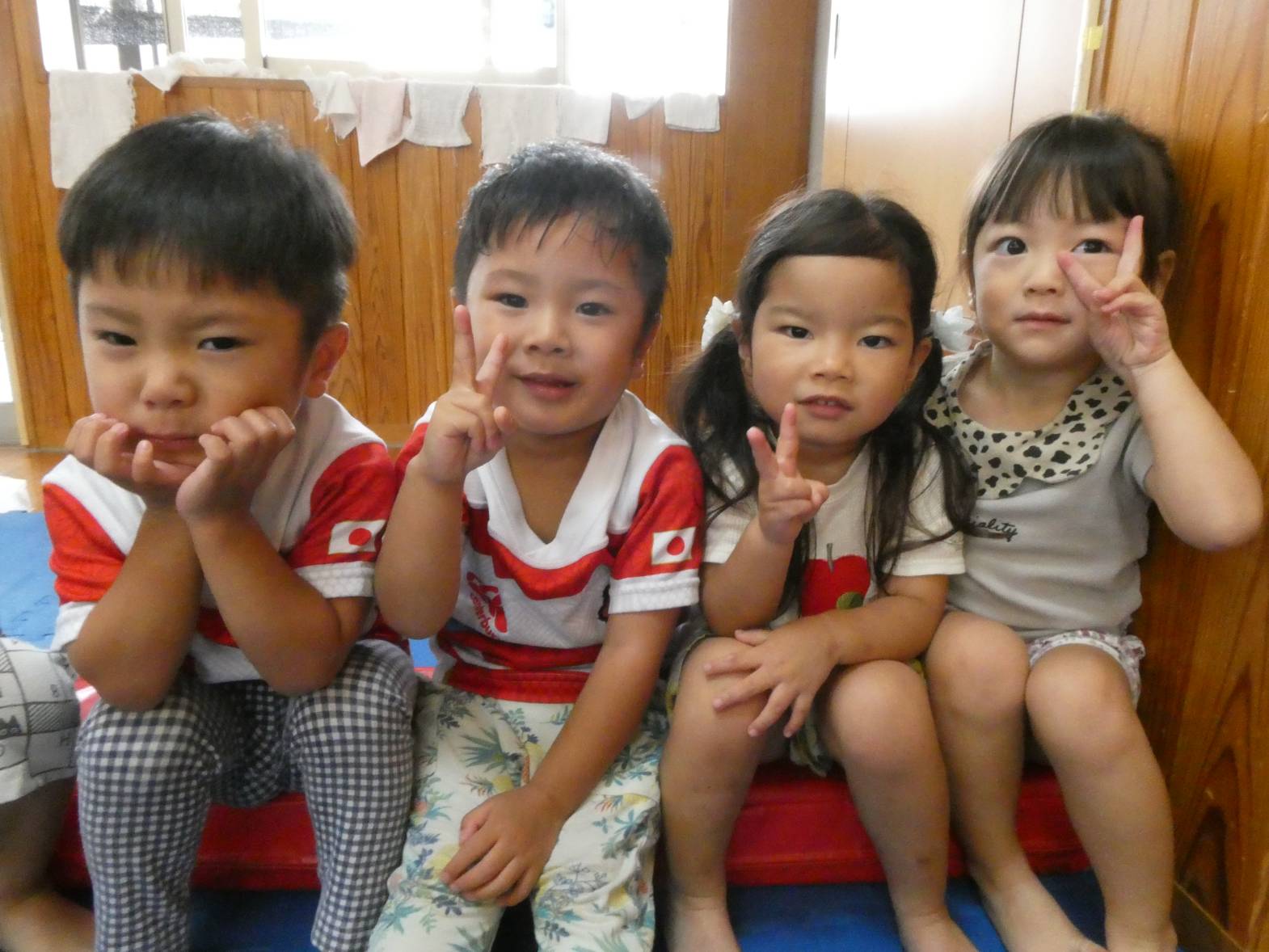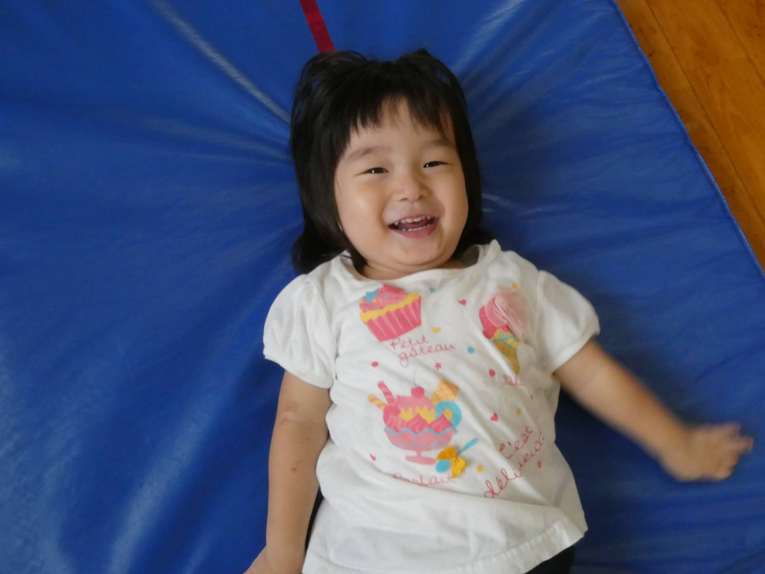 体を動かすことが大好きな子どもたち。 今日は、天気が雨だったため室内で遊びました。 大きなマットでは、ごろんっと横になる子どもたち。 とても気持ちよさそうです。 細長いマットでは、マットから落ちないように慎重に歩いていく子どもたちです。 ハードルでは、ハードルを倒さないようにまたいだり、ジャンプをしたりしました。 「難しいね~。」、「私は全然倒れなかったよ!」と、様々な声が聞こえてきました。 汗をかきながらたくさん体を動かせて、大満足なぱんだ組さんです♪