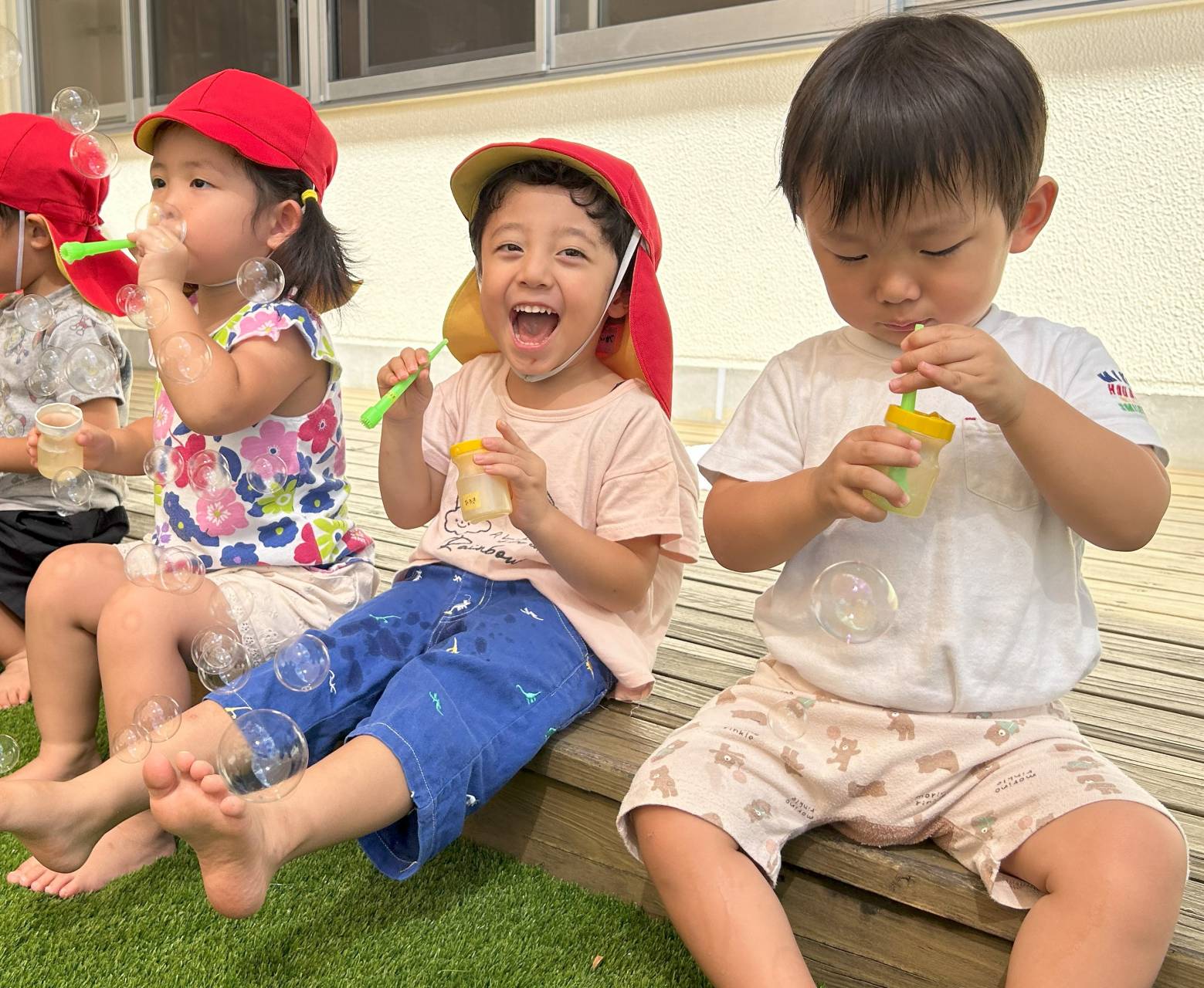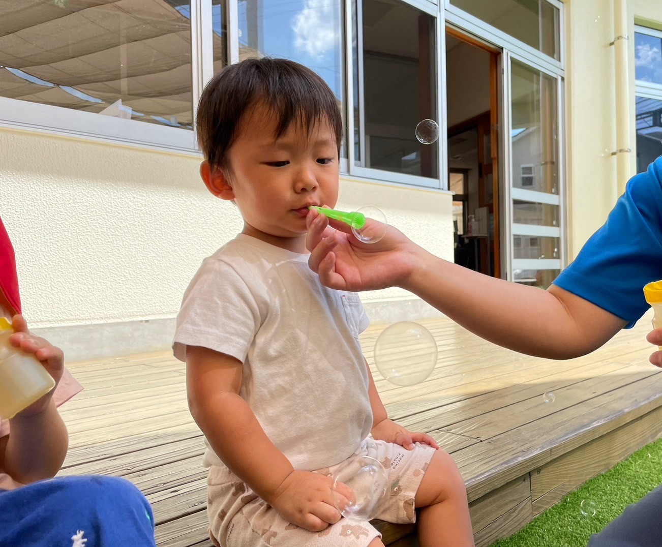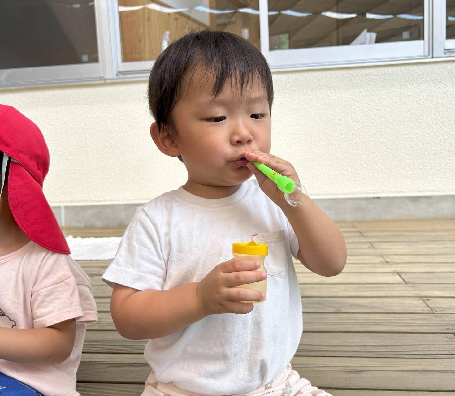 戸外活動で保育園の園庭に行ってシャボン玉をしました。 シャボン玉の道具を見て嬉しそうに目を輝かせる子どもたち! 息の量や強さを調整しながらシャボン玉を吹く姿が見られます。 「きれーい!」、「たくさん出た!」、「楽しい!」などと笑顔で楽しむいぬグループさんでした!