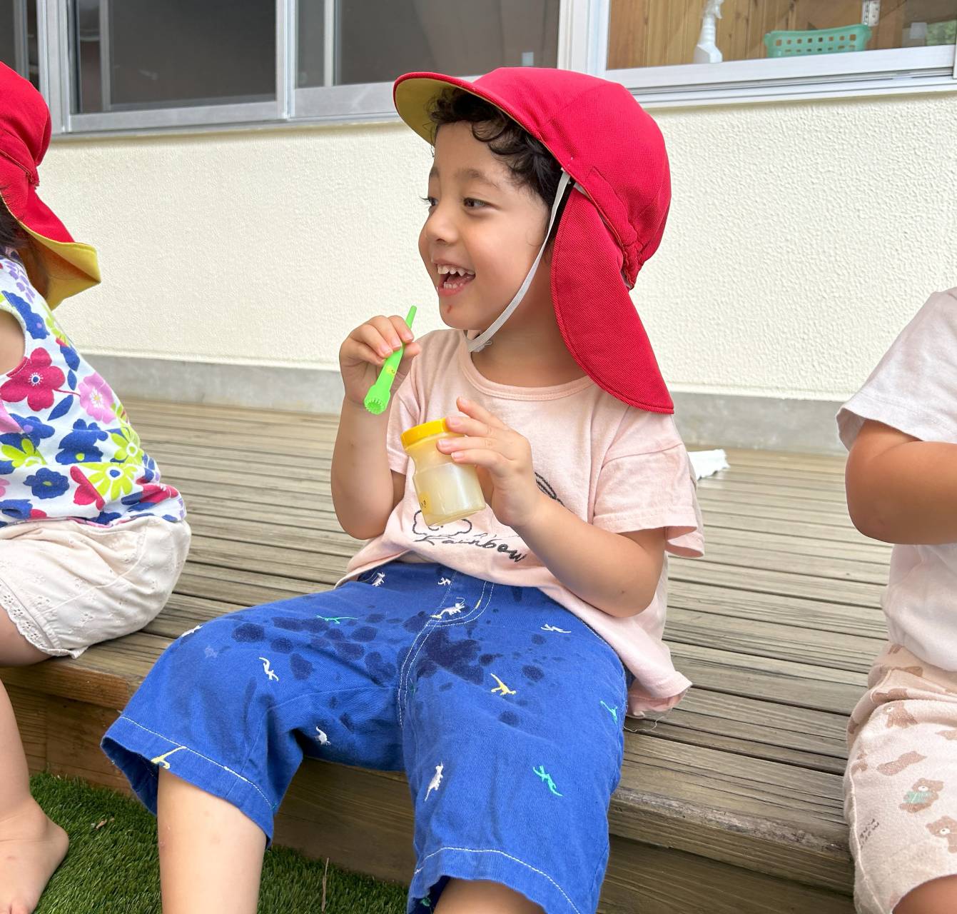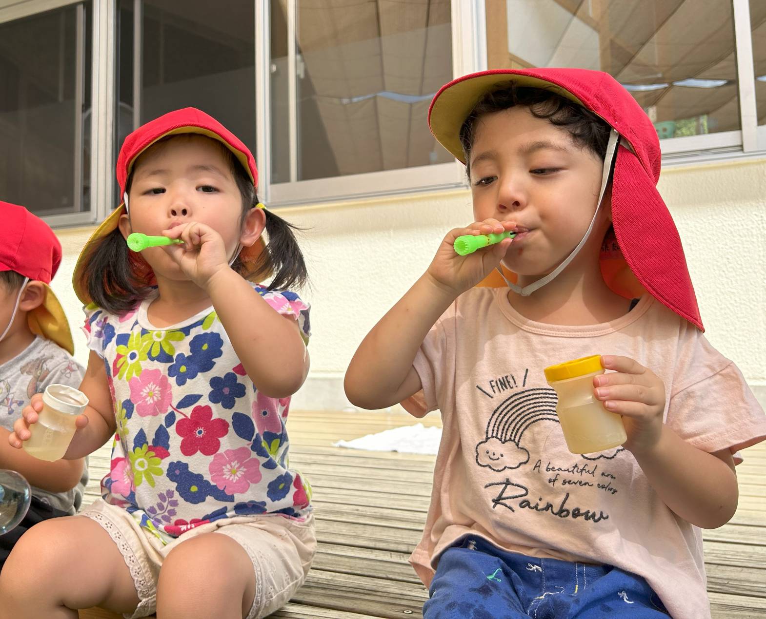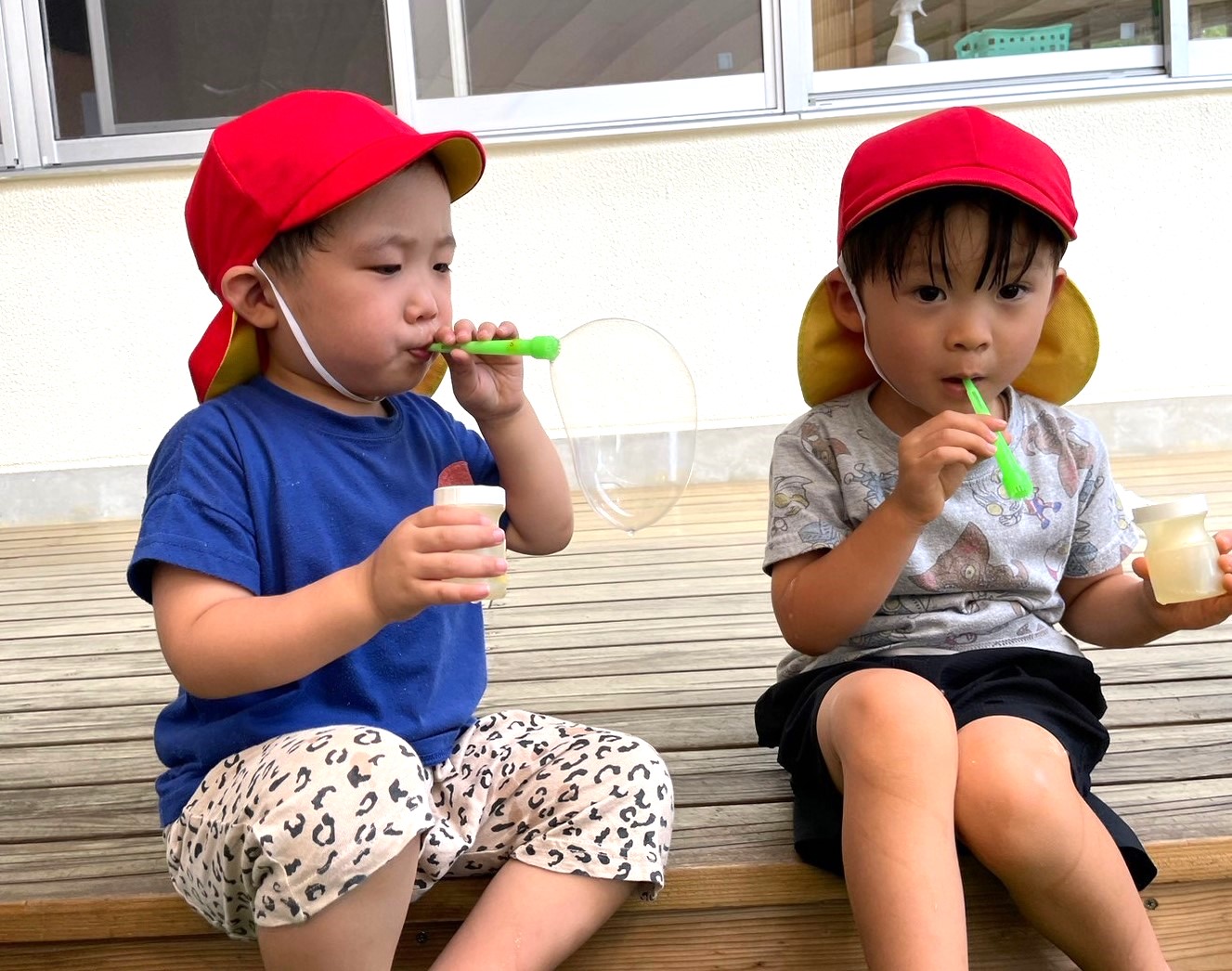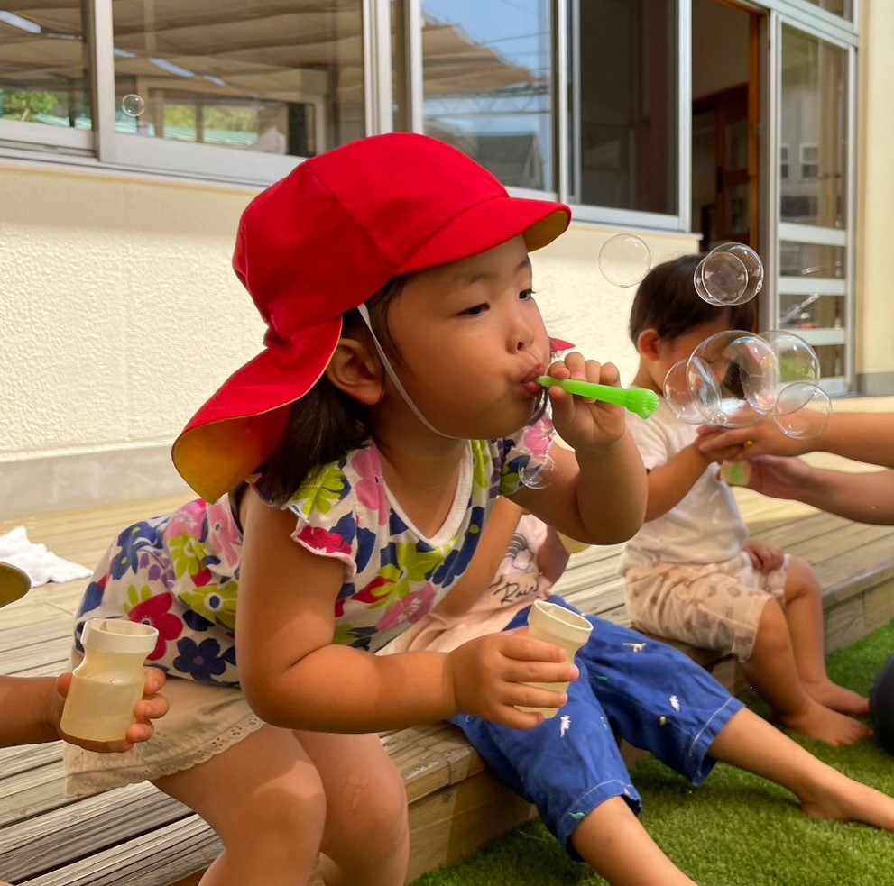 戸外活動で保育園の園庭に行ってシャボン玉をしました。 シャボン玉の道具を見て嬉しそうに目を輝かせる子どもたち! 息の量や強さを調整しながらシャボン玉を吹く姿が見られます。 「きれーい!」、「たくさん出た!」、「楽しい!」などと笑顔で楽しむいぬグループさんでした!