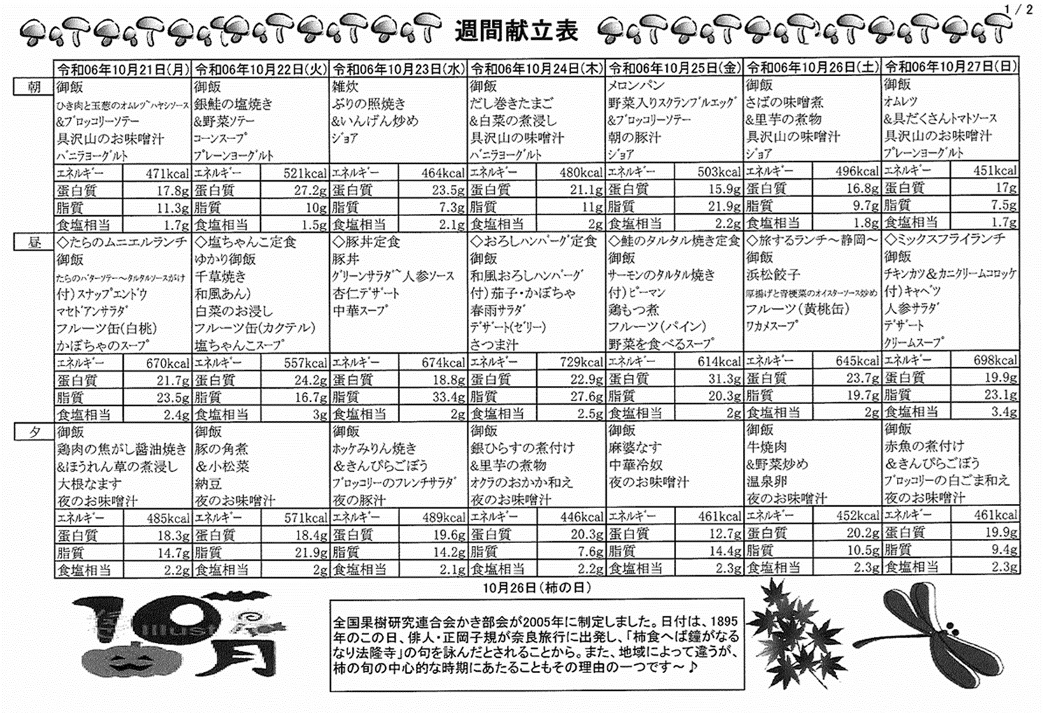 10月21日(月)~10月27日(日)の献立表になります。ぜひご覧ください。