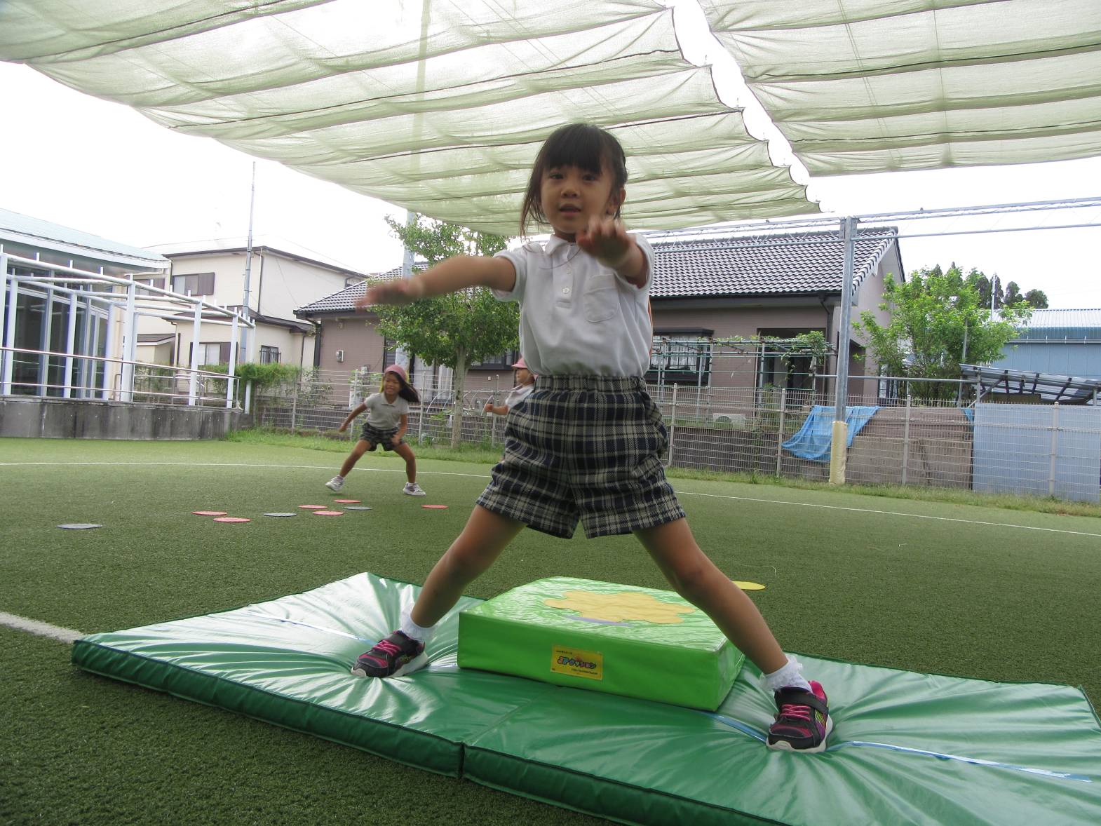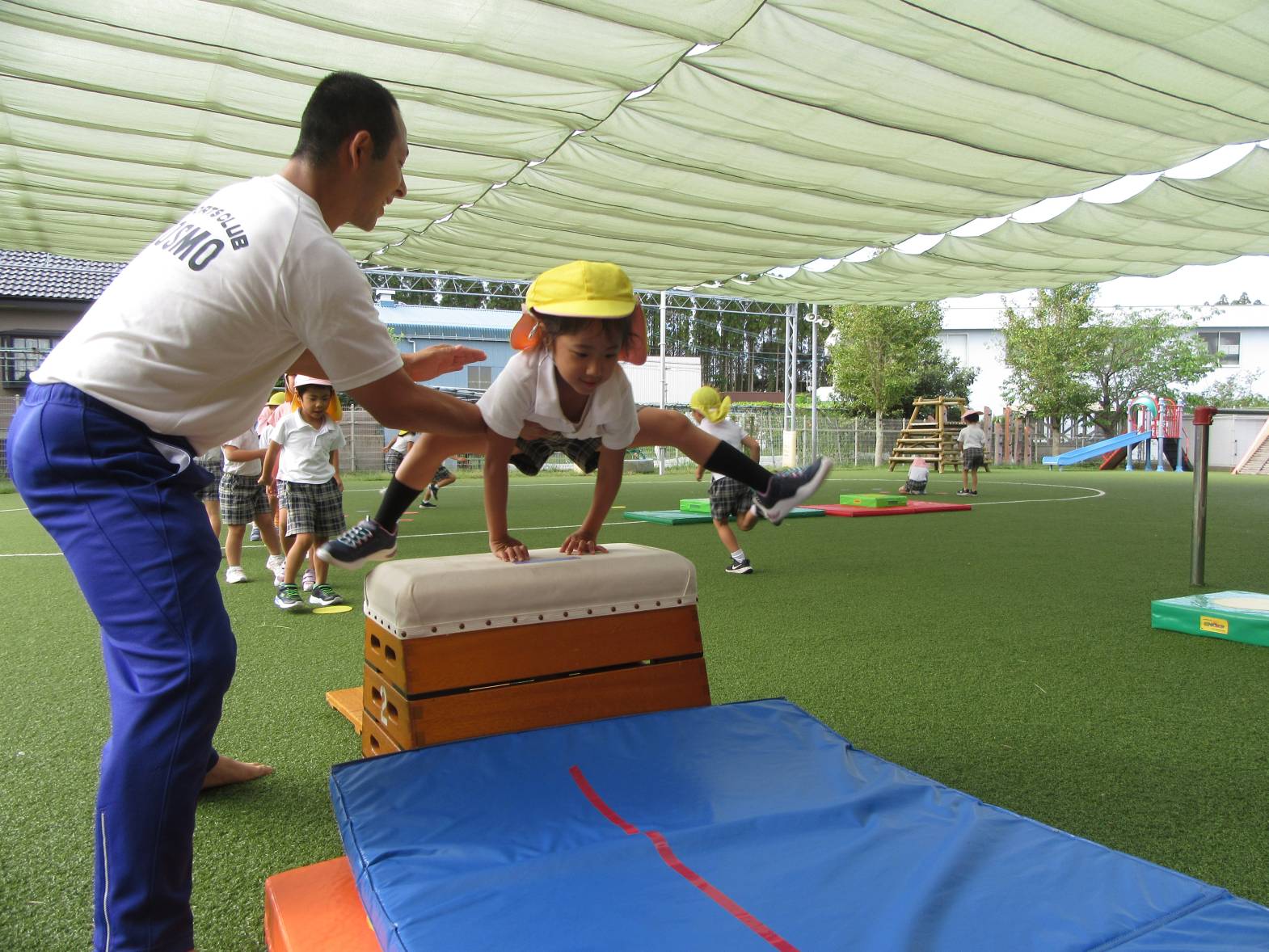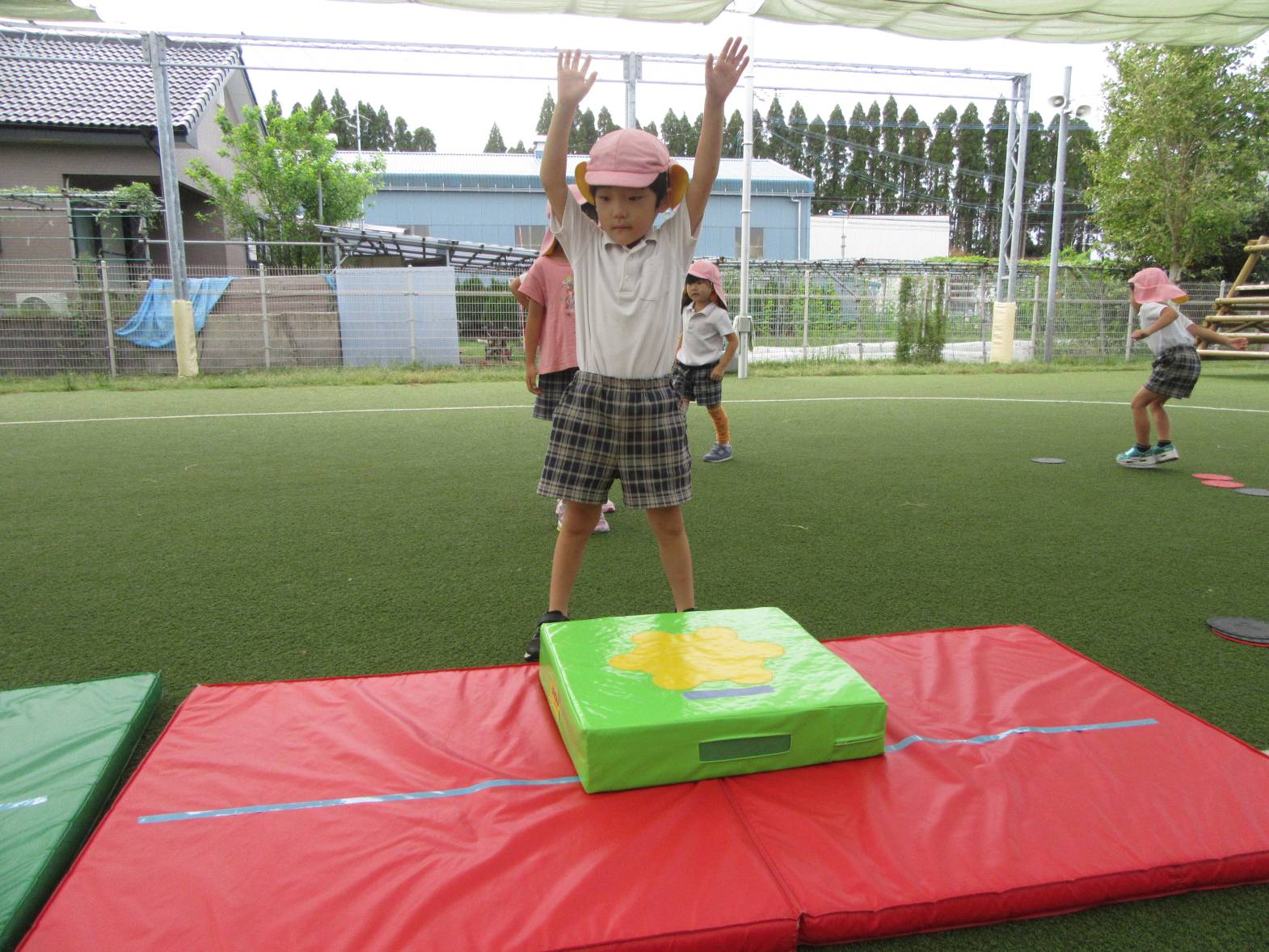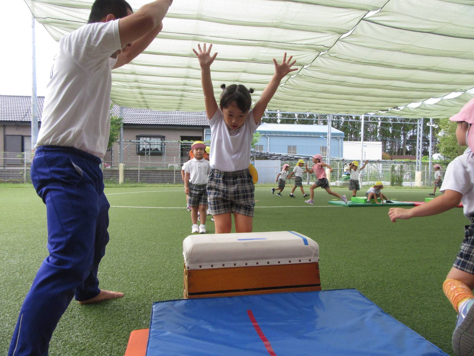 運動遊びでは、跳び箱に挑戦しています! まずはマットを使い、練習していく子どもたち。 跳ぶリズムをつかむと、跳び箱で跳んでみます! いざ跳び箱を目の前にすると、少し恐怖心があるようでしたが、何度も挑戦する姿が見られました。 「4段跳べるようになった!」、「5段も頑張る!」と意気込んでいるきりん組さんです!