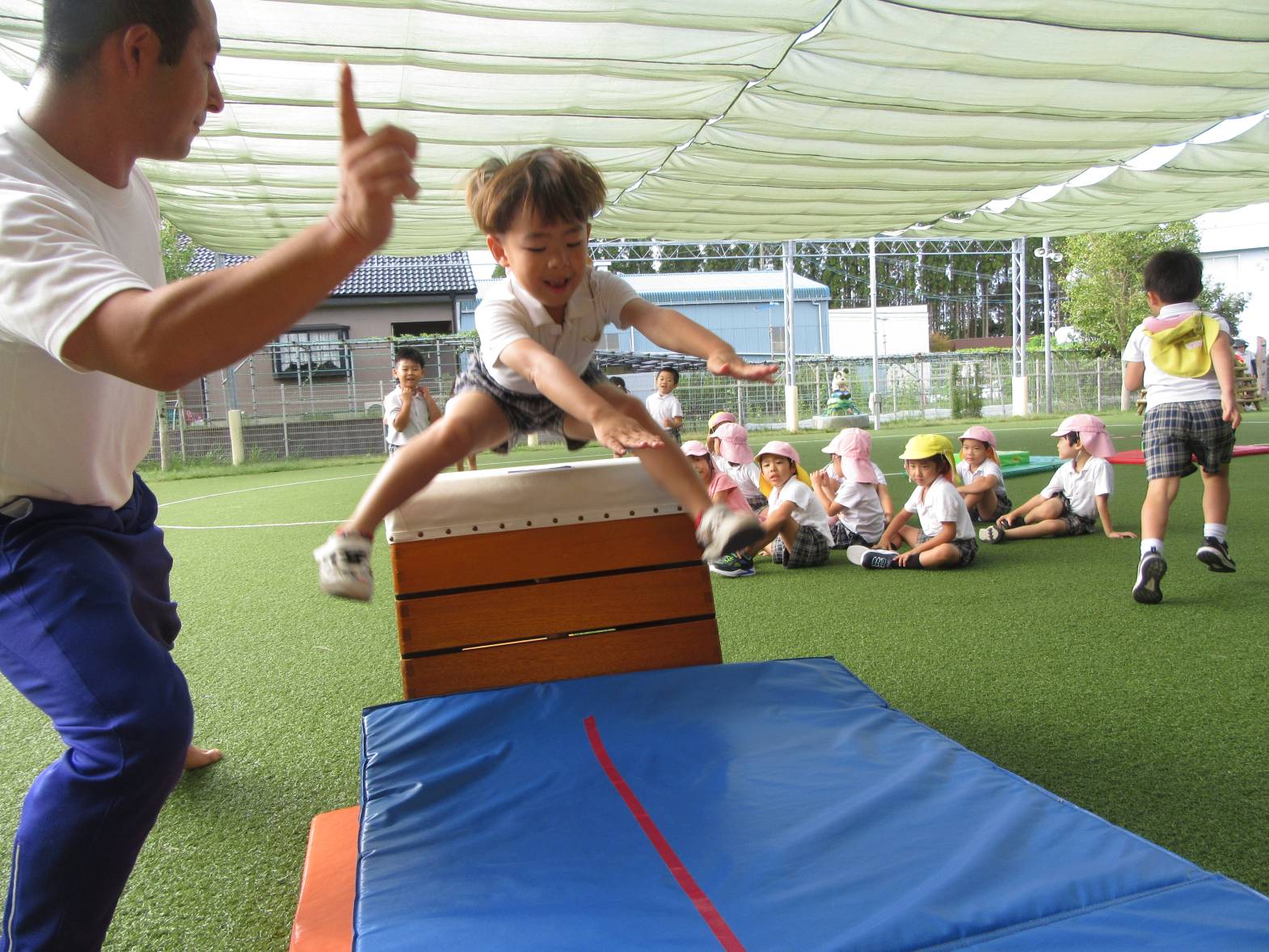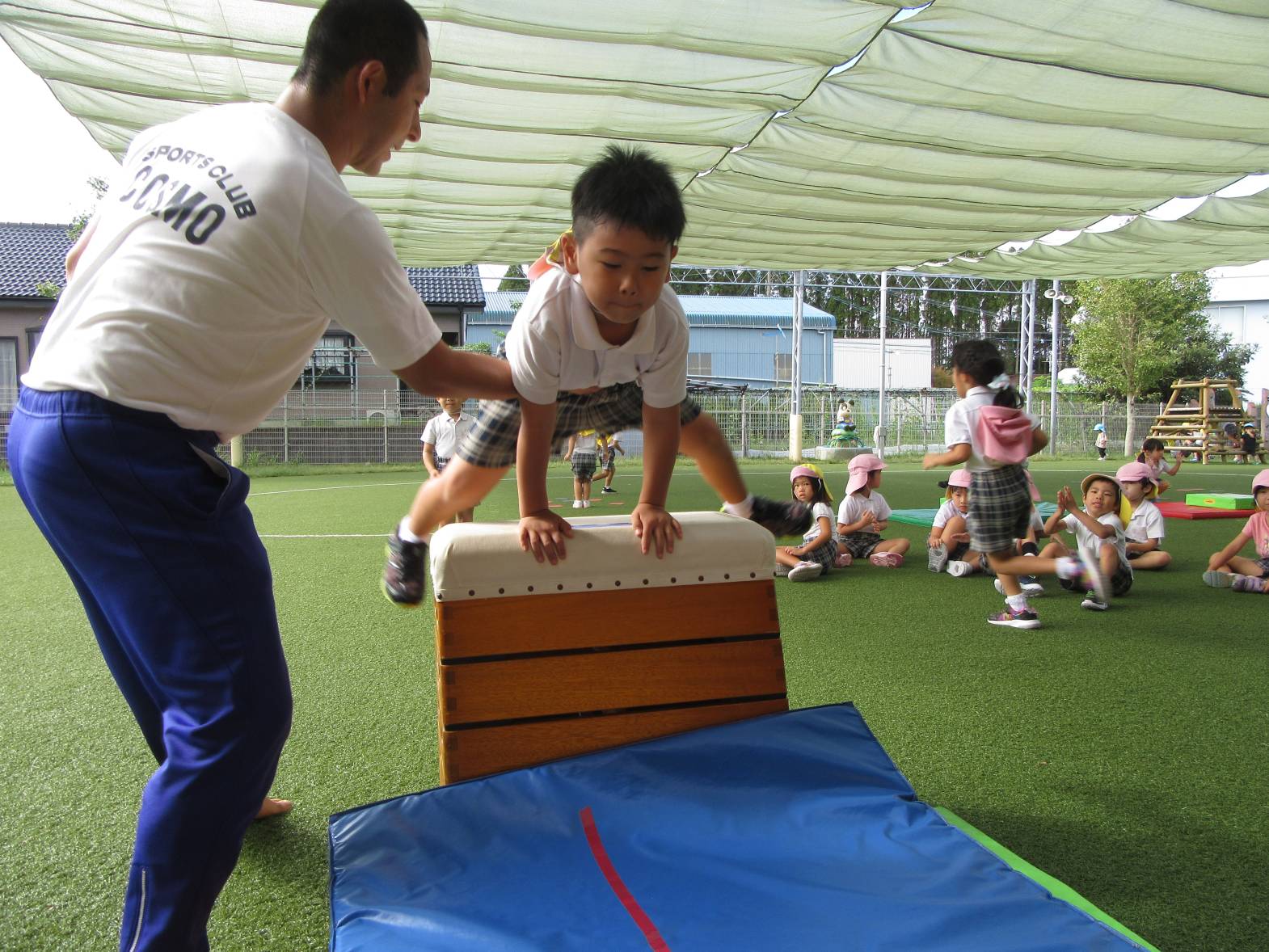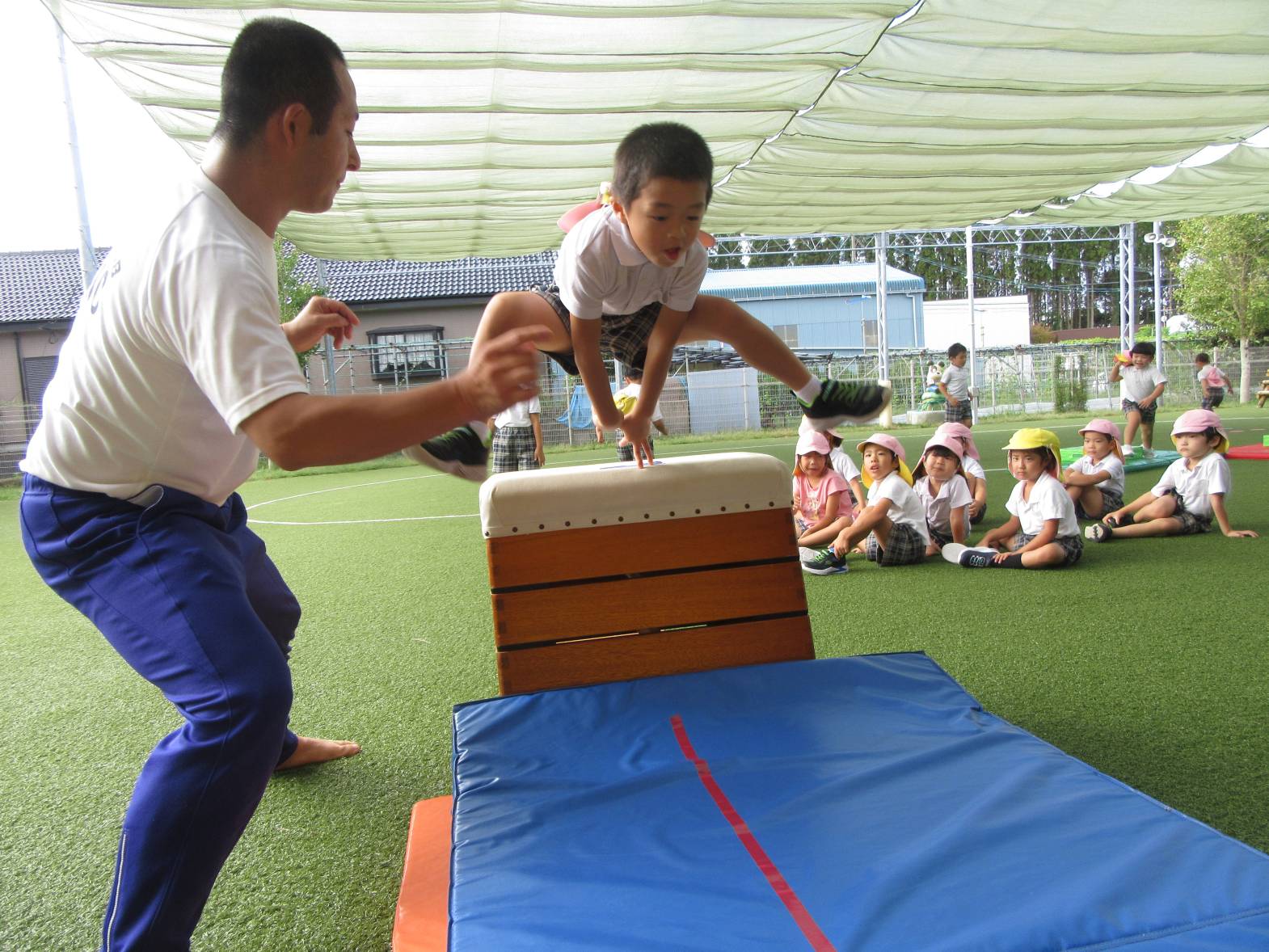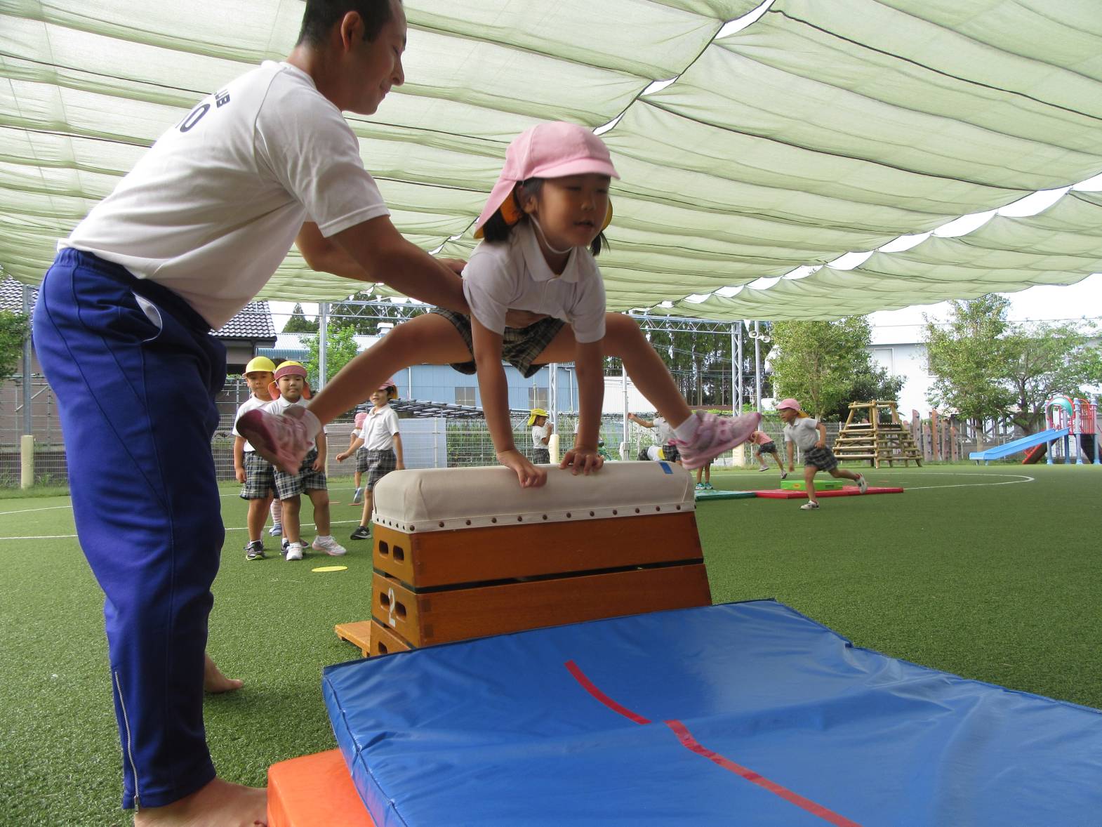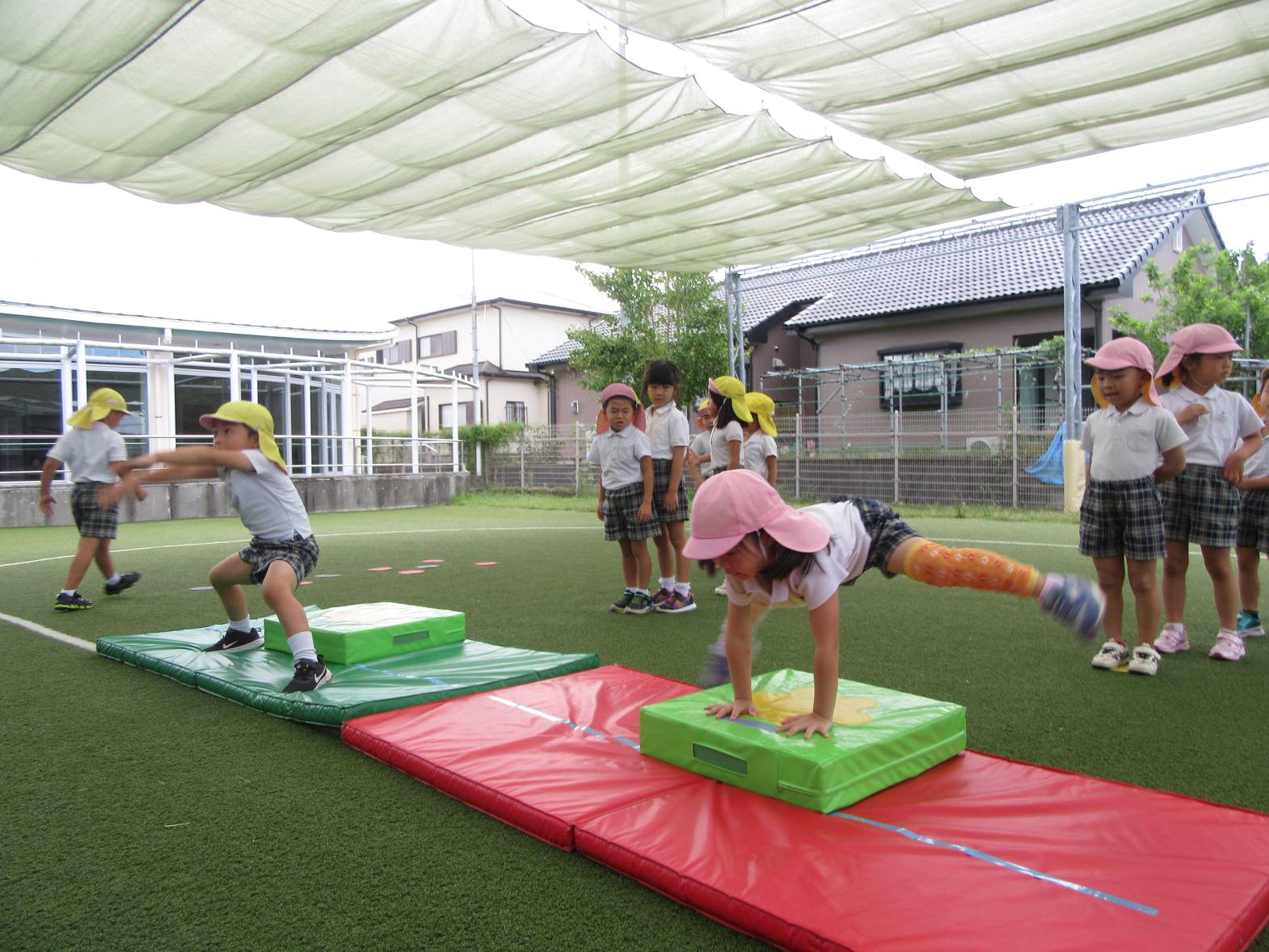 運動遊びでは、跳び箱に挑戦しています! まずはマットを使い、練習していく子どもたち。 跳ぶリズムをつかむと、跳び箱で跳んでみます! いざ跳び箱を目の前にすると、少し恐怖心があるようでしたが、何度も挑戦する姿が見られました。 「4段跳べるようになった!」、「5段も頑張る!」と意気込んでいるきりん組さんです!