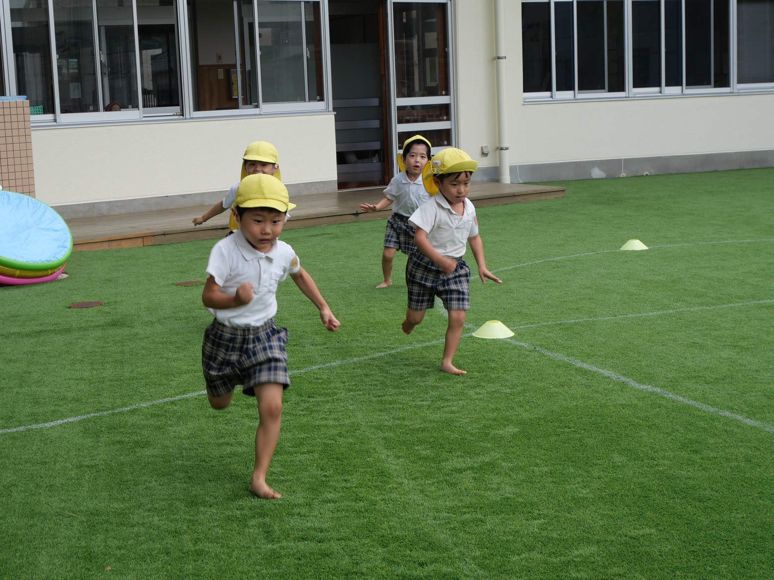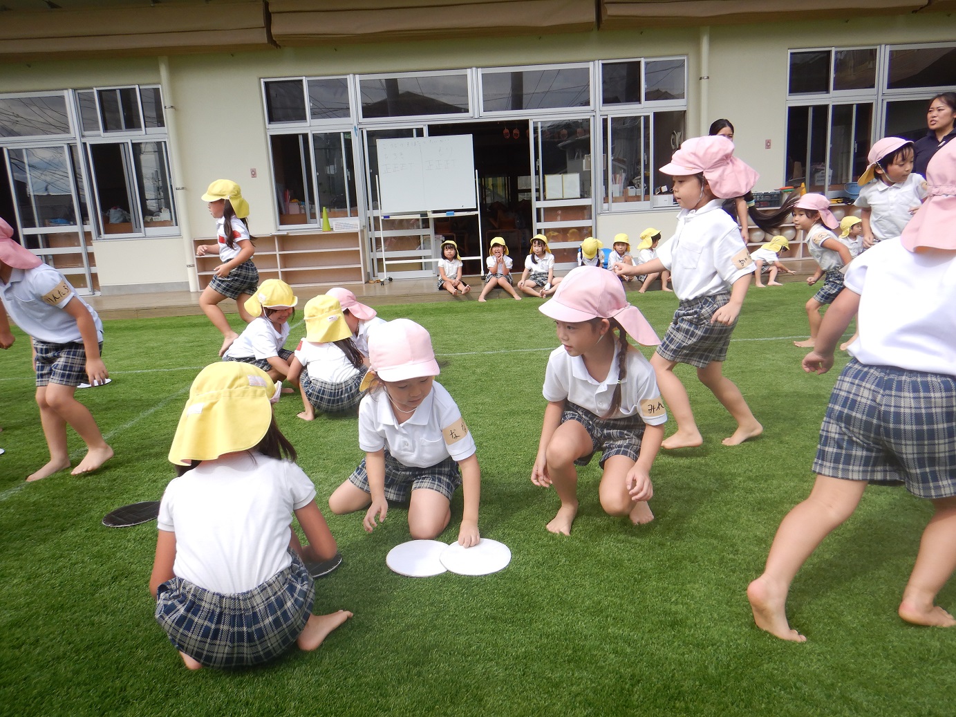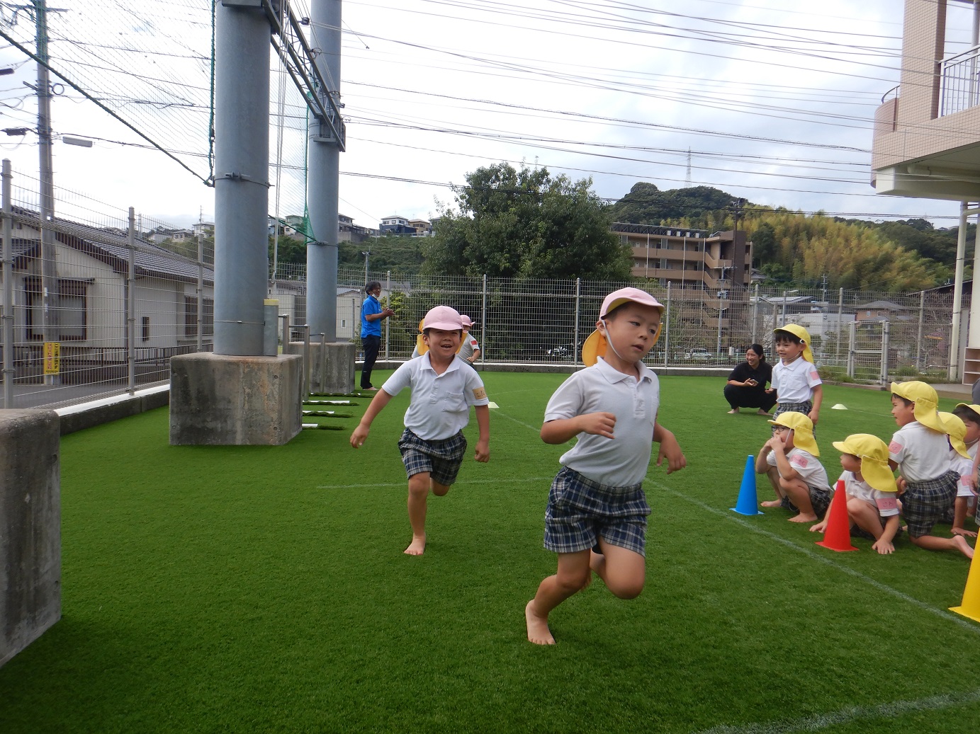 最初の競技『かけっこ』では、「○○ちゃん、頑張れー。」「よーし、負けないぞ!」と気合いを入れて走ったり、応援したりする姿が見られます。