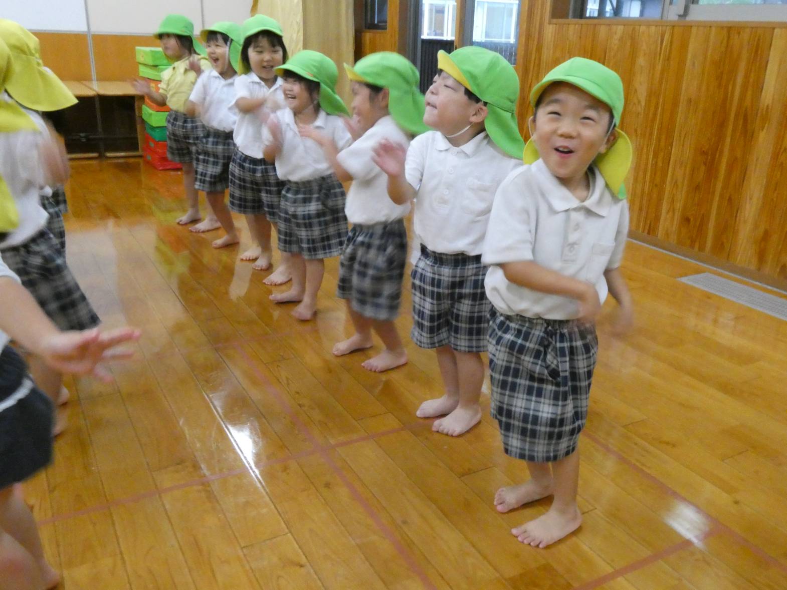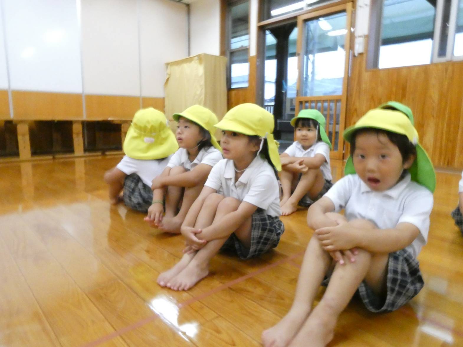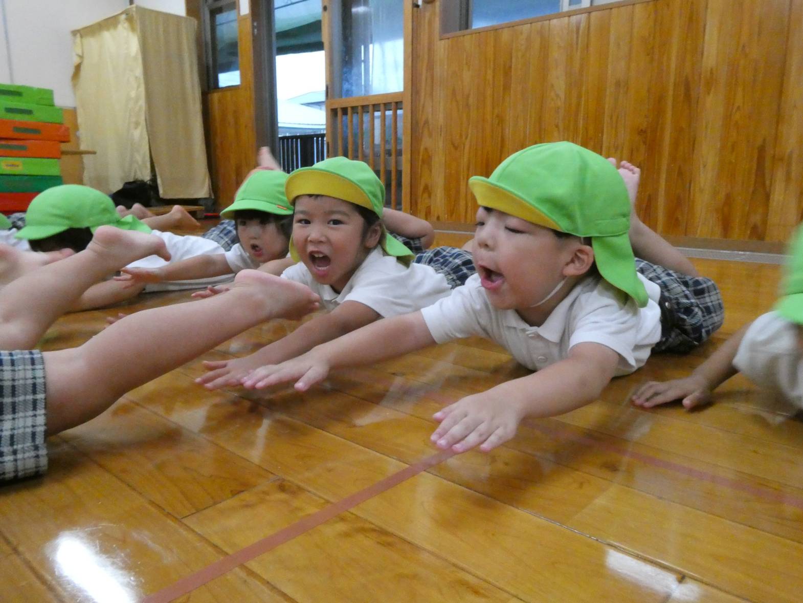 体を動かすことが大好きで、いつも運動遊びを楽しみにしているりす組さん。 大浦先生の話を聞きながら、一生懸命取り組んでいます。 上手くできないと、「できない。」と悔しがる様子もありますが、保育者と一緒に行いながら、色々なことに挑戦しています。 また、マットでは、前転や助走付き前転を練習しています。 「グー、手、くるん♪」等と、口ずさみながら、最後まで頑張る子どもたちでした♪