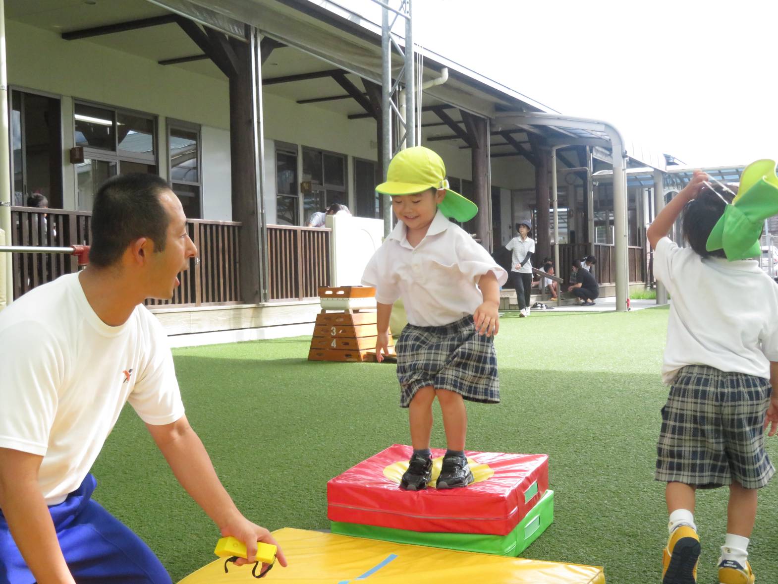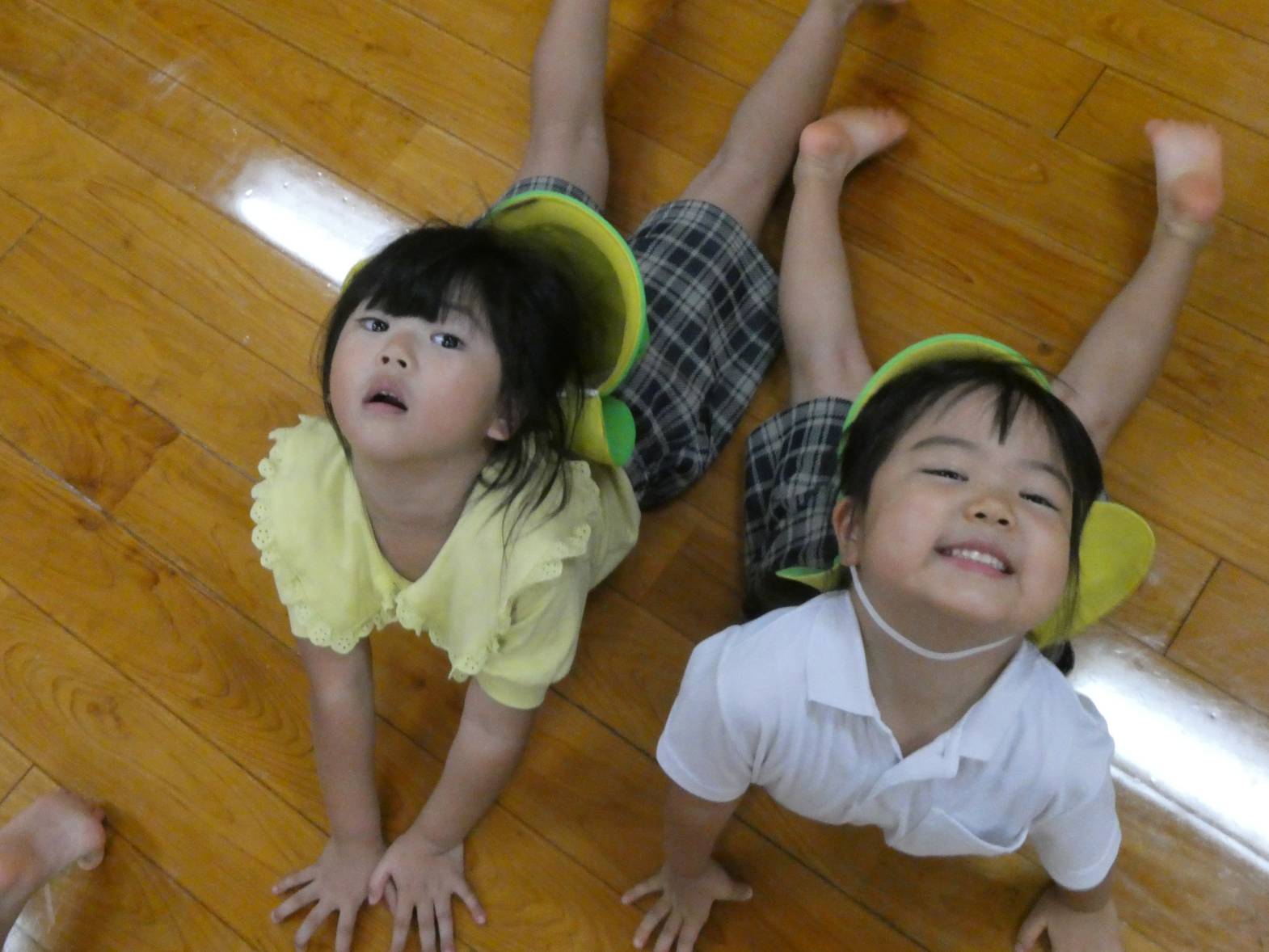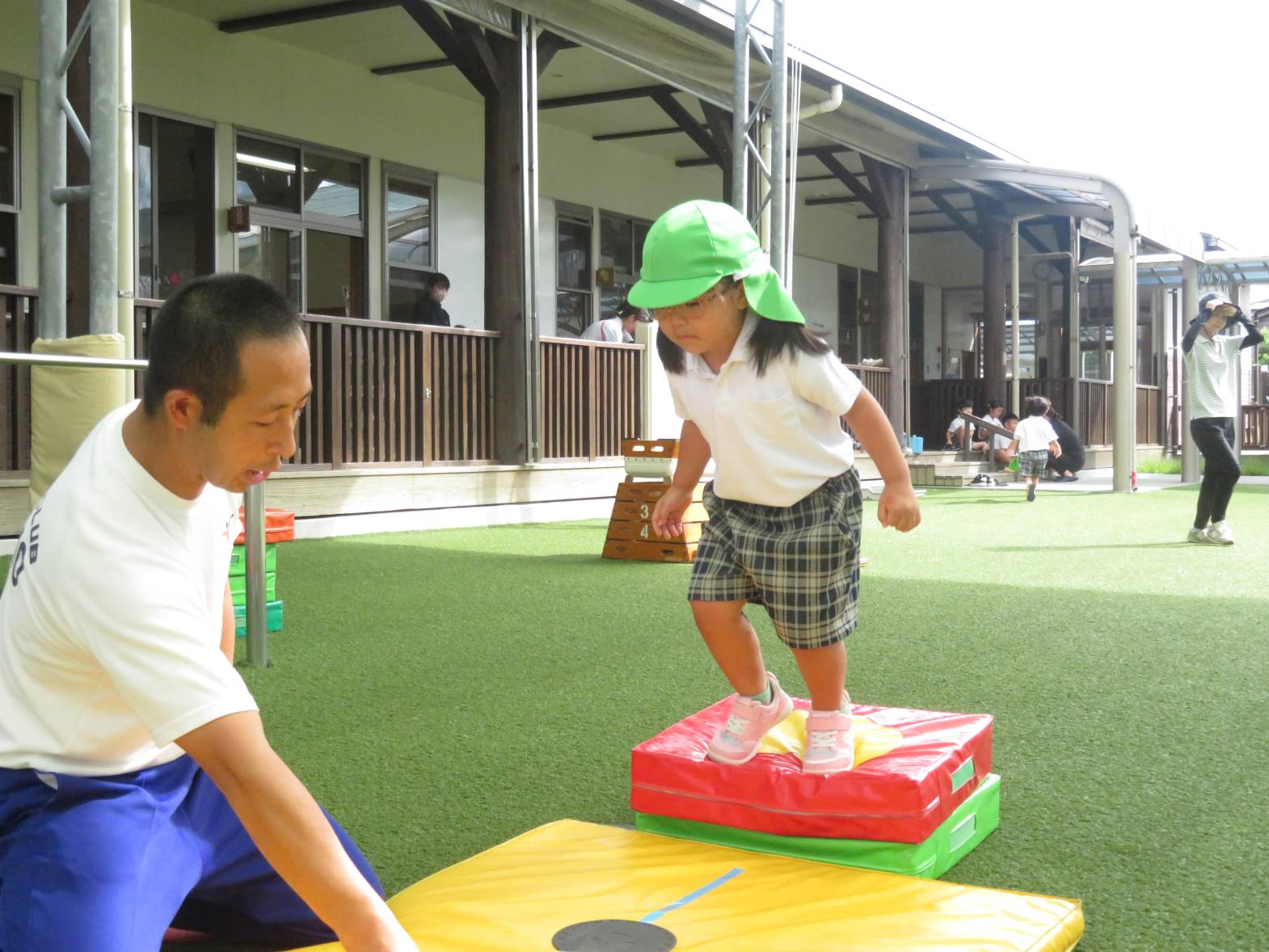 体を動かすことが大好きで、いつも運動遊びを楽しみにしているりす組さん。 大浦先生の話を聞きながら、一生懸命取り組んでいます。 上手くできないと、「できない。」と悔しがる様子もありますが、保育者と一緒に行いながら、色々なことに挑戦しています。 また、マットでは、前転や助走付き前転を練習しています。 「グー、手、くるん♪」等と、口ずさみながら、最後まで頑張る子どもたちでした♪