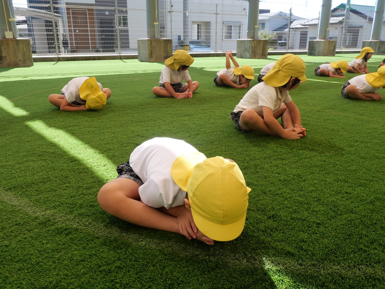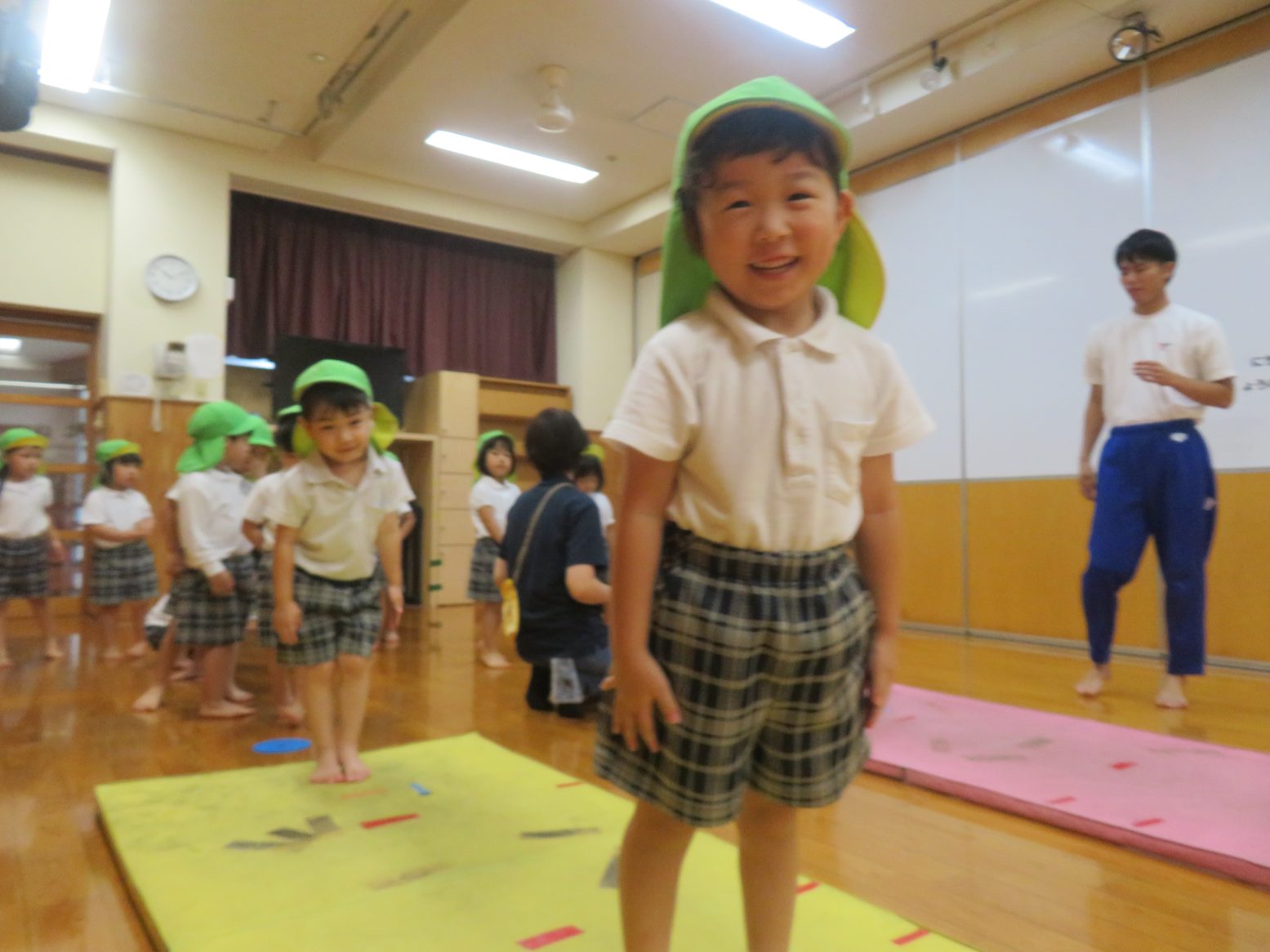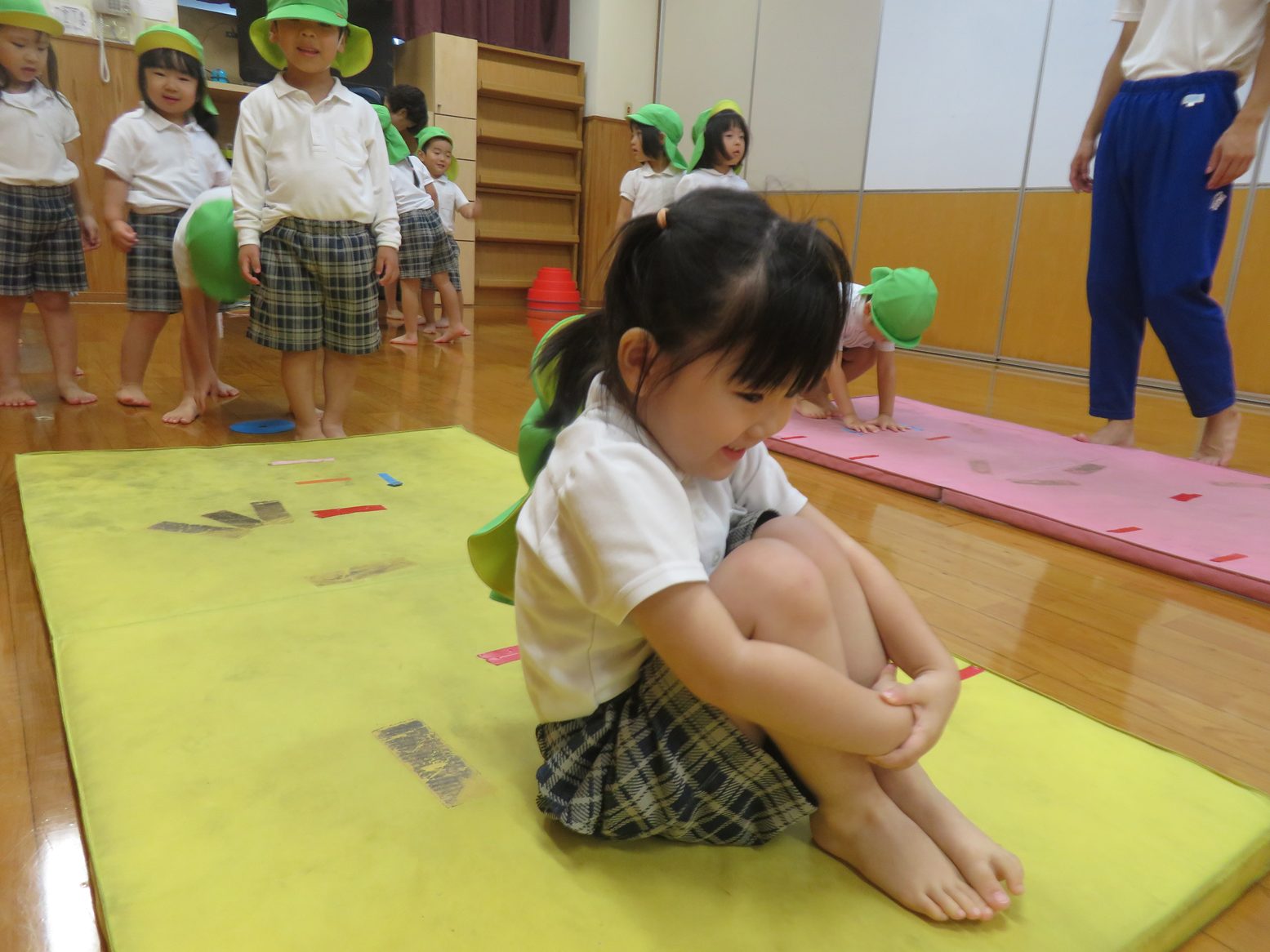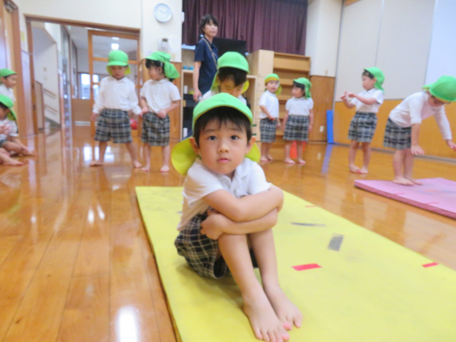 久しぶりの前転に、はじめはやり方や感覚を掴むのに一生懸命な姿も見られましたが、終盤は前転後の体操座りや背筋を伸ばして立つところまでかっこよくきめてくれた子どもたち。