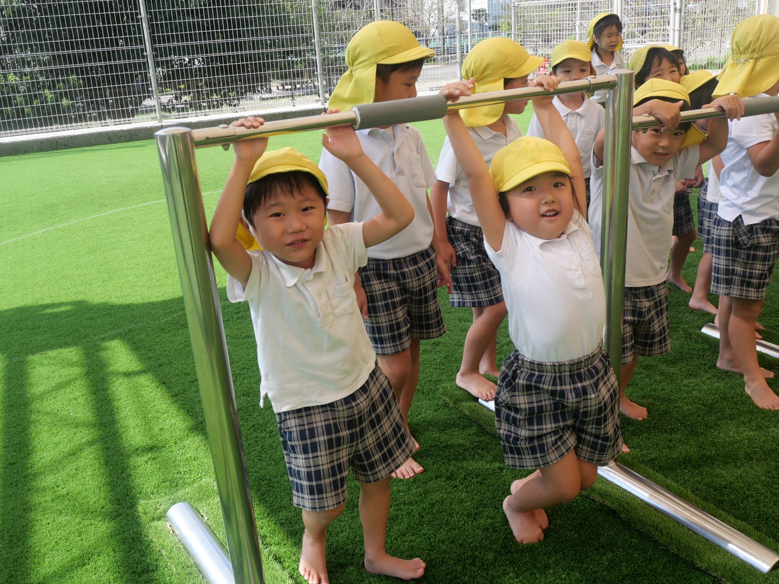 「何秒ぶら下がれるかな?」「○○ちゃん、競争しよう。」と、できるだけ長くぶら下がることができるように頑張っていた子どもたち。