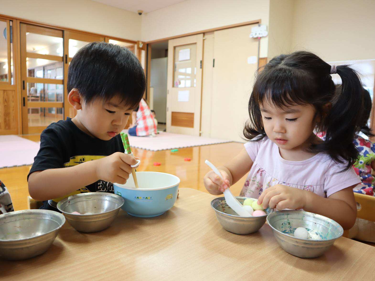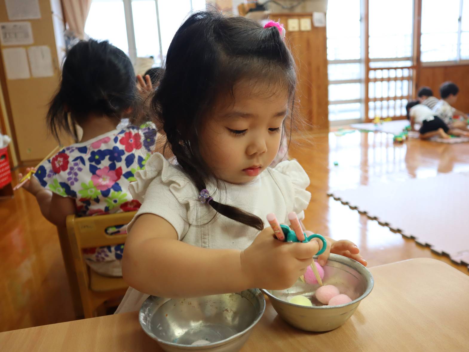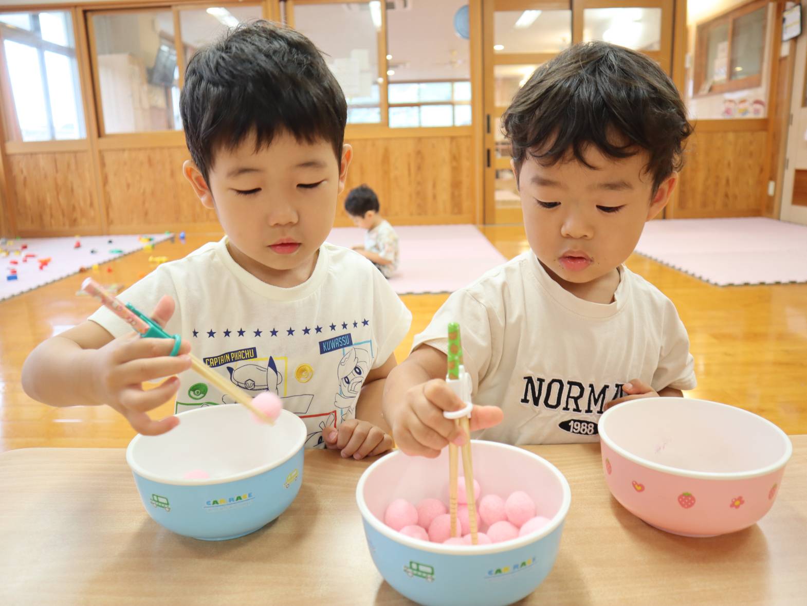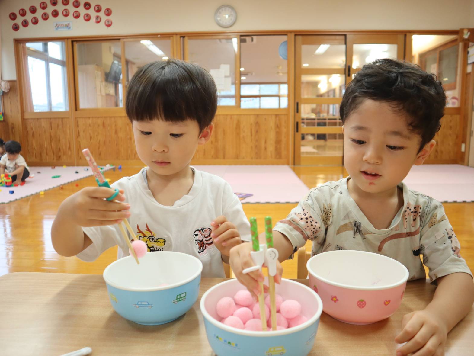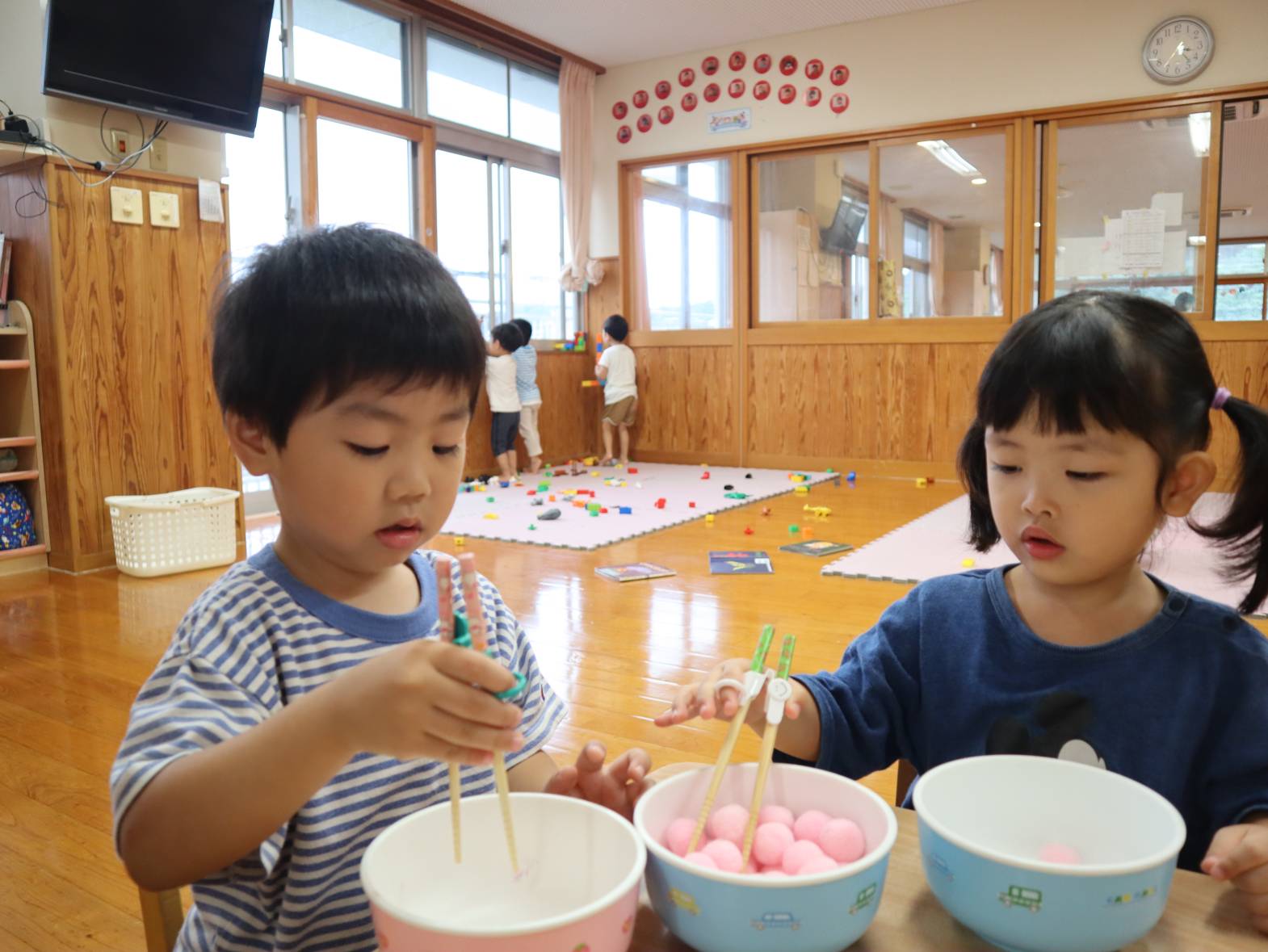 最近机で補助箸やスプーンを使ってポンポン運びを楽しむぱんだ組さん。 箸の持ち方を意識しながら、慎重に器に移していきます。 「ちょっと難しいなぁ…」「できたよ!」と一生懸命取り組む子どもたち。 机上で集中したり、箸の持ち方を意識したりすることができるよう、今後も箸を用いた遊びを取り入れていこうと思います。 ご家庭でも食事の際に徐々に補助箸の使用も視野に入れてみてください。 何か箸についてご質問等ありましたら、お気軽にお声掛け下さいね。