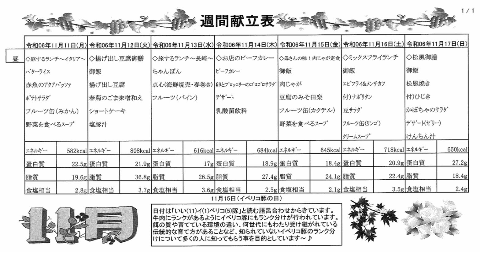 11月11日(月)~11月17日(日)の献立表になります。ぜひご覧ください。