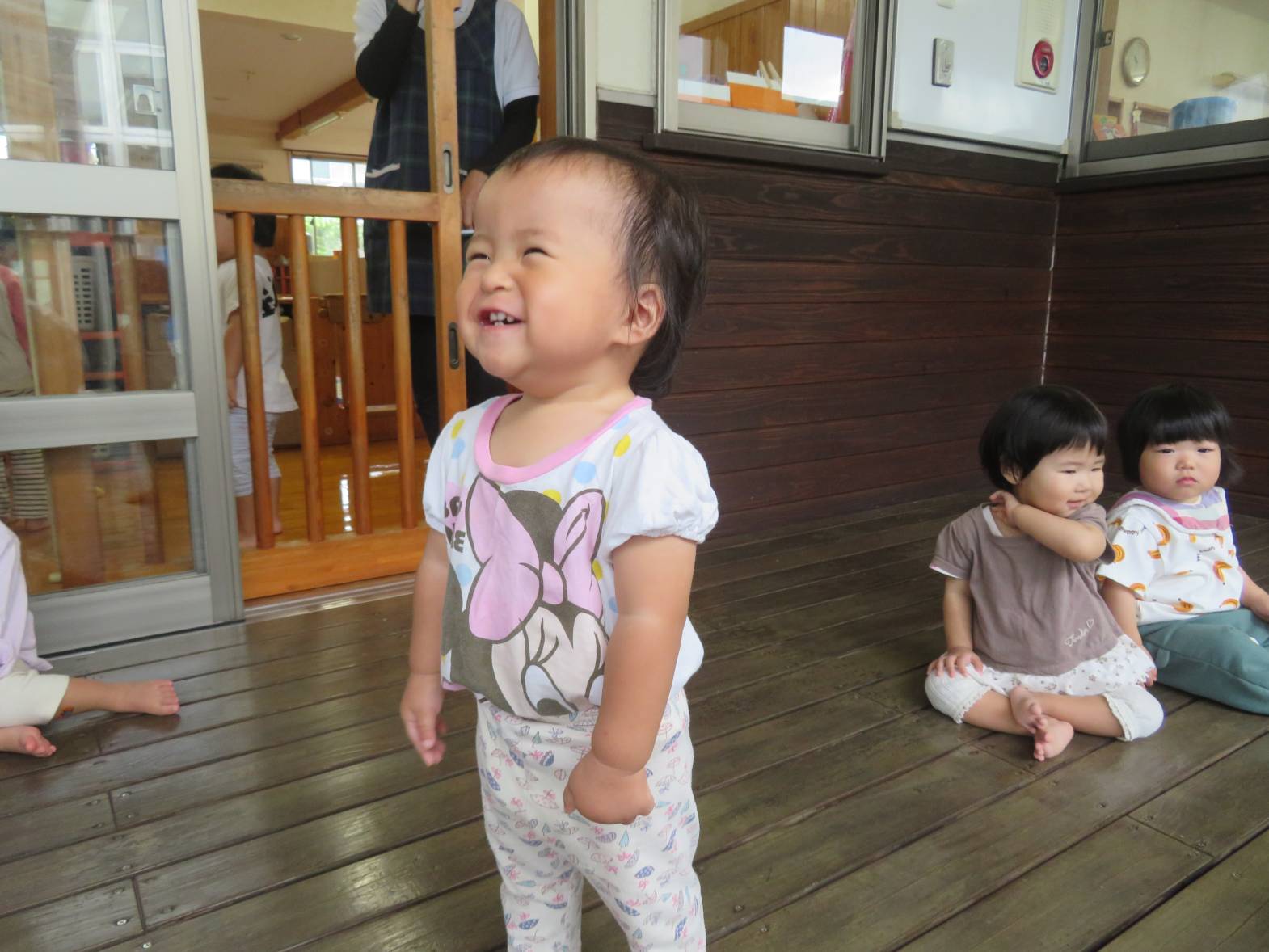 テラスに出てシャボン玉を吹くと「きゃー!!」と喜んでくれます。