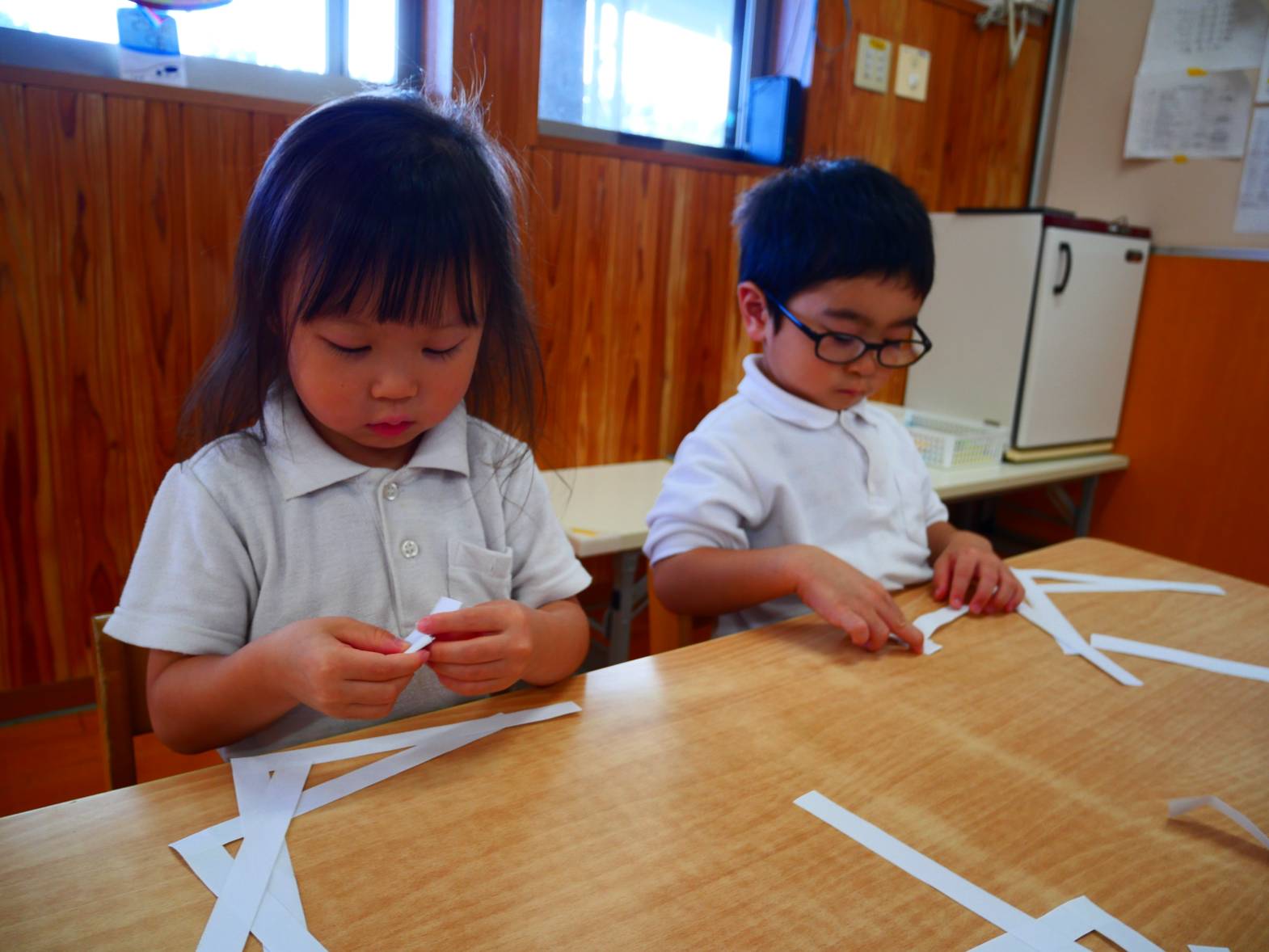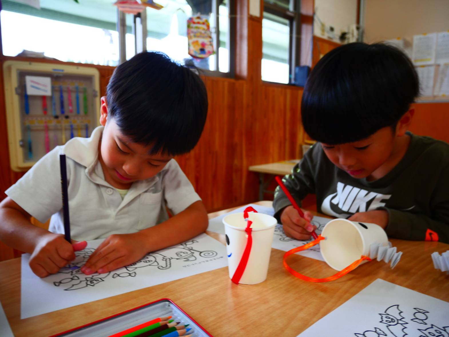そこでハロウィンのバック作りをしました。まずは、紙コップに自分で紙を折り、手や足を作っていきます。次にシールやペンを使って顔を描きました。