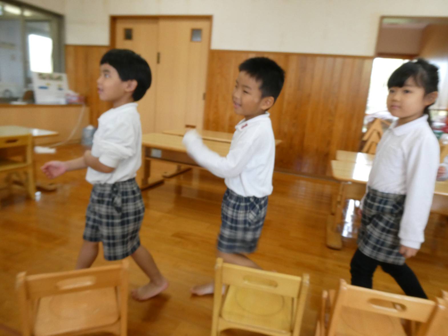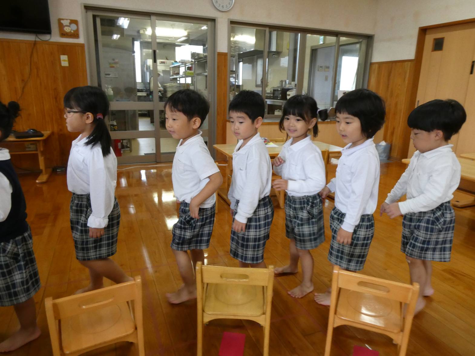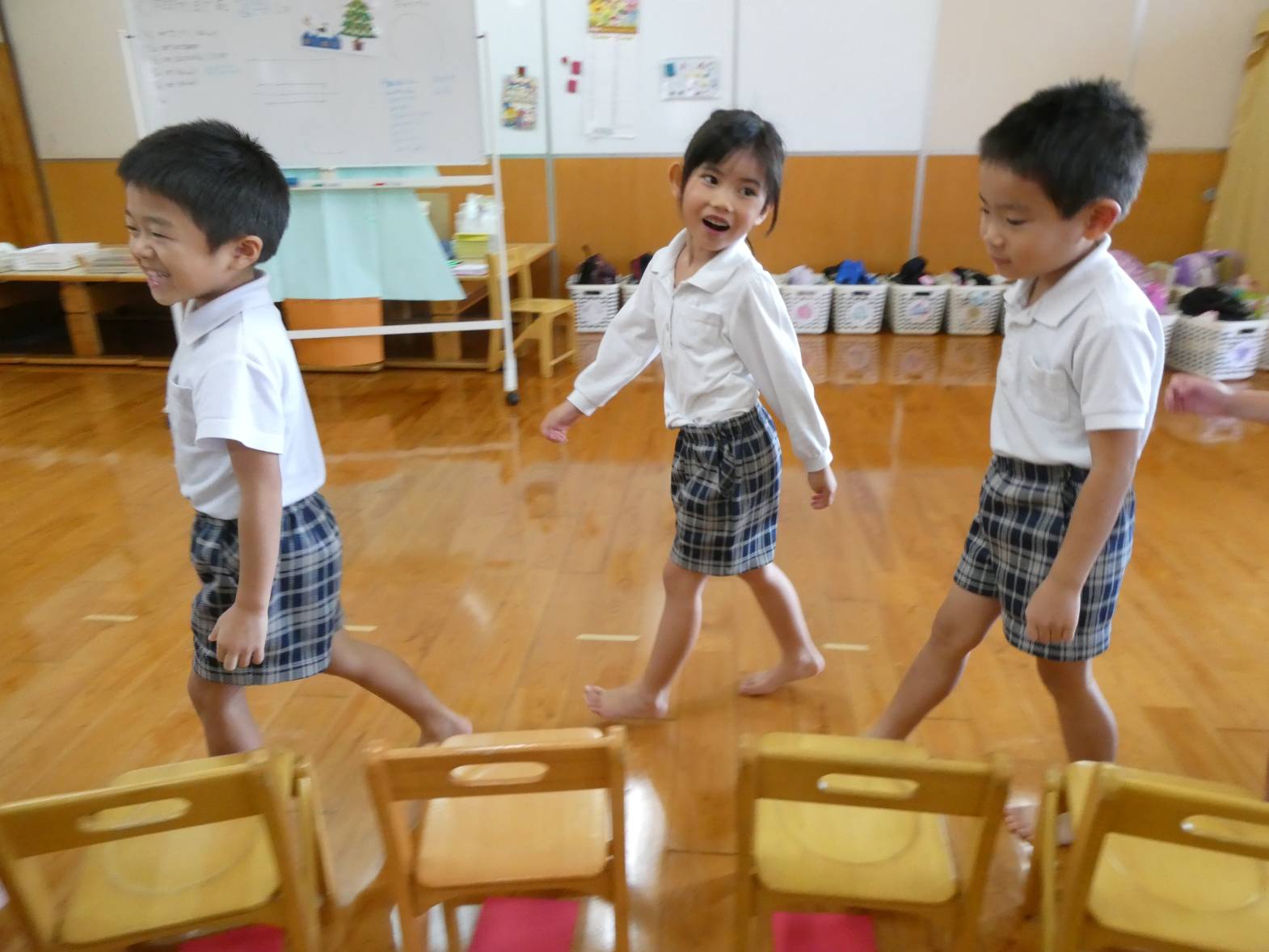 今日は12月7日(土)にあるクリスマス会の保護者席を決めるくじ引きを行いました。 音楽が流れると、わくわくしながら歩き出す子どもたち。 音楽が止まると、椅子に座ります。 座った椅子の下に置いてある番号札が席順になります。 椅子の下にある紙を開いて、「僕○番だったよ!」、「私は、○番だから○○ちゃんと近いね~!」と、嬉しそうに見せ合う子どもたちでした。 クリスマス会の座席は、決まり次第お伝えします!