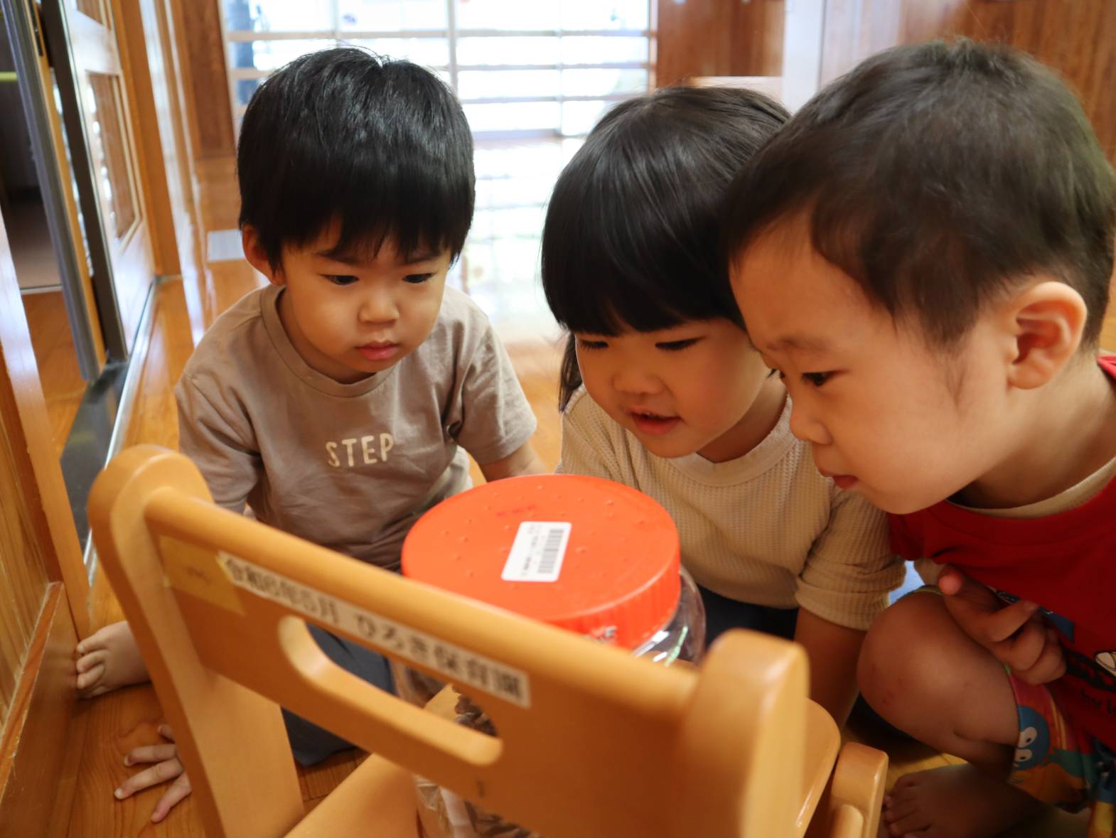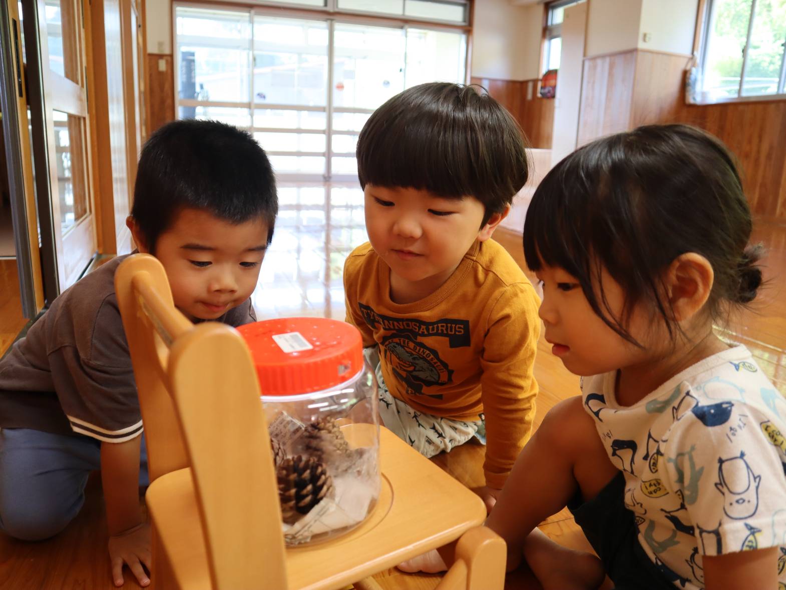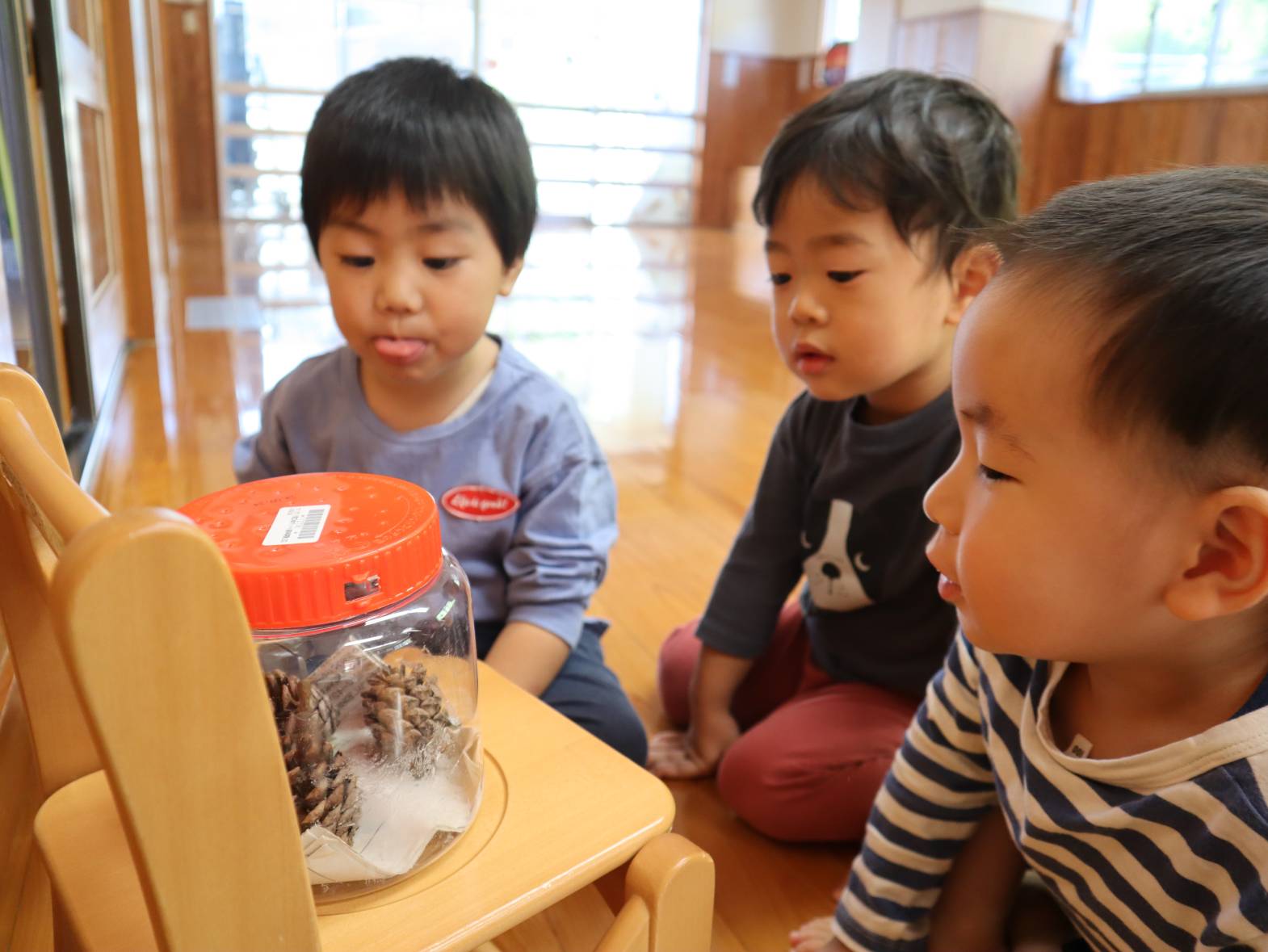 先日滑り台の上にヤモリを見つけたぱんだ組さん。 ぱんだ組の部屋で飼うことに! みんなで『あいちゃん』と言う名前を付けました。 「あいちゃんいる?」「あいちゃん見たい!」と毎日あいちゃんを気にする子どもたち。 観察すると「色が変わってない?」「ご飯食べるかな?」と新しい友だちに興味津々です。 ぜひご家庭でもあいちゃんの話を聞かれてみてください。