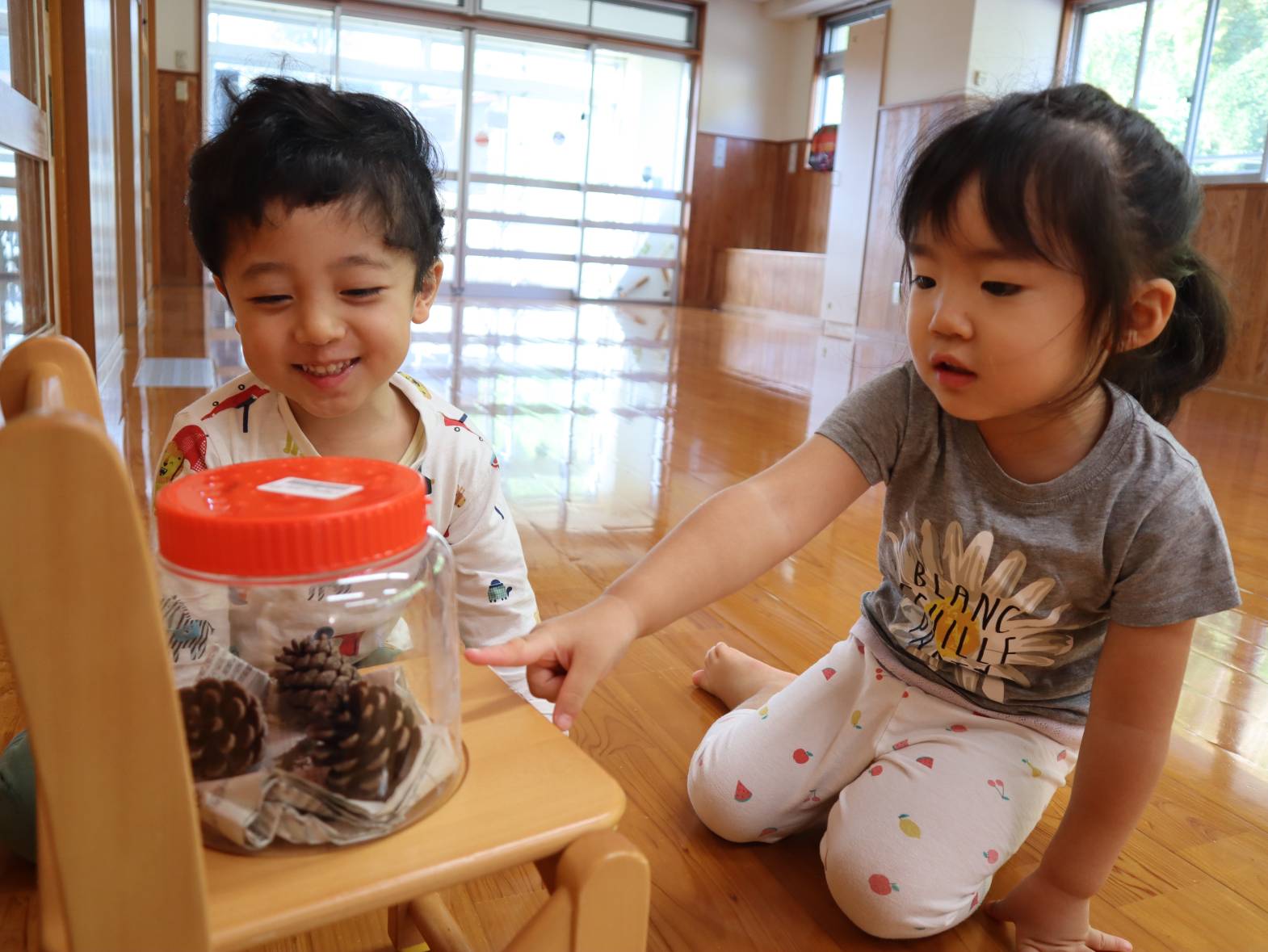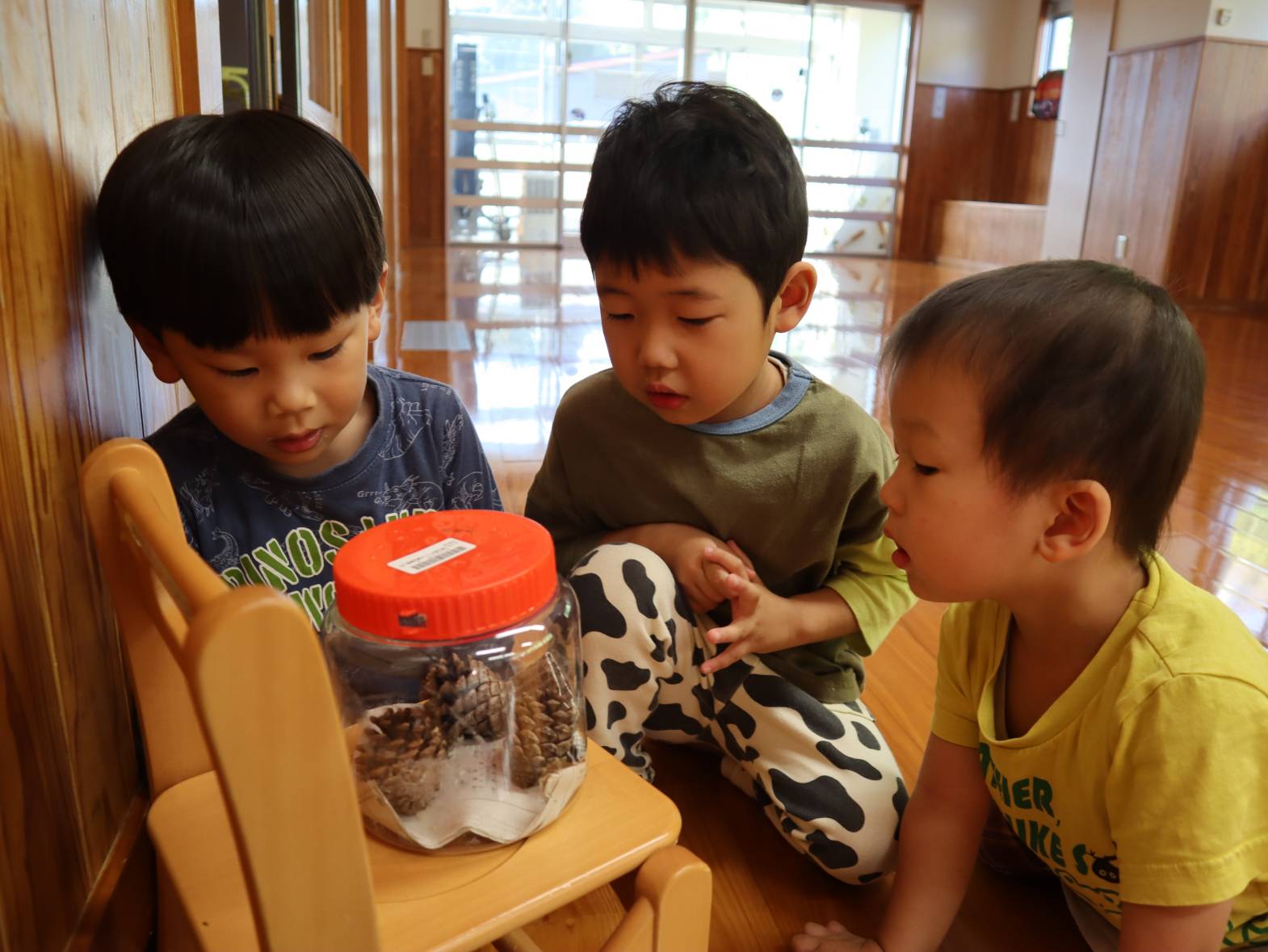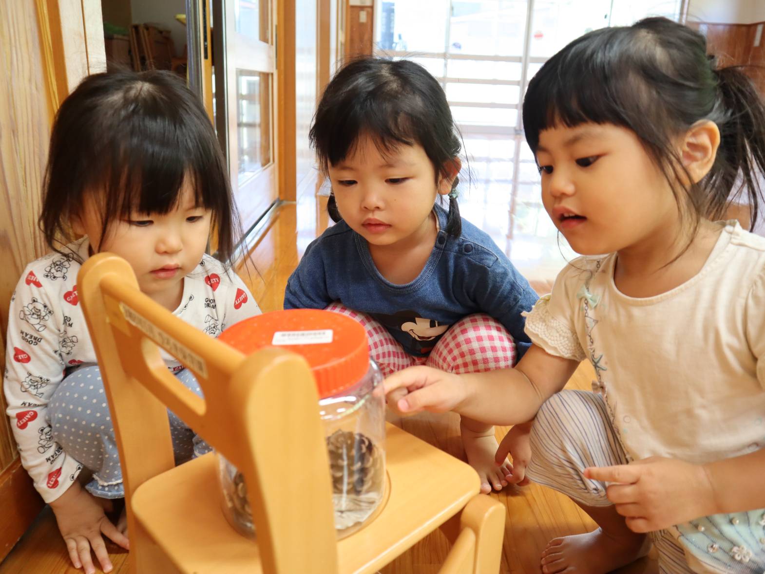 先日滑り台の上にヤモリを見つけたぱんだ組さん。 ぱんだ組の部屋で飼うことに! みんなで『あいちゃん』と言う名前を付けました。 「あいちゃんいる?」「あいちゃん見たい!」と毎日あいちゃんを気にする子どもたち。 観察すると「色が変わってない?」「ご飯食べるかな?」と新しい友だちに興味津々です。 ぜひご家庭でもあいちゃんの話を聞かれてみてください。