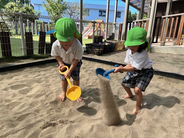 砂の感触を味わい、道具の使い方を知ることを目的に、砂遊びを行いました。 今回はいつもより大きなスコップを使うことに驚きながらも、職員と一緒にスコップの使い方を練習しました。 慣れてくると、足を踏ん張って、深く掘ることができるようになり、 お友だちと一緒に大きな砂のお山を作ることにも挑戦しました! 大きなお山ができると、「完成~!」とお友だちと笑顔でハイタッチをして 達成感を味わうくまグループさんでした☆