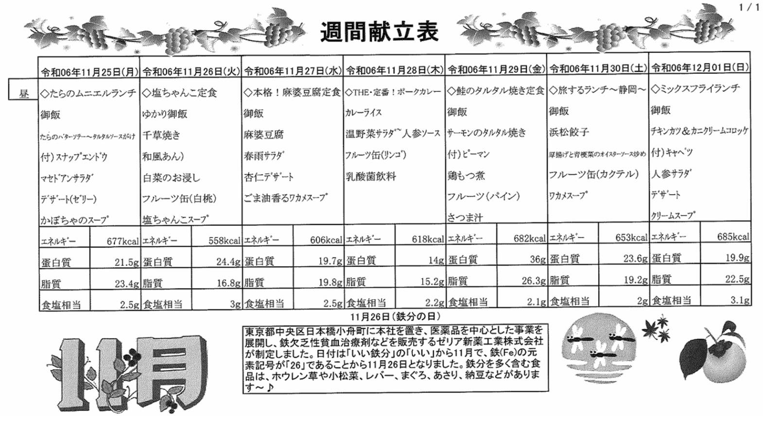 11月25日(月)~12月1日(日)の献立表になります。ぜひご覧ください。