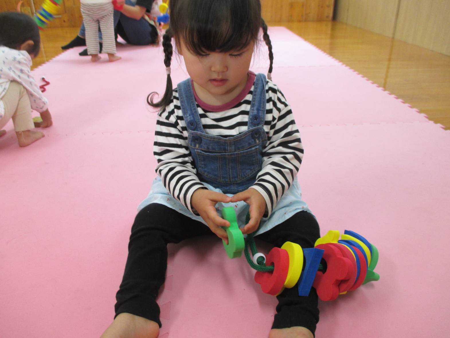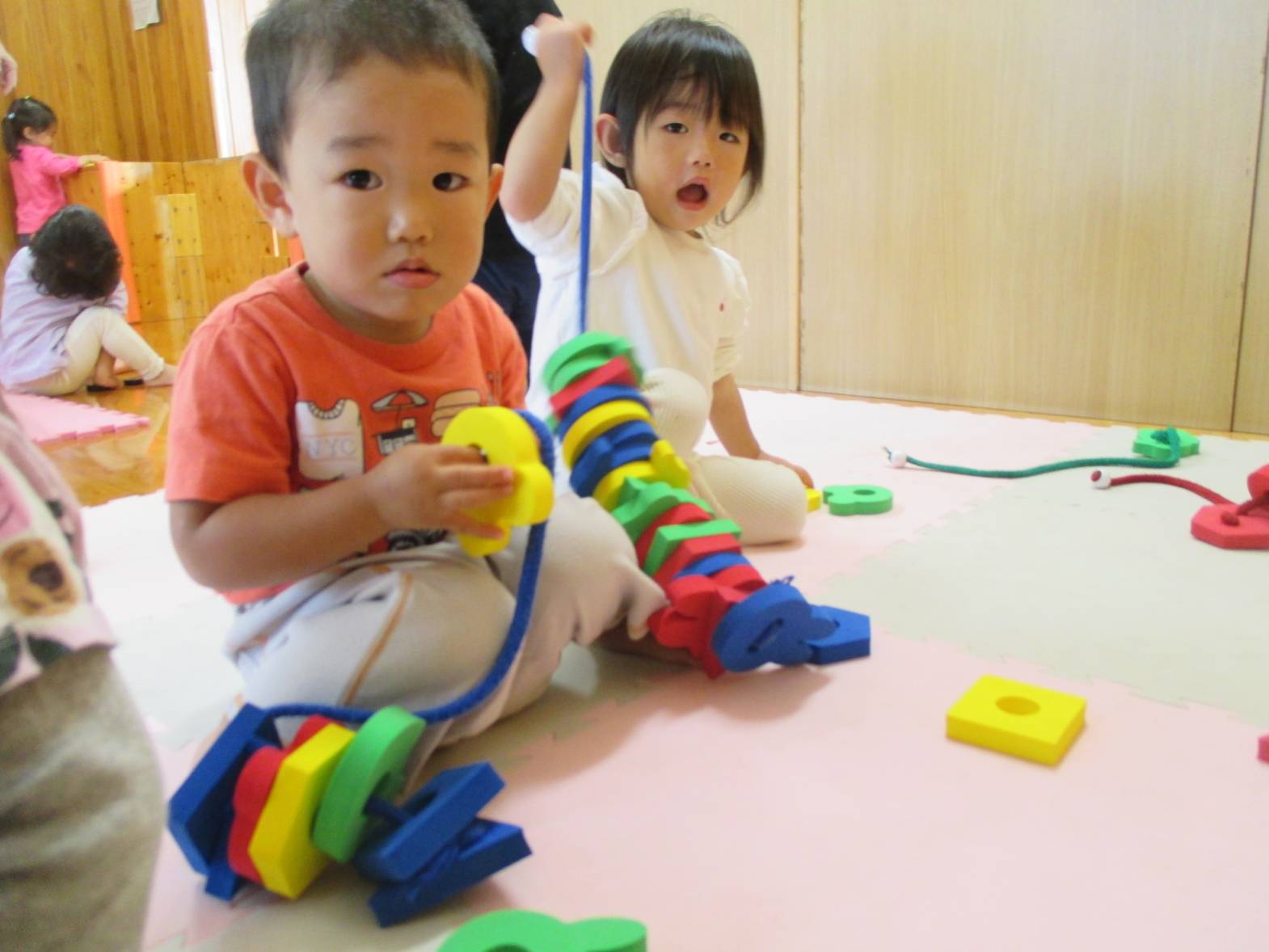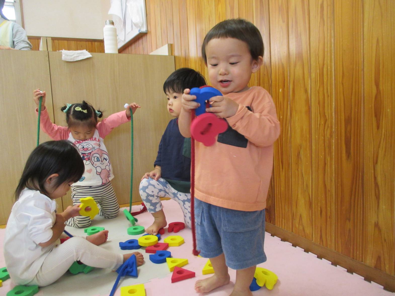 最近ひも通しの玩具に夢中のこあらぐみさん。 同じ形を集めたり、色を全部揃えたり、カラフルにしたり... と遊び方も様々で見ていてとてもおもしろいです!! 真剣な表情で遊んでいます。 「せんせいできたよ~」と嬉しそうに見せにきてくれる子どもたちです!