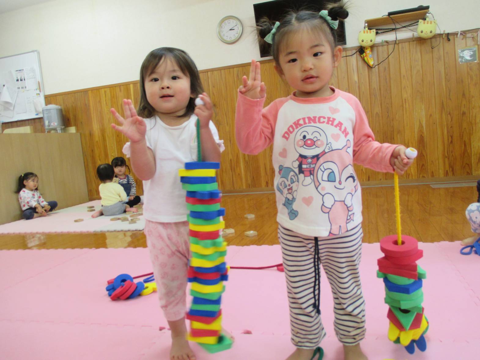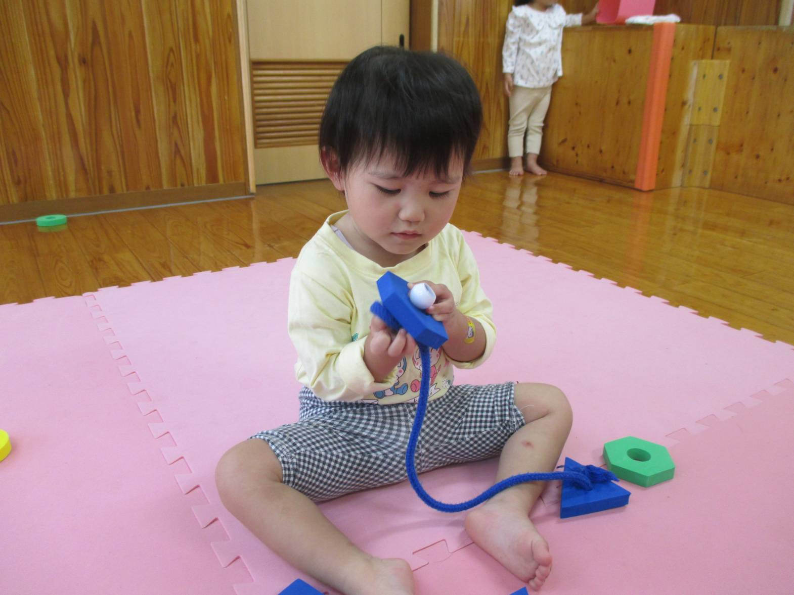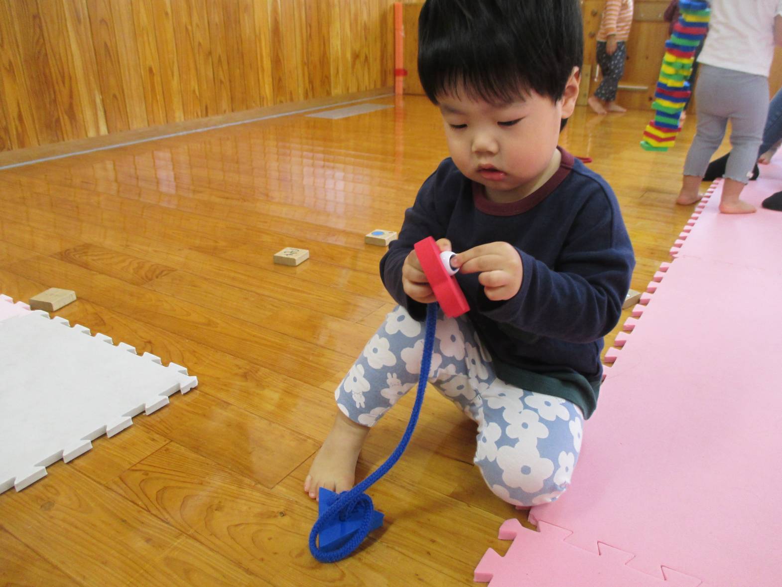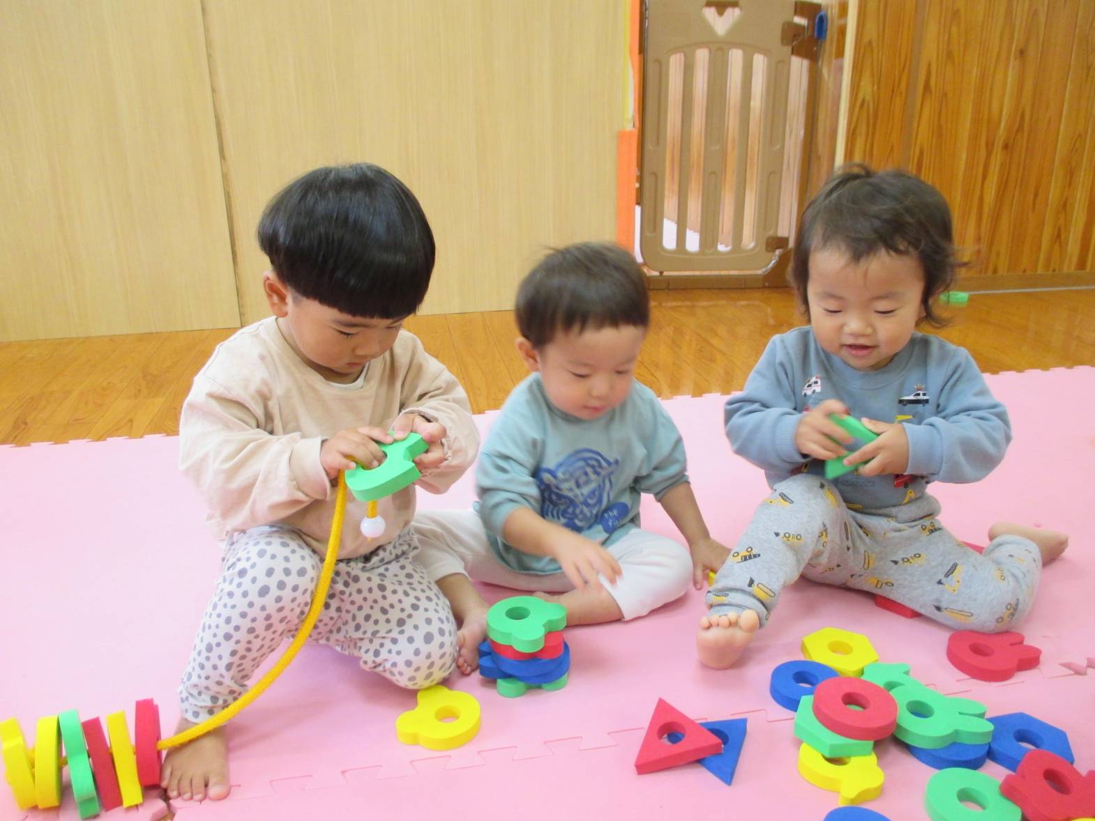 最近ひも通しの玩具に夢中のこあらぐみさん。 同じ形を集めたり、色を全部揃えたり、カラフルにしたり... と遊び方も様々で見ていてとてもおもしろいです!! 真剣な表情で遊んでいます。 「せんせいできたよ~」と嬉しそうに見せにきてくれる子どもたちです!