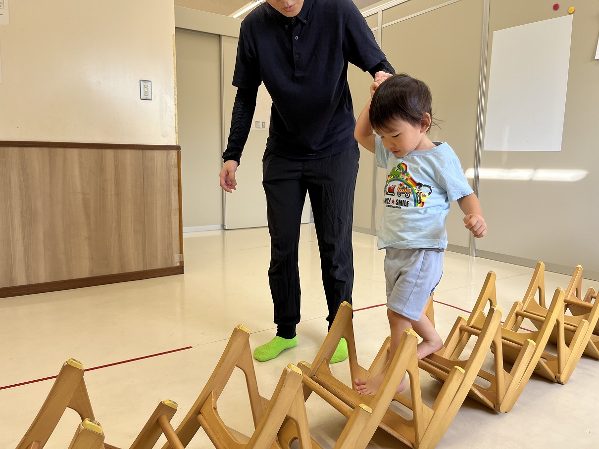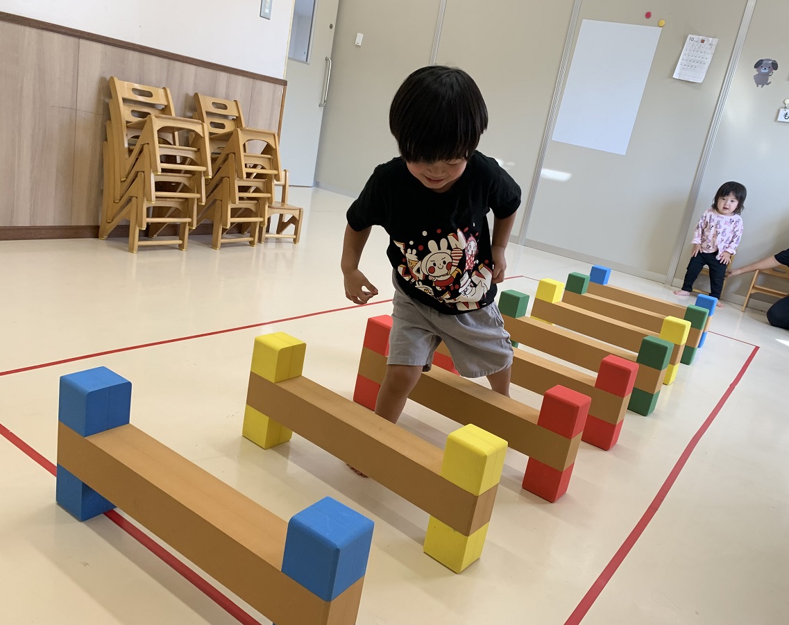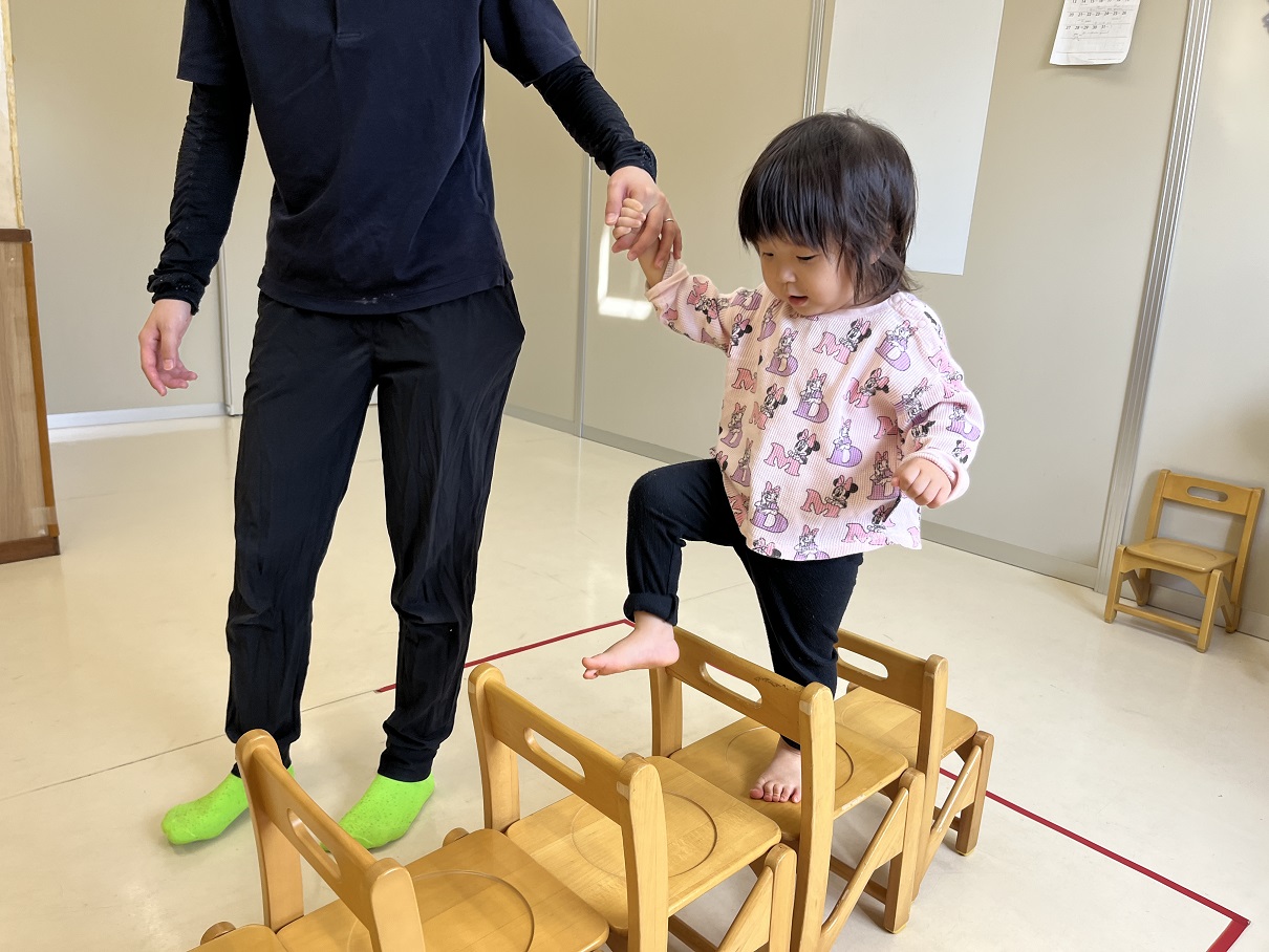 運動遊びでまたぐ活動を行いました。 並べてあるハードルの上をまたいで渡っていきます。 足を上げて、慎重に・・・ 最後は、椅子の上を渡ることにも挑戦しました。 足元を確認しながら、渡ることができた子どもたちでした!