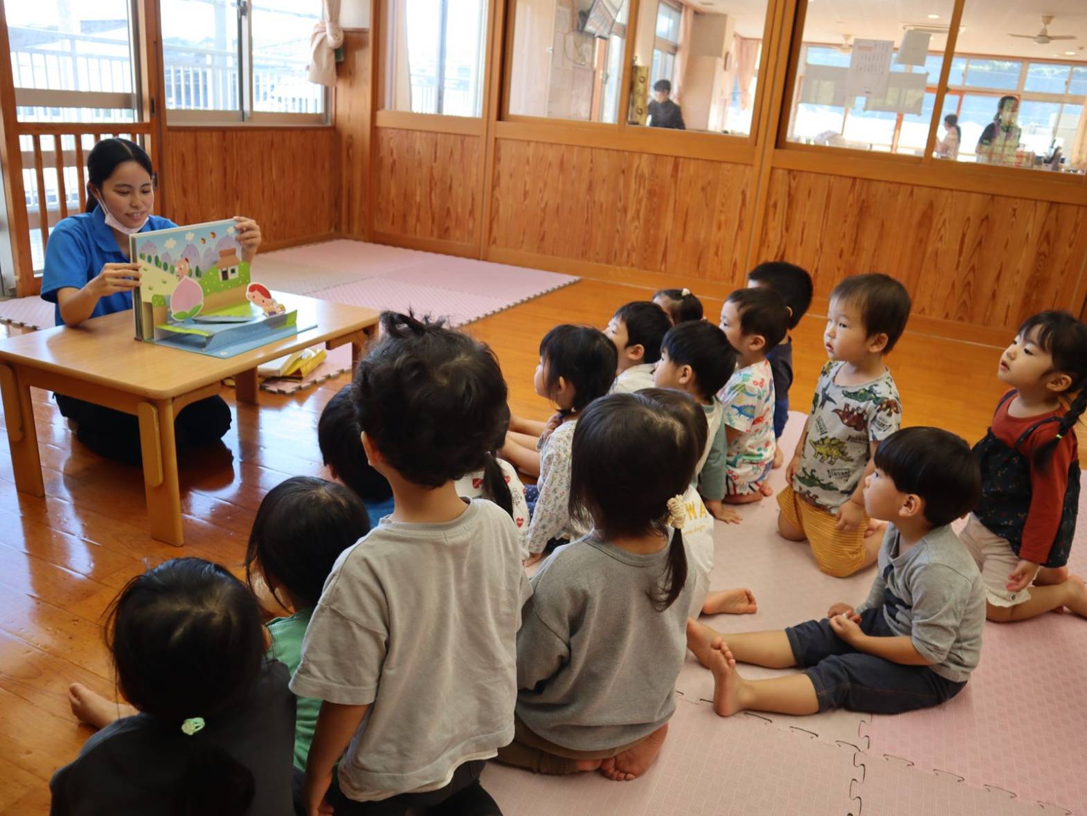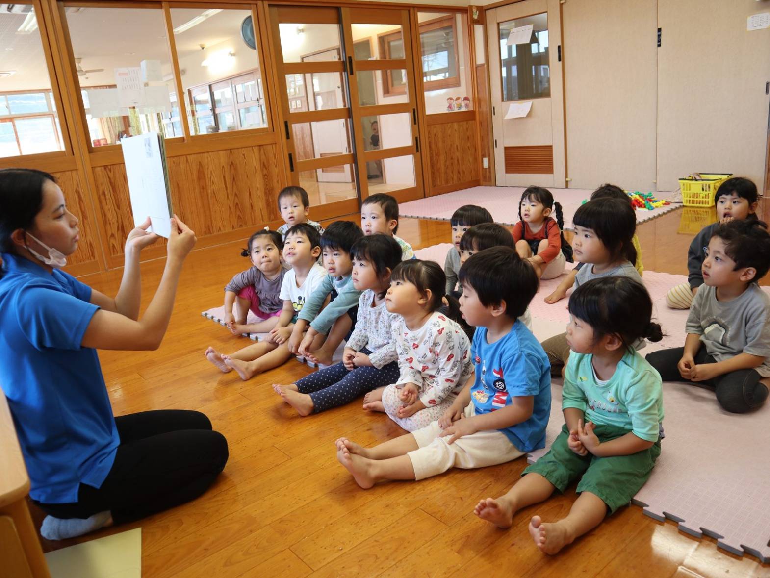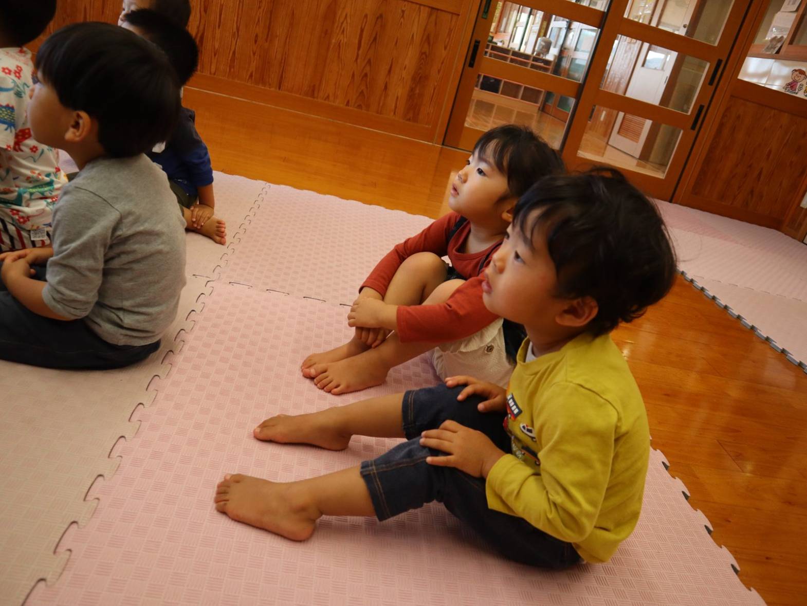 先日、ぱんだ組に向けてお話会を行いました。 「何するの?」、「大きい絵本があるね。」とわくわくした様子の子どもたち。 普段絵本の読み聞かせは毎日行っていますが、大型の仕掛け絵本などはあまり見る機会がないので、興味深々の様子です! 3つのお話を、かっこよく体操座りで真剣に聞くことができました。 「楽しかった!」、「またお話会したいな。」と大満足のぱんだ組さんでした。
