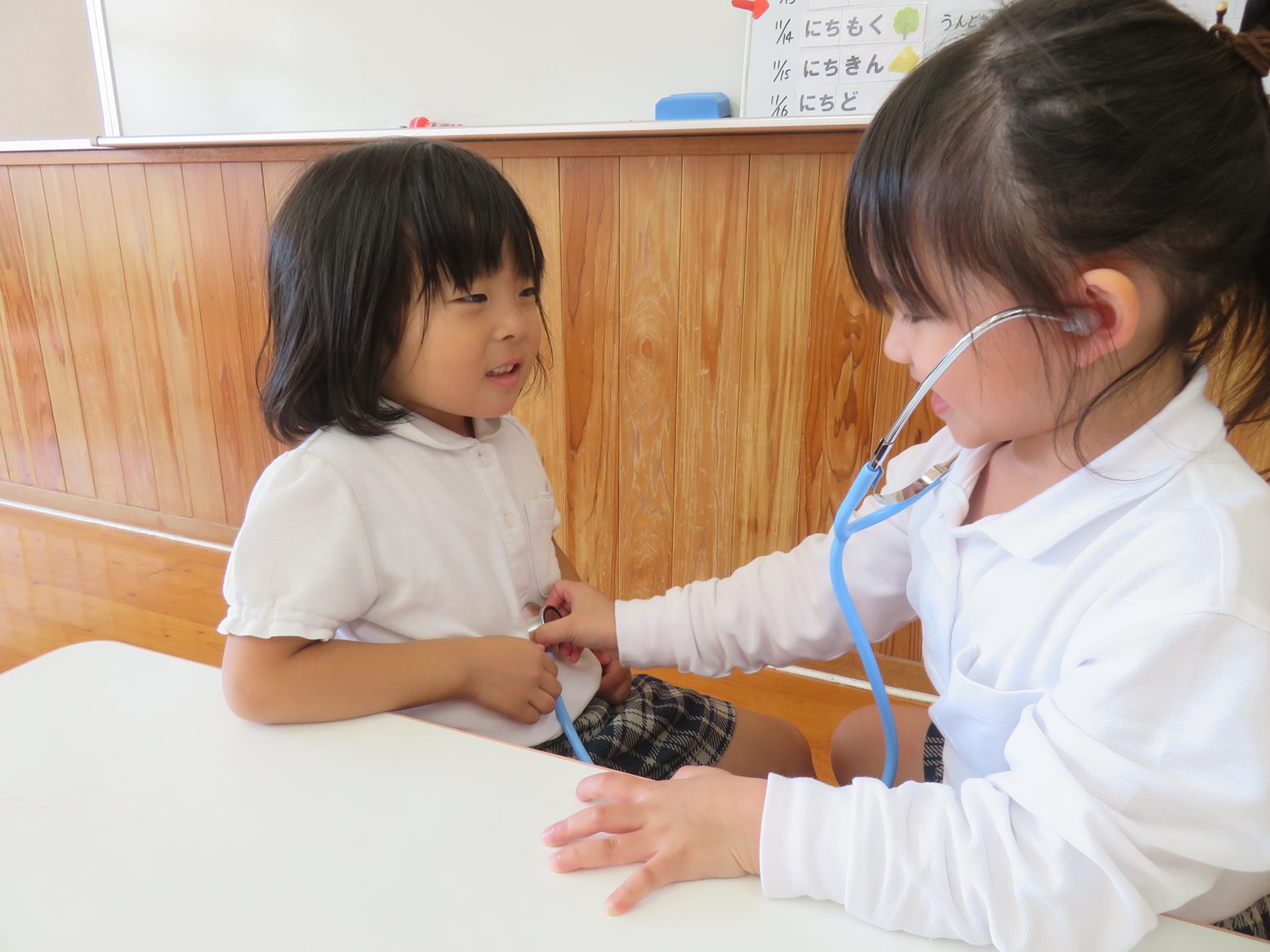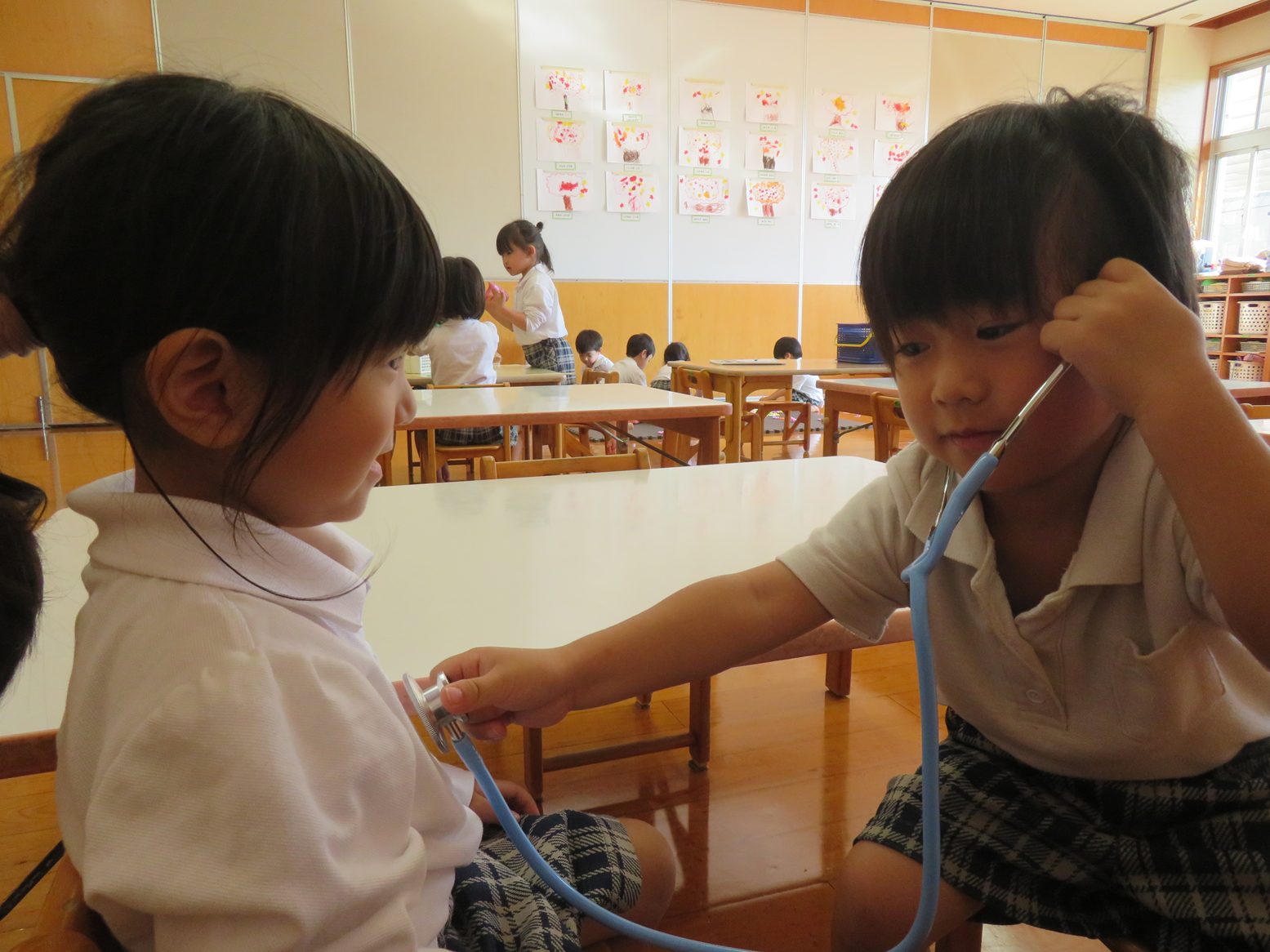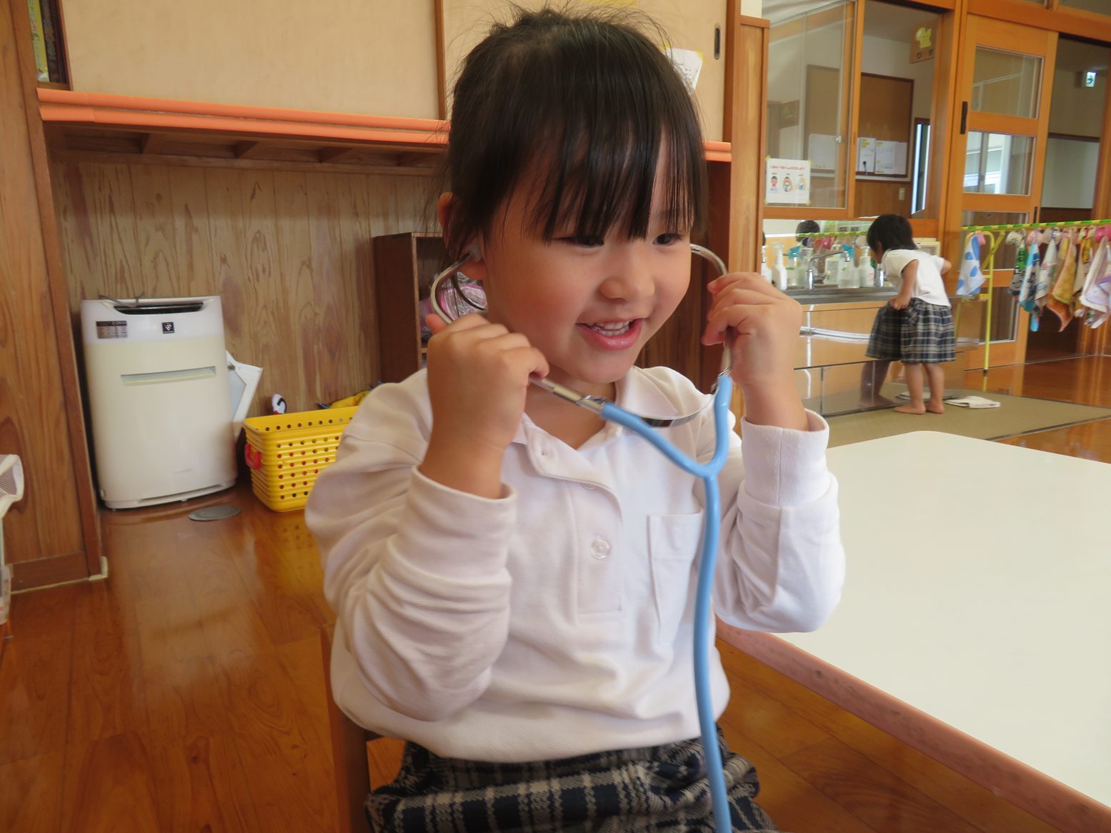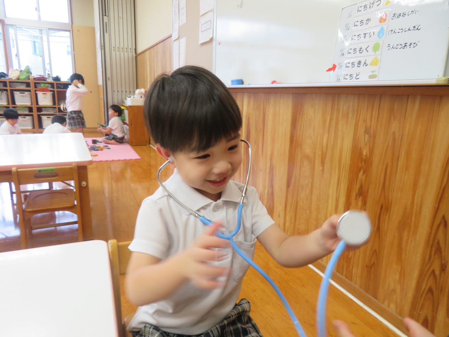 今週は健康診断があり、りす組では同時にお医者さんごっこがスタートしました。 聴診器を耳に付け「もしもししまーす。」と友だちのお腹や胸に当てていきます。 「んー音が聴こえないな。」、「がさがさ音がした。」、「ドクドクいってる!」と友だちの心音や聴診器から聞こえる音に耳を澄ませる子どもたち。 お医者さんごっこを通して、お医者さんに興味を持ったり中には「次は何のごっこ遊びをする?」と次なるごっこ遊びに期待を膨らませたりするりす組さんです。