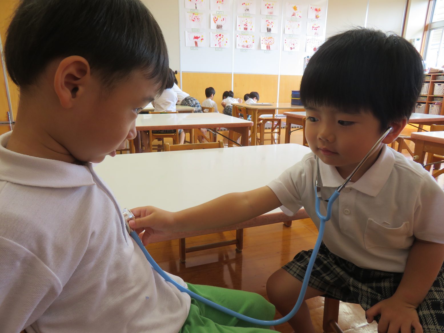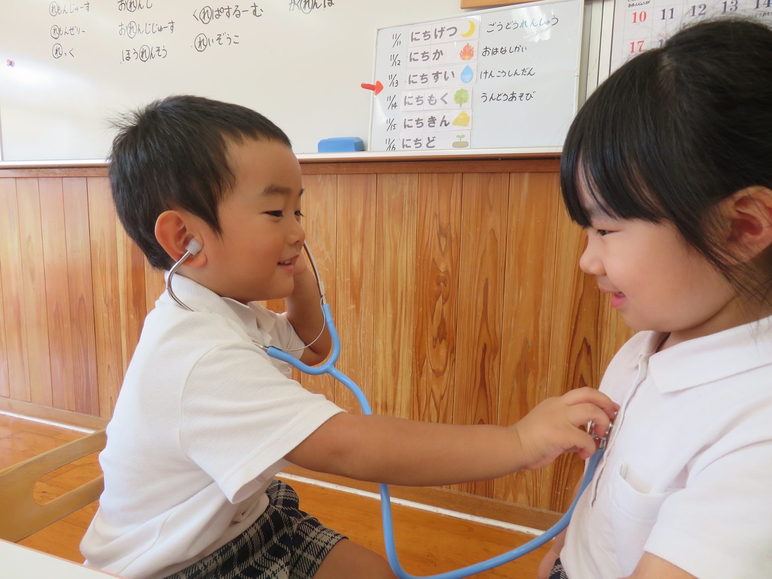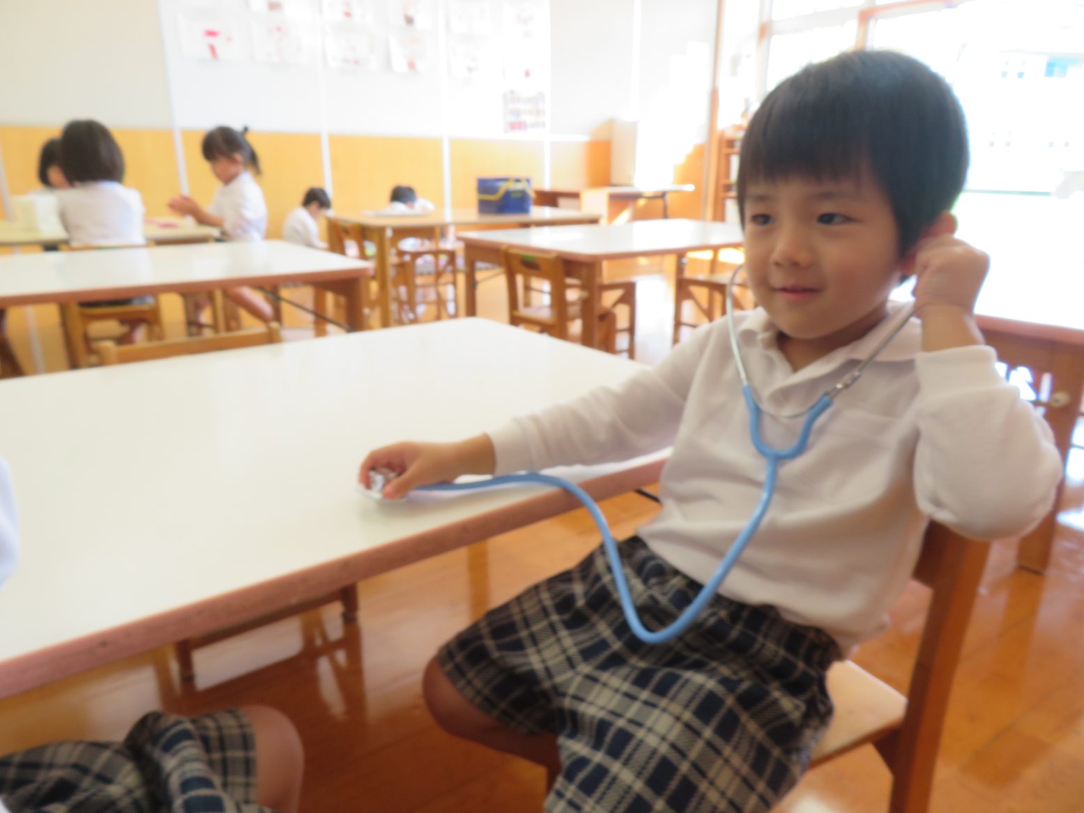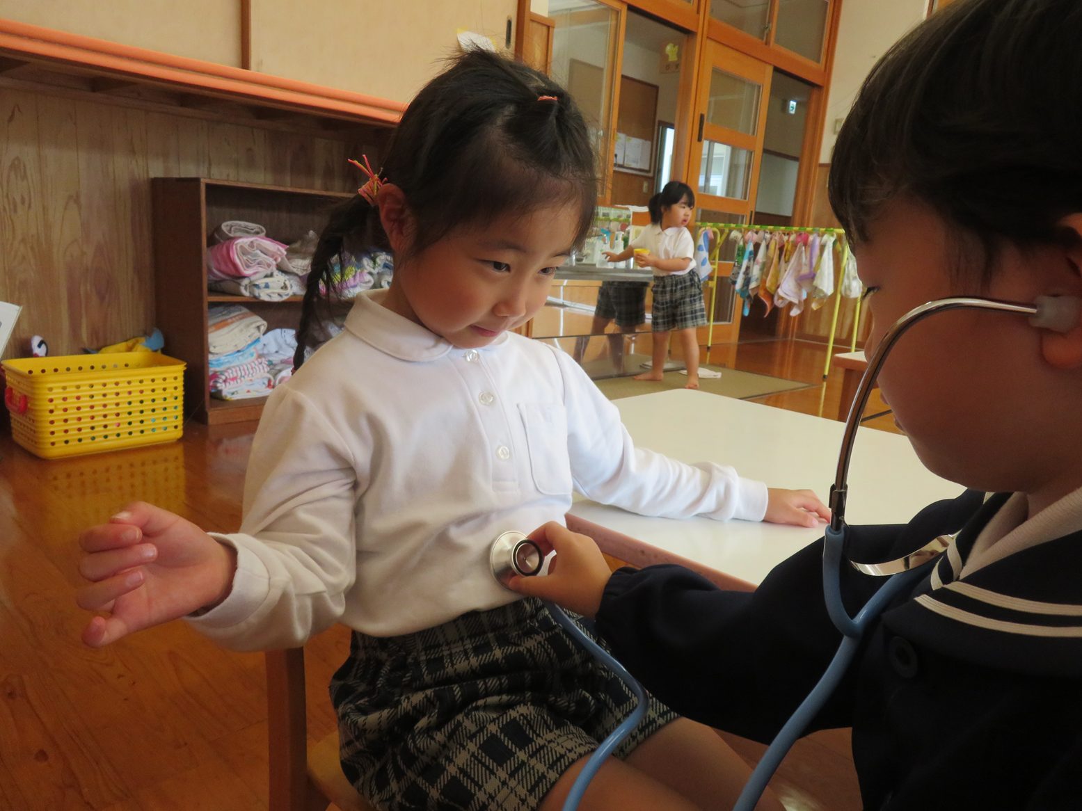 今週は健康診断があり、りす組では同時にお医者さんごっこがスタートしました。 聴診器を耳に付け「もしもししまーす。」と友だちのお腹や胸に当てていきます。 「んー音が聴こえないな。」、「がさがさ音がした。」、「ドクドクいってる!」と友だちの心音や聴診器から聞こえる音に耳を澄ませる子どもたち。 お医者さんごっこを通して、お医者さんに興味を持ったり中には「次は何のごっこ遊びをする?」と次なるごっこ遊びに期待を膨らませたりするりす組さんです。