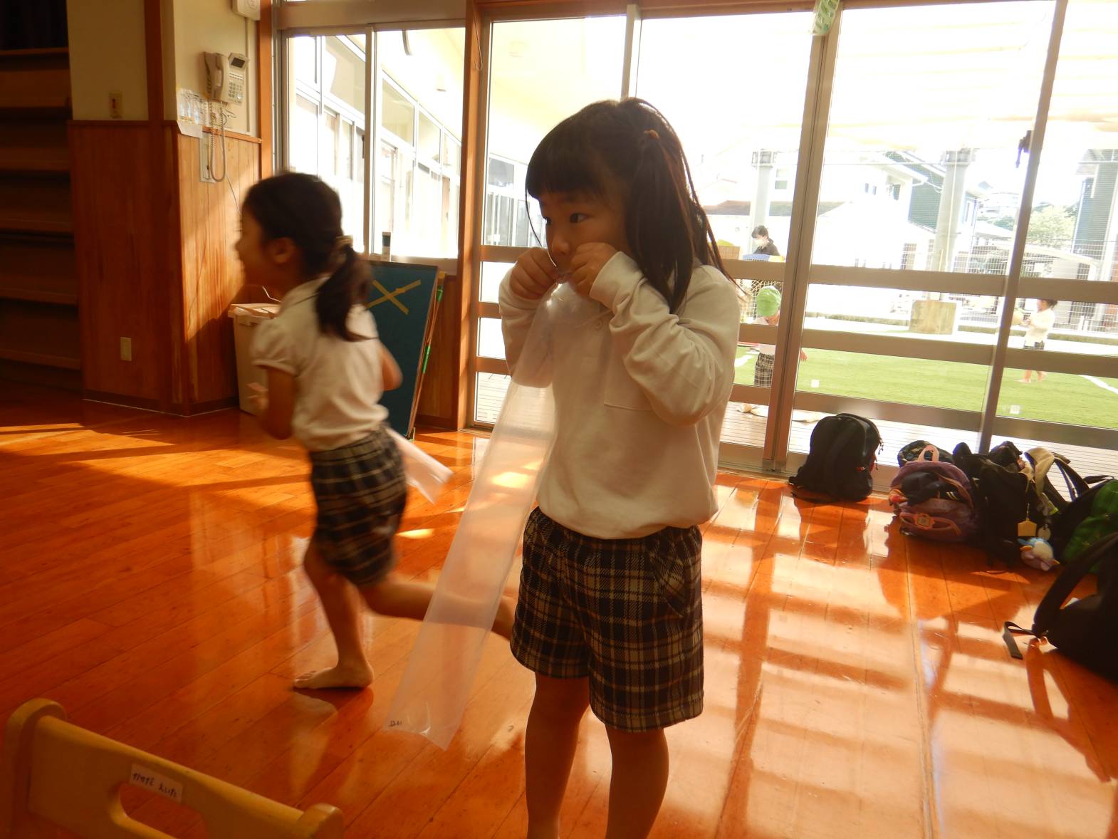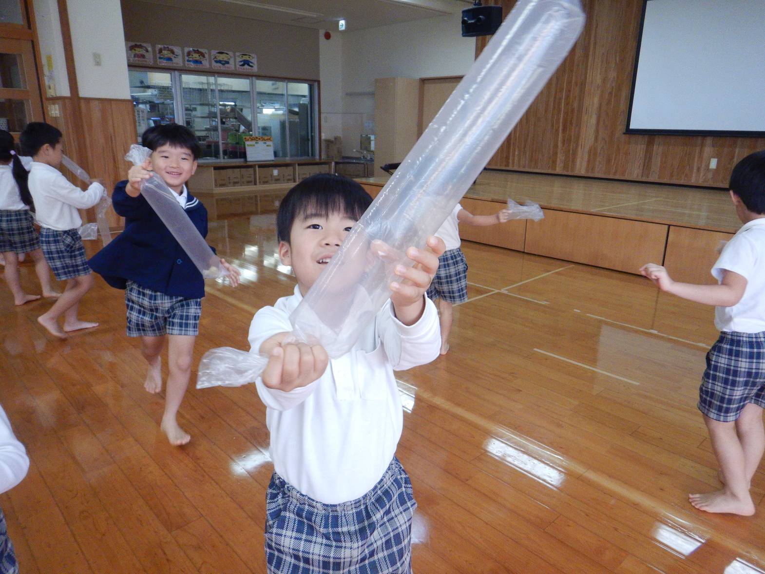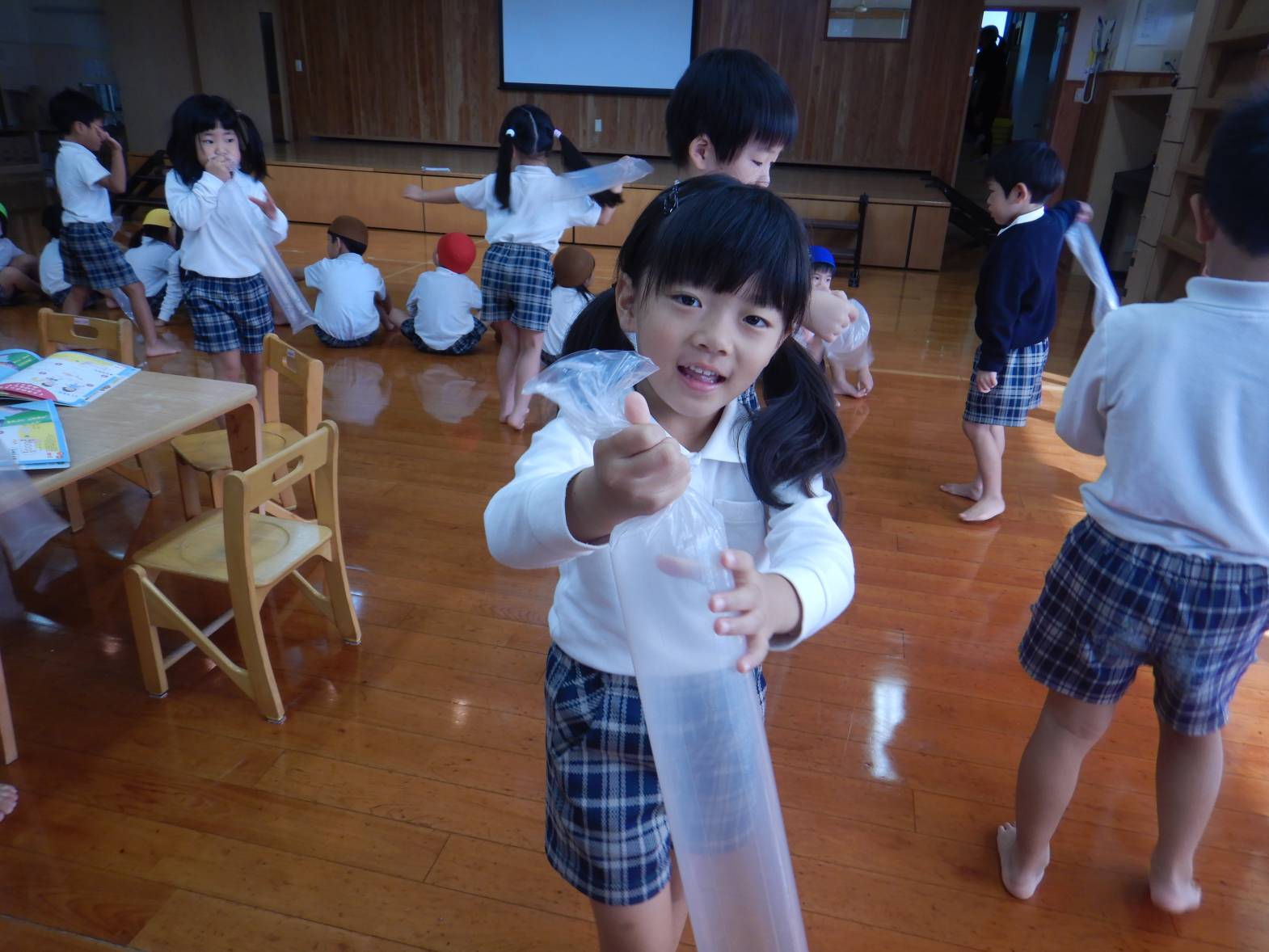 今週は月間絵本についていた風船ロケットに挑戦しました。 まずは袋に空気を入れ袋をねじります。 「膨らまない。」「難しいね。」と苦戦する様子が見られました。 無事空気が入りいよいよ発射の時。 「遠くまで飛んだよ!」「なんで飛ぶのかな?」と大興奮のきりん組さんでした。
