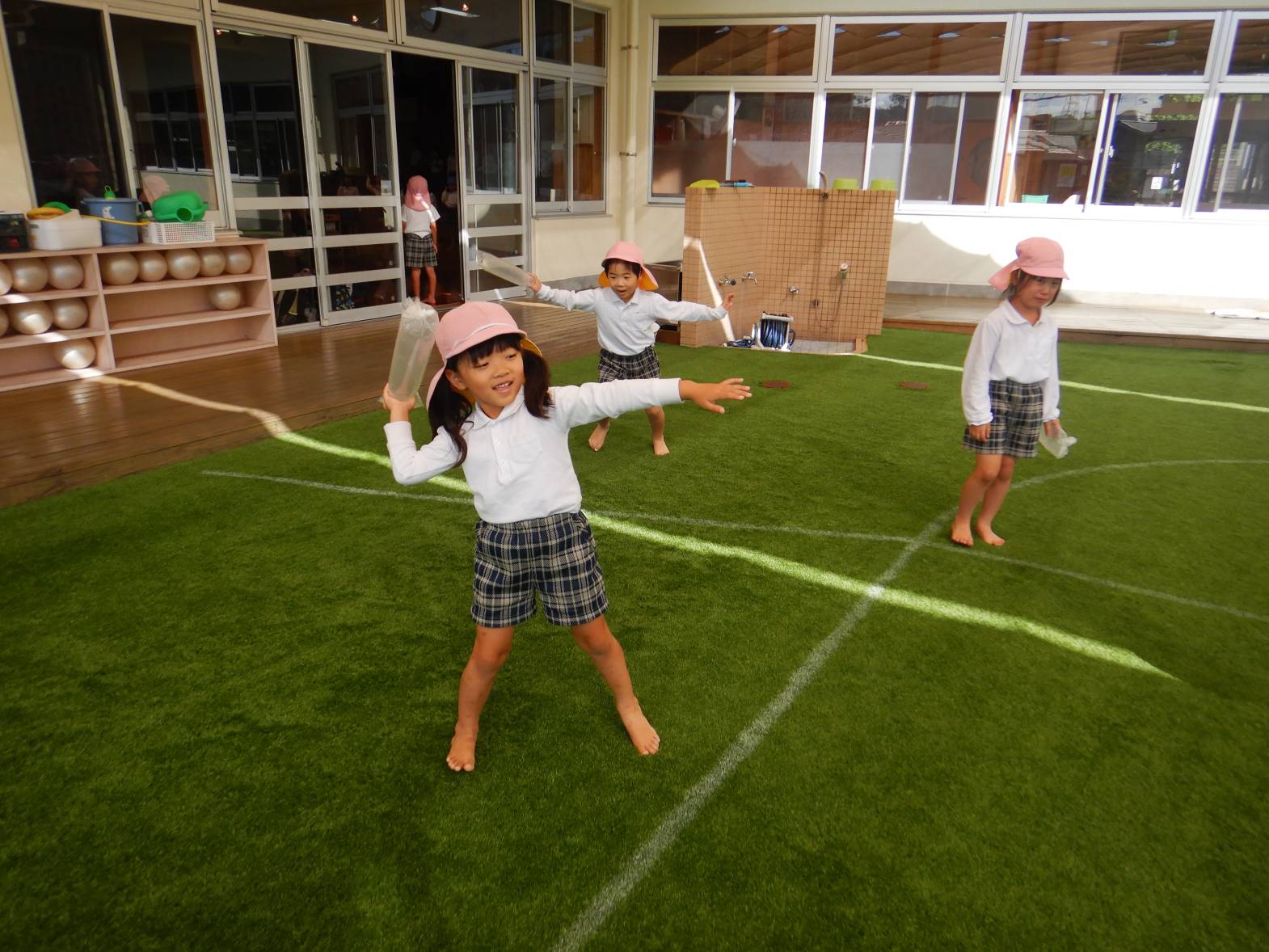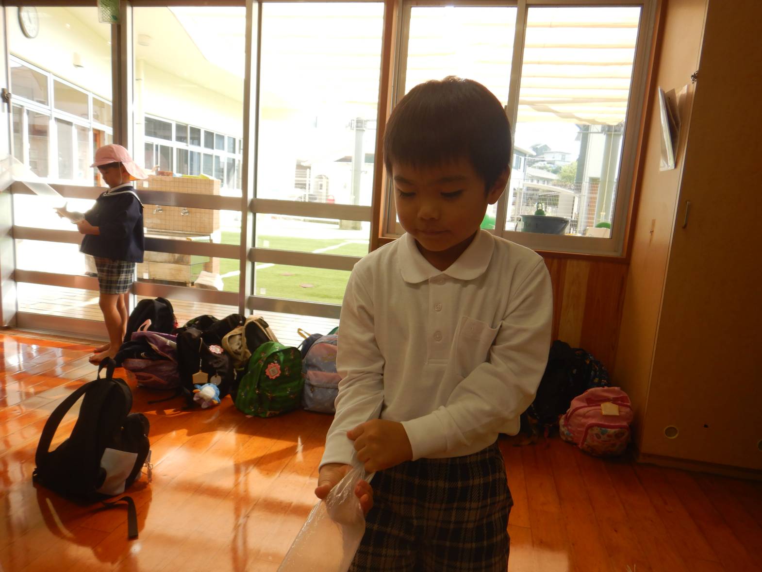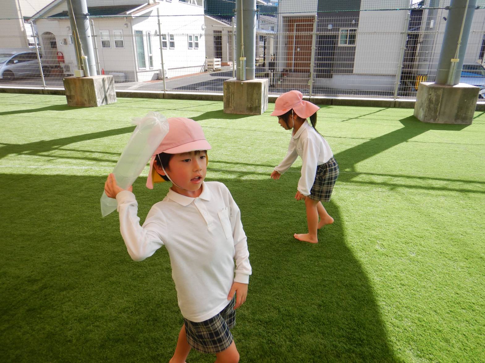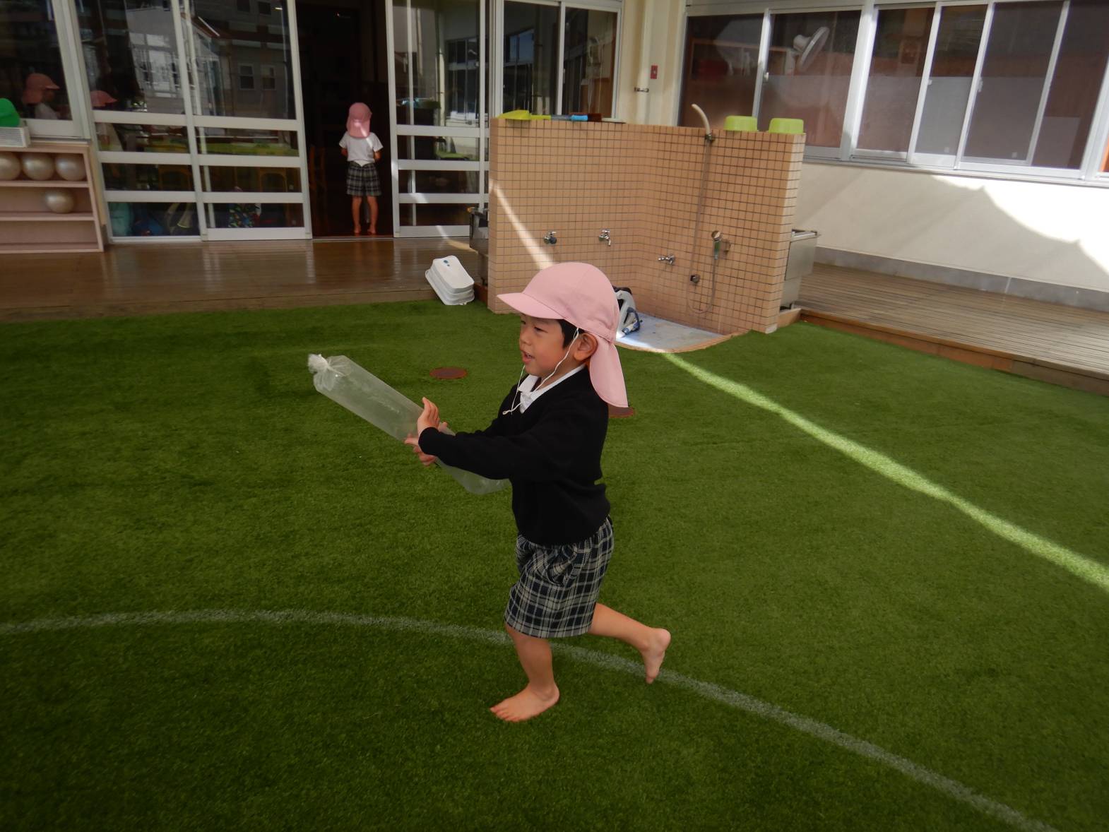 今週は月間絵本についていた風船ロケットに挑戦しました。 まずは袋に空気を入れ袋をねじります。 「膨らまない。」「難しいね。」と苦戦する様子が見られました。 無事空気が入りいよいよ発射の時。 「遠くまで飛んだよ!」「なんで飛ぶのかな?」と大興奮のきりん組さんでした。