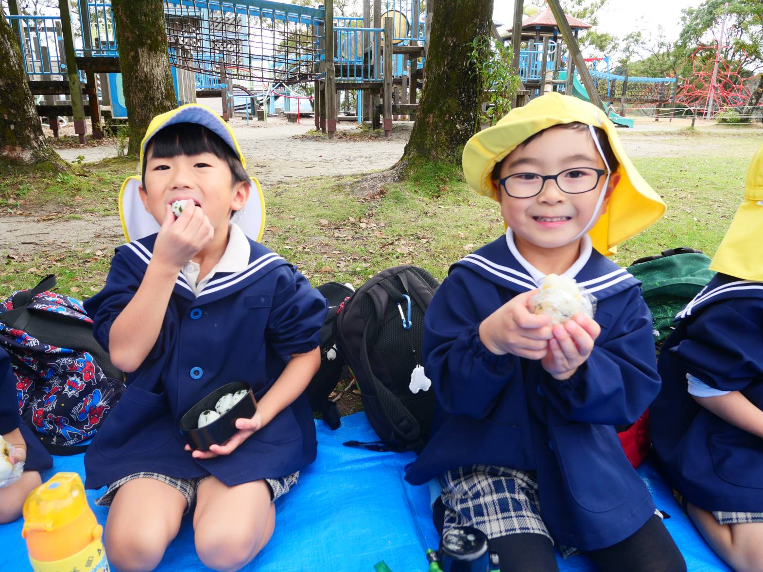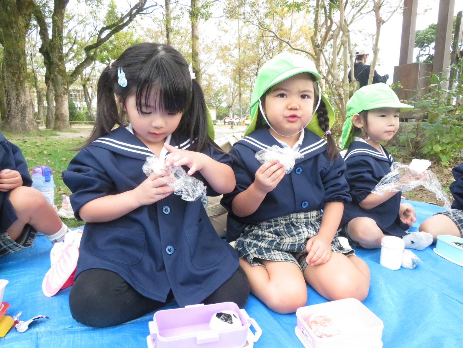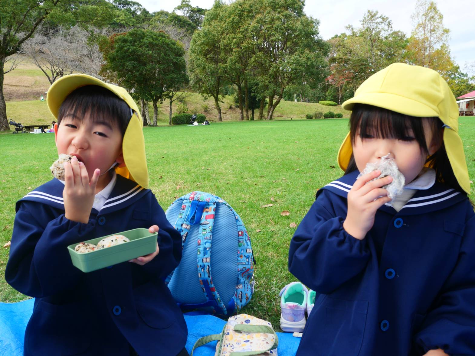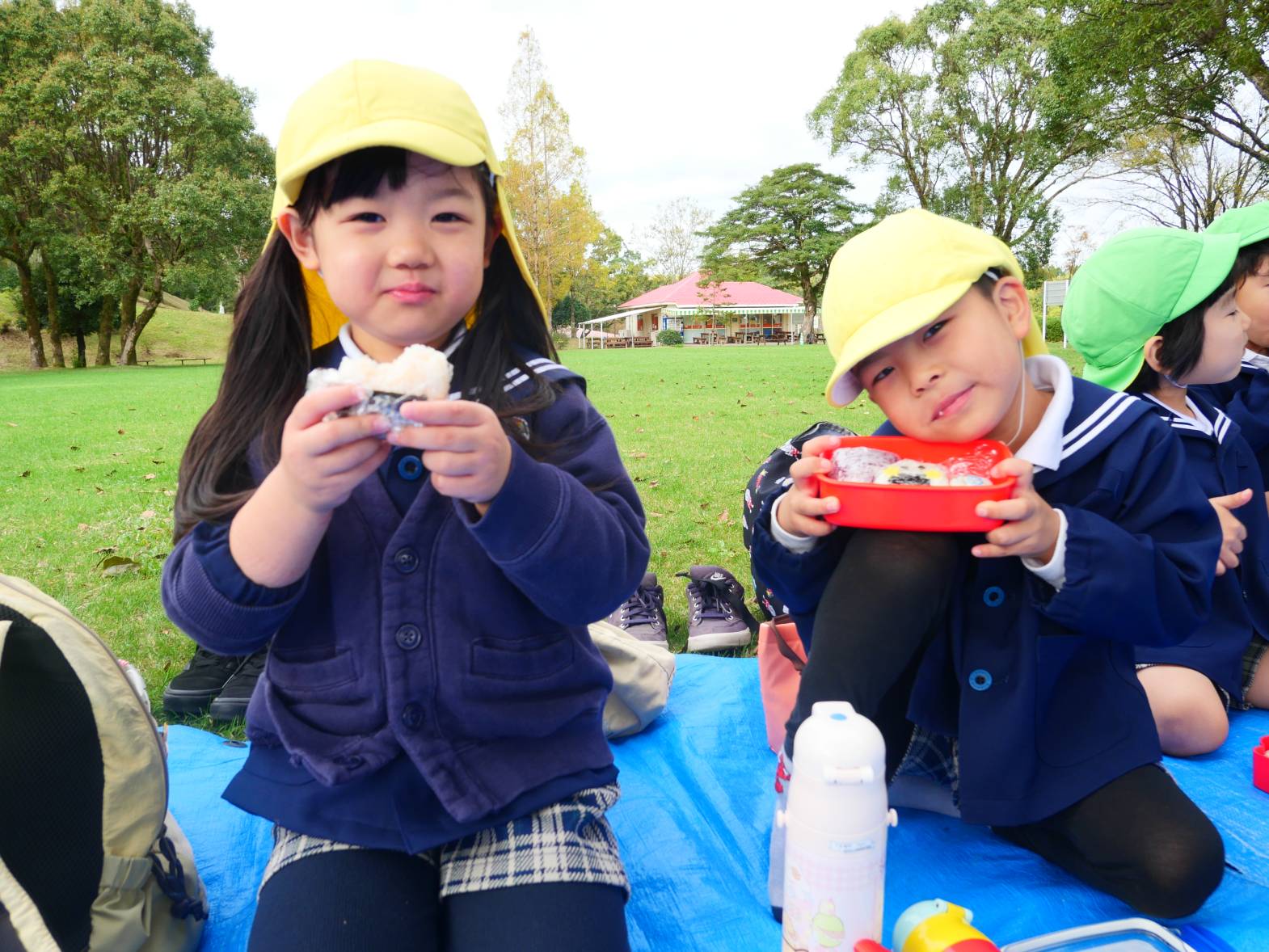 そして、子どもたちがとても楽しみにしていたおむすびの時間です。天気が良い公園でおいしいおむすびを食べることができ、大満足のりす組さんとうさぎ組さんでした♪