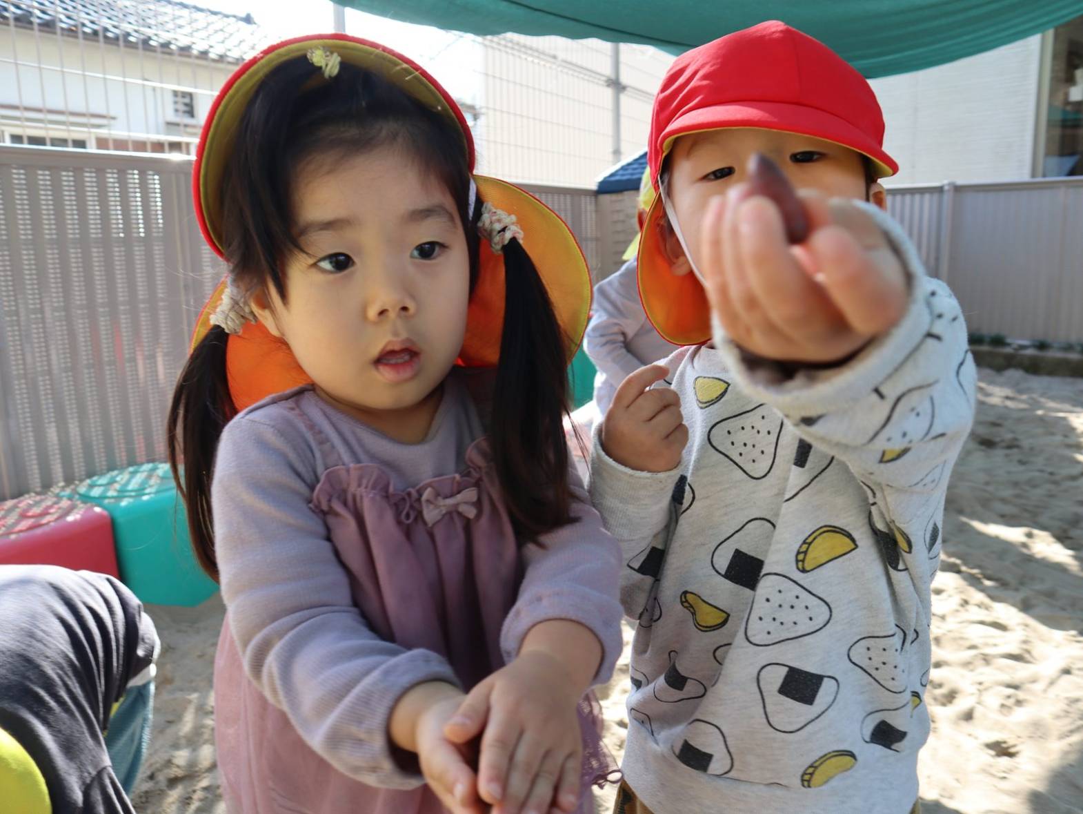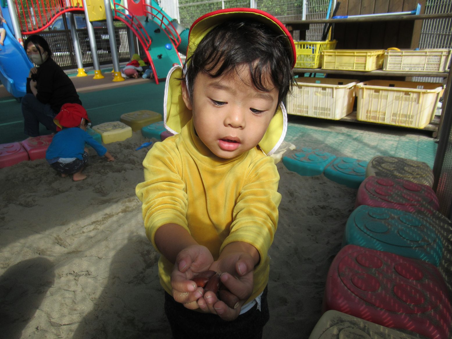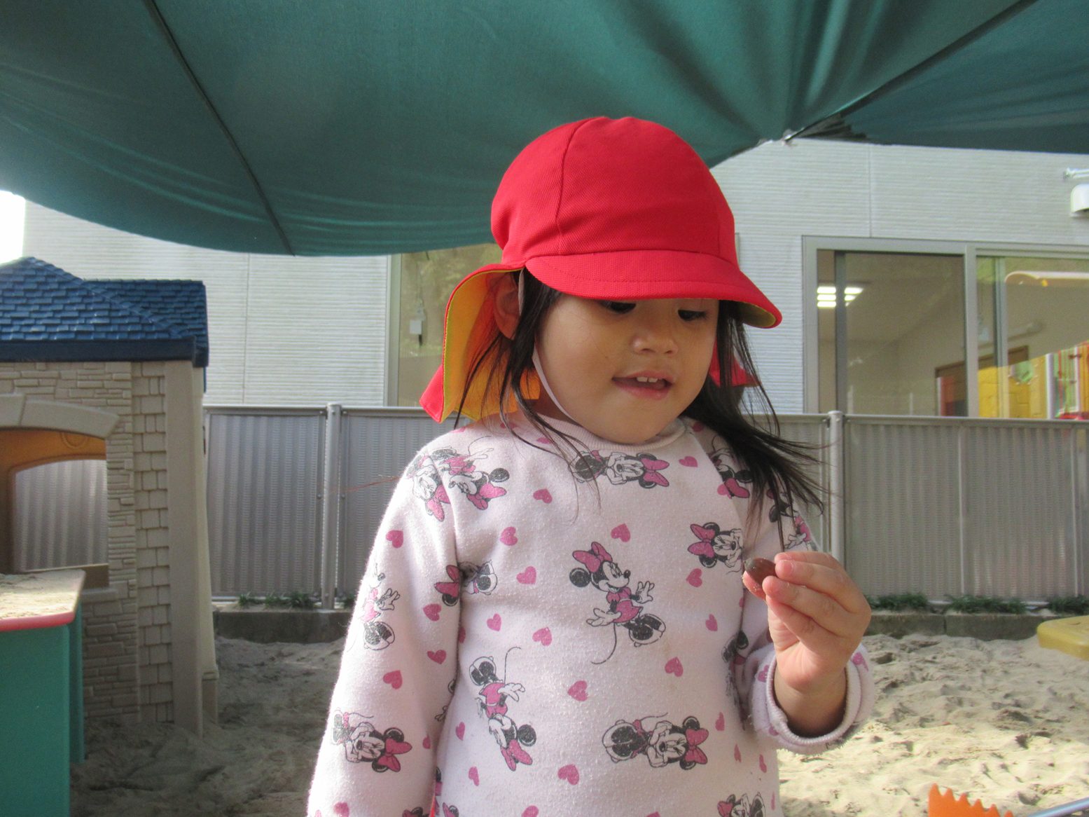 今月のおむすびの日は、砂場でどんぐり探しをしたぱんだ組さん。 スコップや手を使って砂をかき分けていきます。 見つけると「みぃつけた!」「見てみて~」と嬉しそうな表情を見せてくれました。 友だち同士で見せ合ったり、大きさを比べたりするぱんだ組さん。 今後も季節の物に触れることができるような活動を取り入れていきます。 ご家庭でもどんぐり拾いの感想を聞かれてみてください!