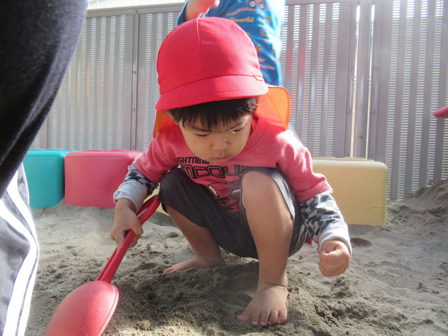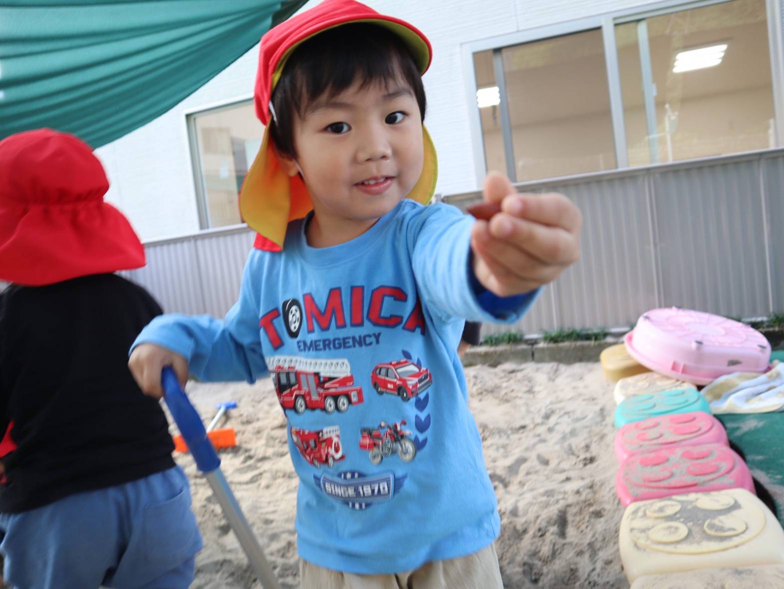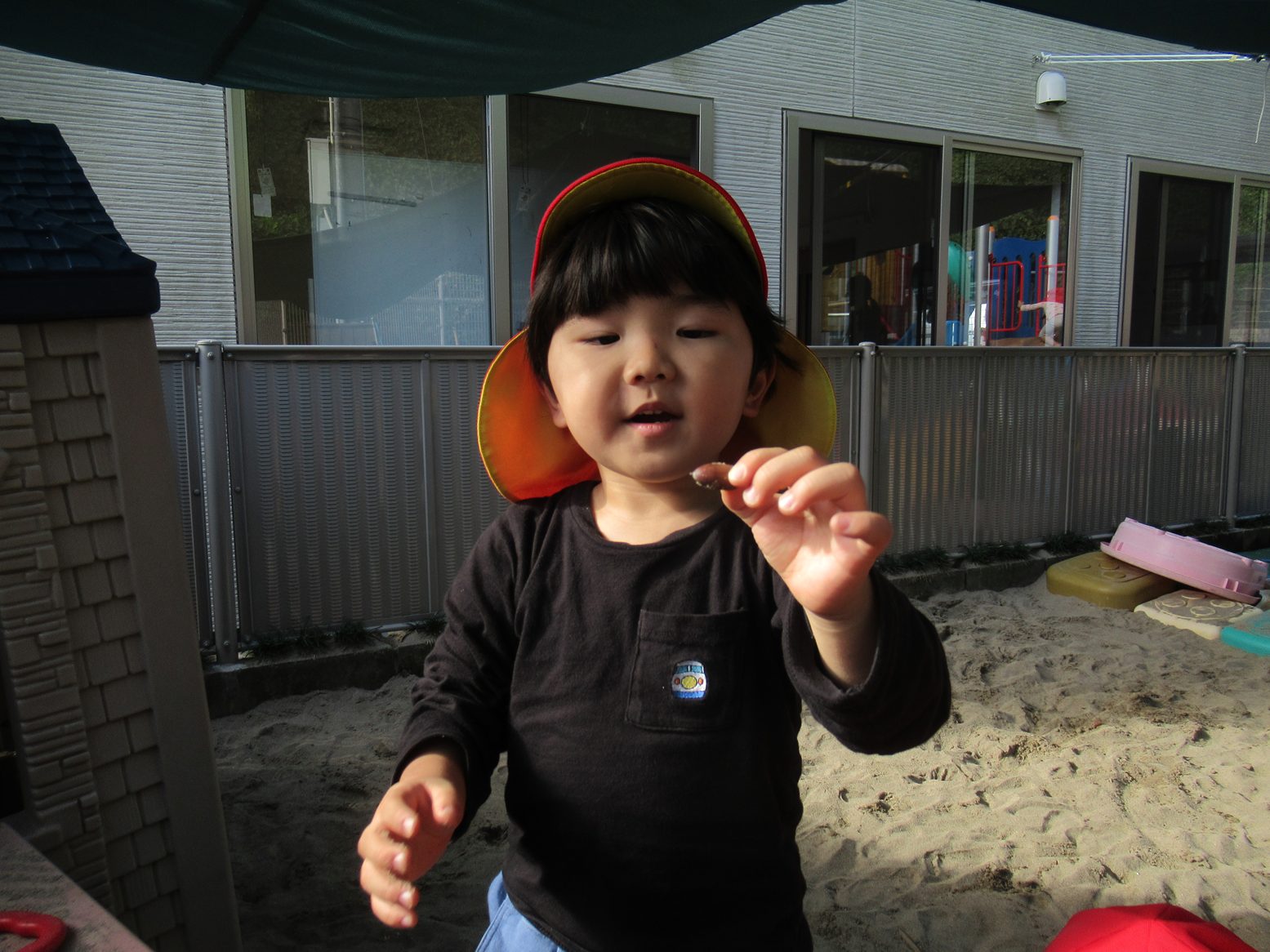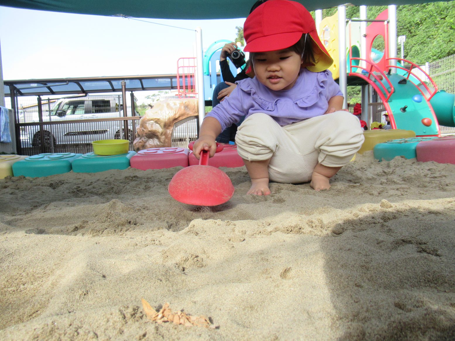 今月のおむすびの日は、砂場でどんぐり探しをしたぱんだ組さん。 スコップや手を使って砂をかき分けていきます。 見つけると「みぃつけた!」「見てみて~」と嬉しそうな表情を見せてくれました。 友だち同士で見せ合ったり、大きさを比べたりするぱんだ組さん。 今後も季節の物に触れることができるような活動を取り入れていきます。 ご家庭でもどんぐり拾いの感想を聞かれてみてください!