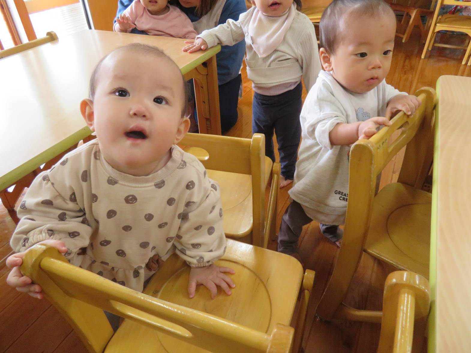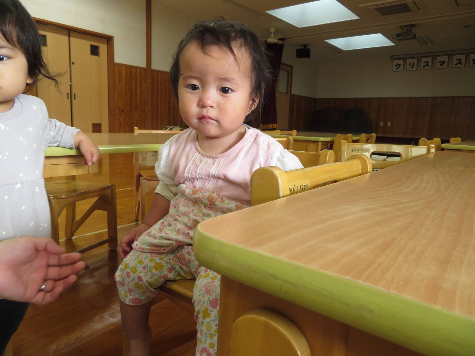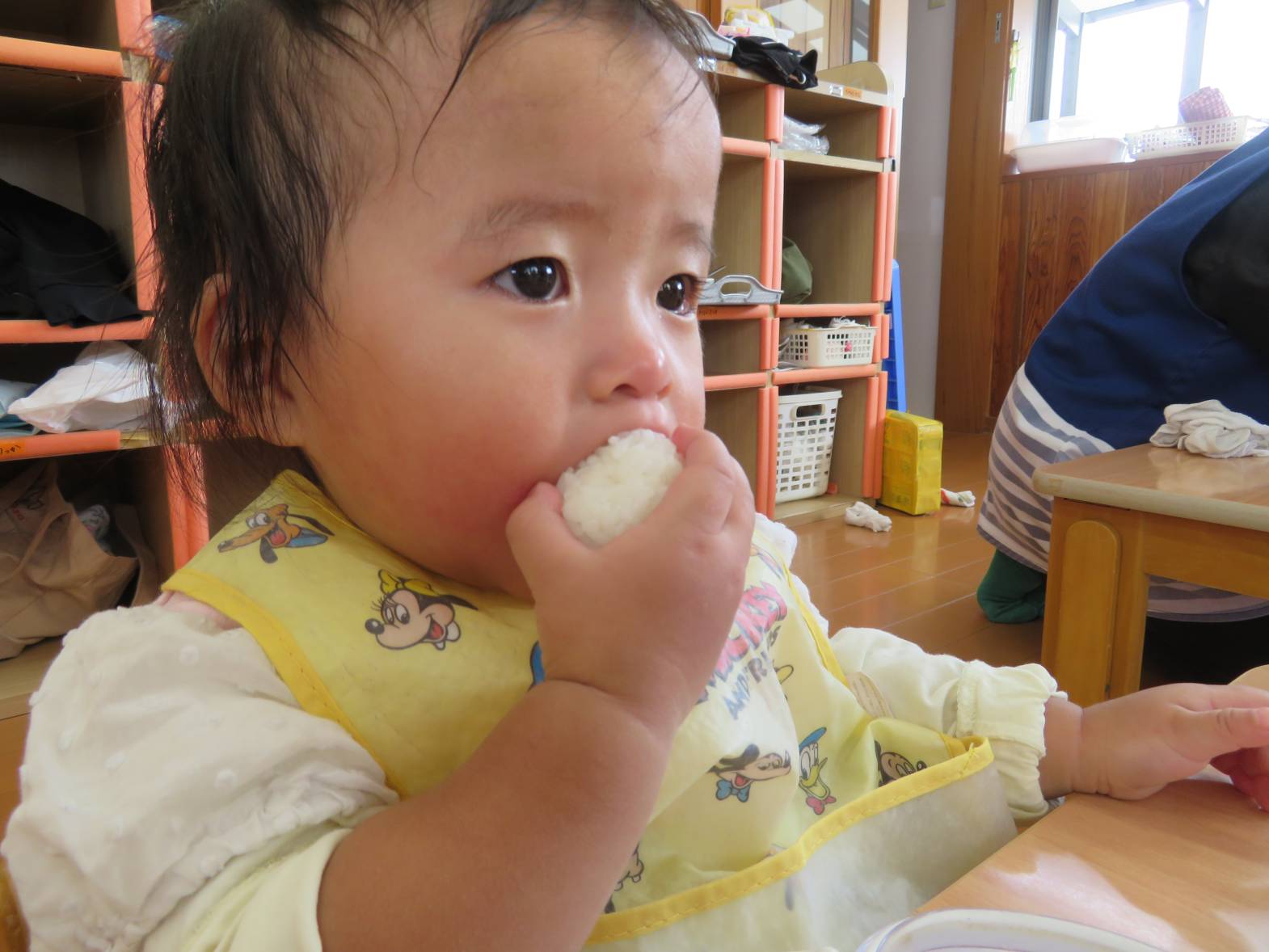 今日は、おむすびの日ということもあり、いつもと違う雰囲気の保育園。 そんな保育園の探索に行ってきました♪ きりん組さんに入ると、いつもよりも大きな机と椅子にわくわくした表情のひよこ組さん! 手押し車のようにしてみたり、座ってみたりと楽しんでいます。 お待ちかねのおむすびを美味しく頬張り満足そうな表情を浮かべる子どもたちでした。