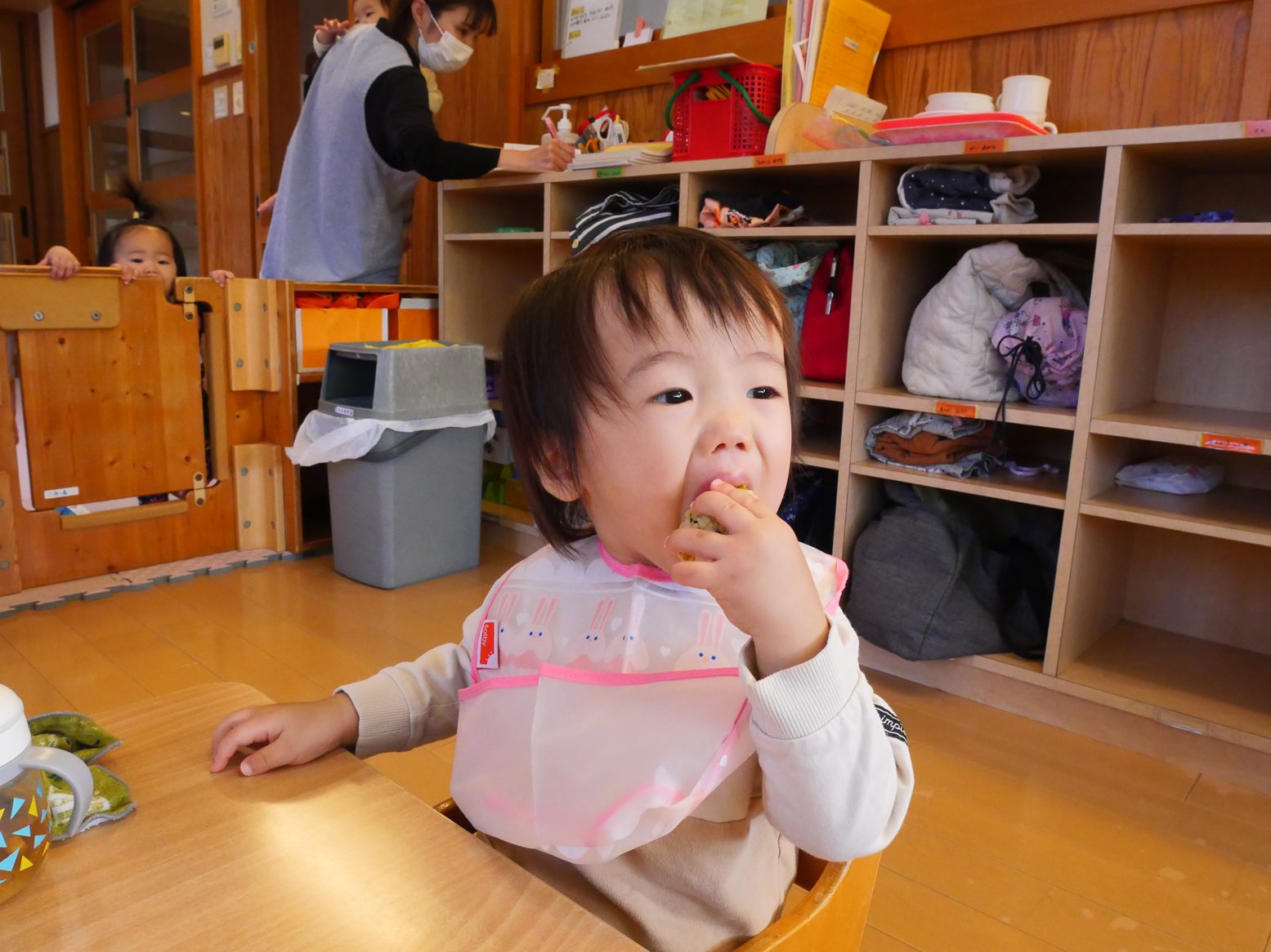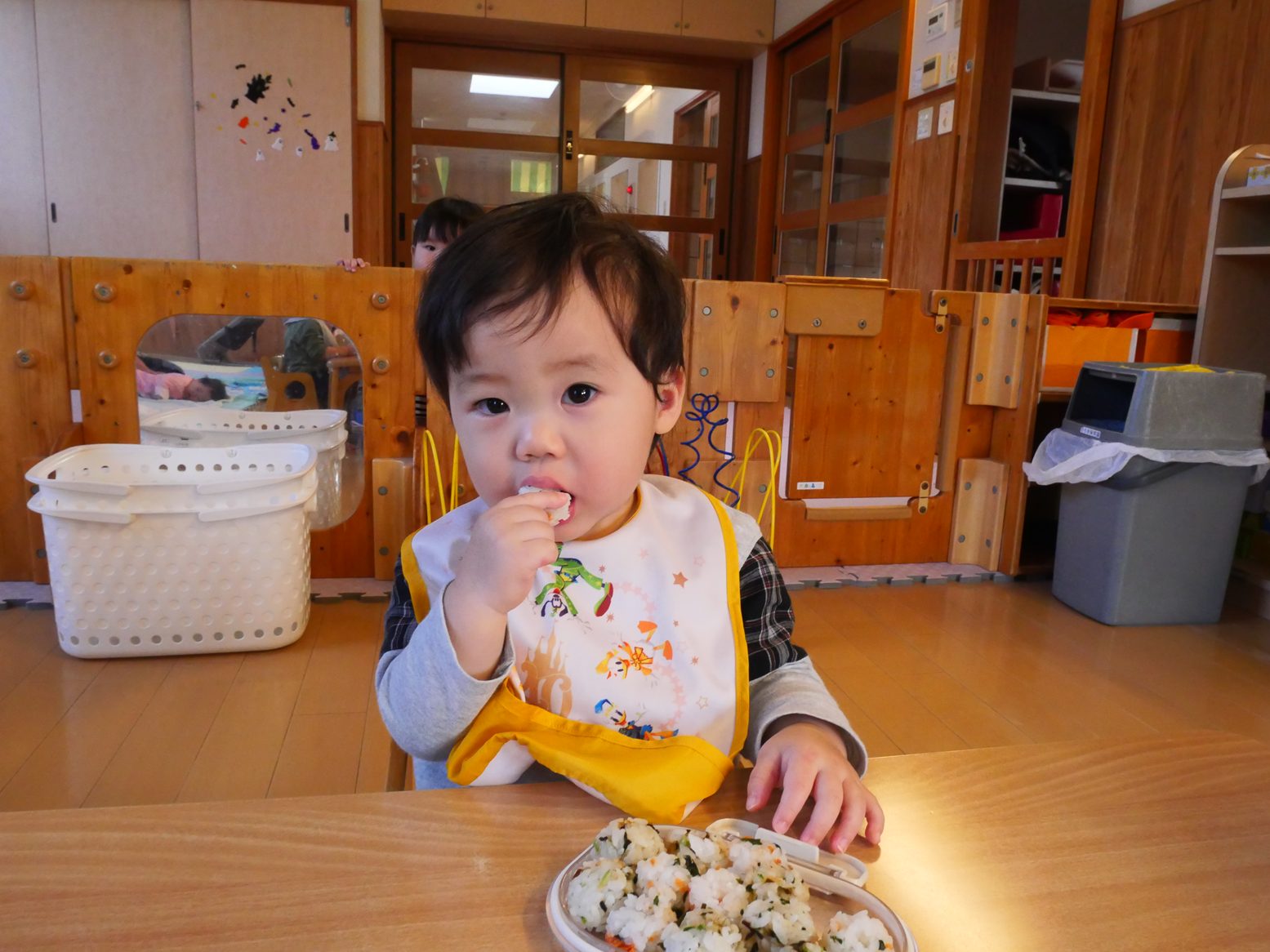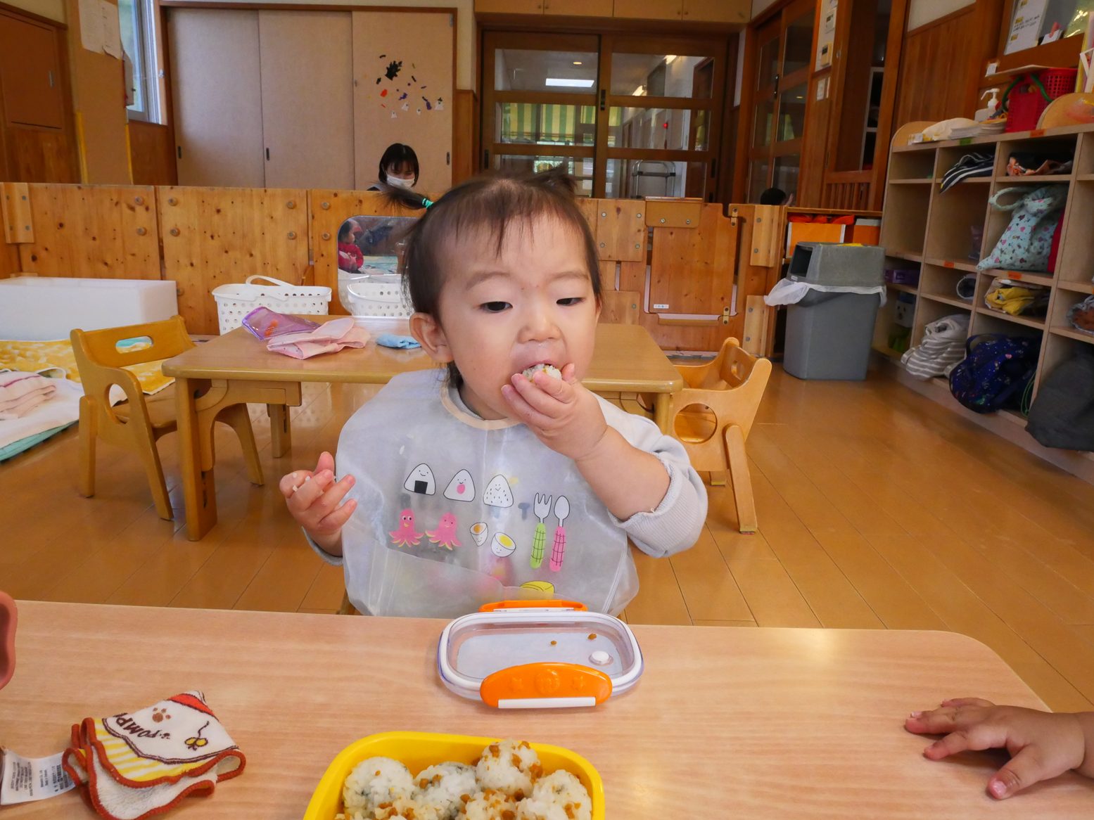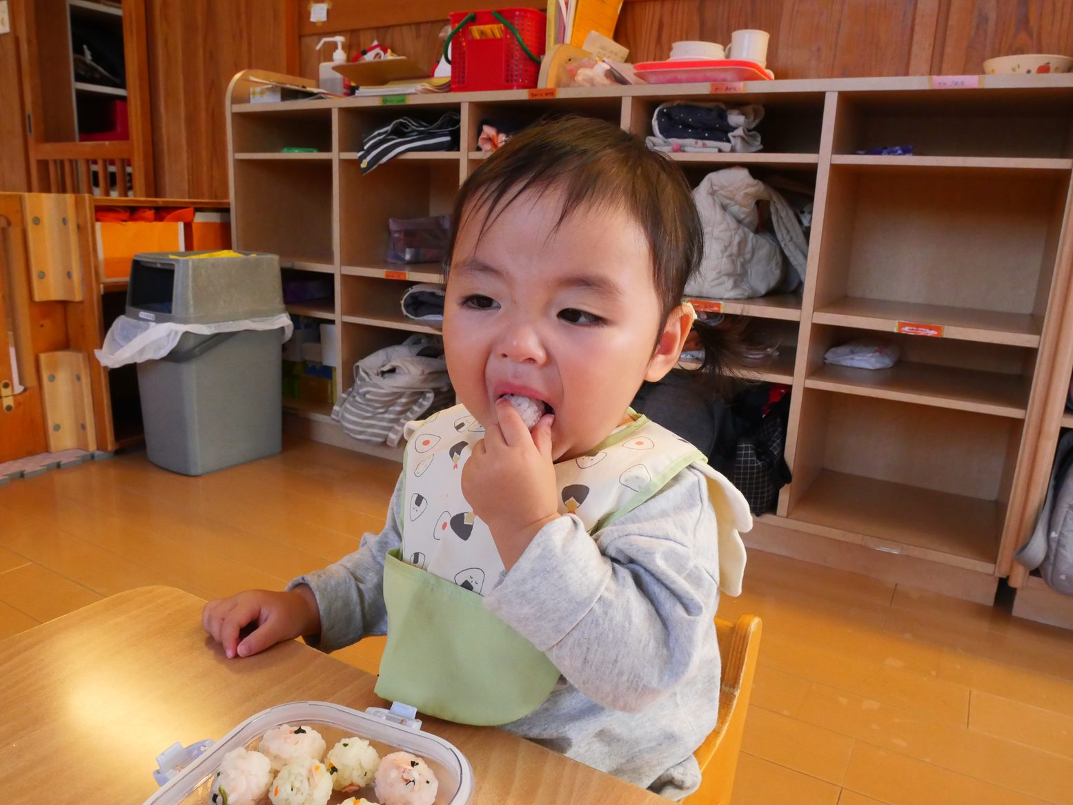 給食の時間が近付くと、いつも泣き出しそうになりながら「早く食べたいよ」と訴えてくる子どもたち。 おむすびの日はいつも以上に食べたいアピールが絶えません。 椅子に座ると、保育者が何も言わなくても「いただきます」をして食べる準備万端です! 弁当箱の蓋を開けると「あー!」と嬉しい叫び声が聞こえてきます。 自分の手で上手につかんだら、大きく口を開けてパクパク食べ進めるひよこ組さん。 今月のおむすびの日も、ぺろりと完食でした。 おむすびのご準備ありがとうございました。
