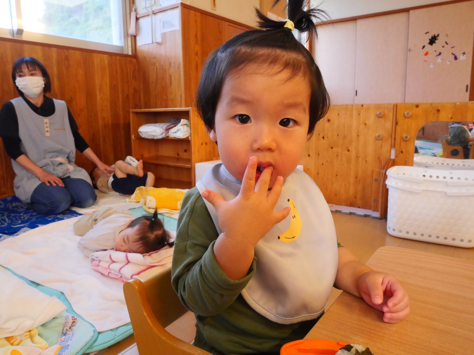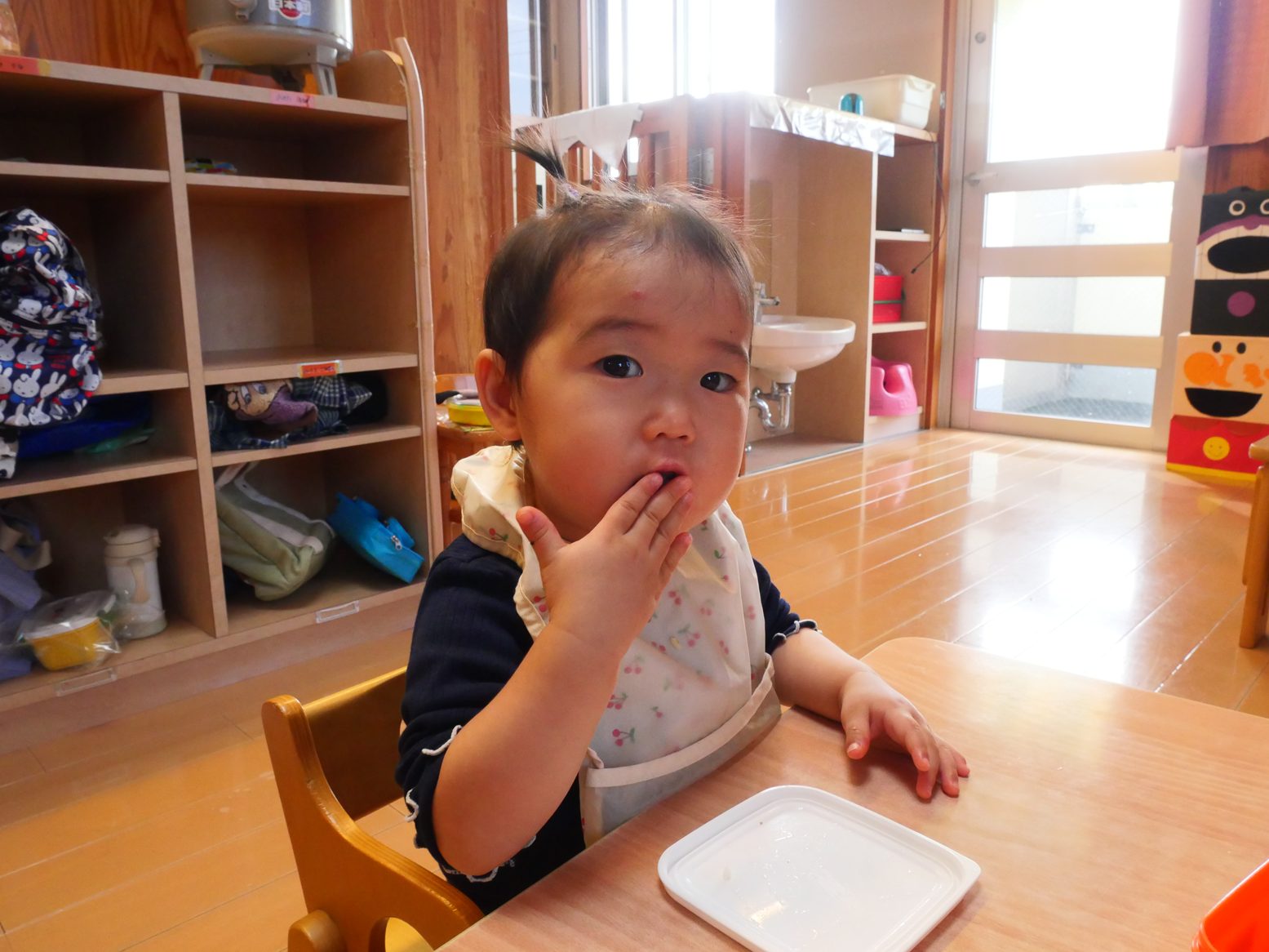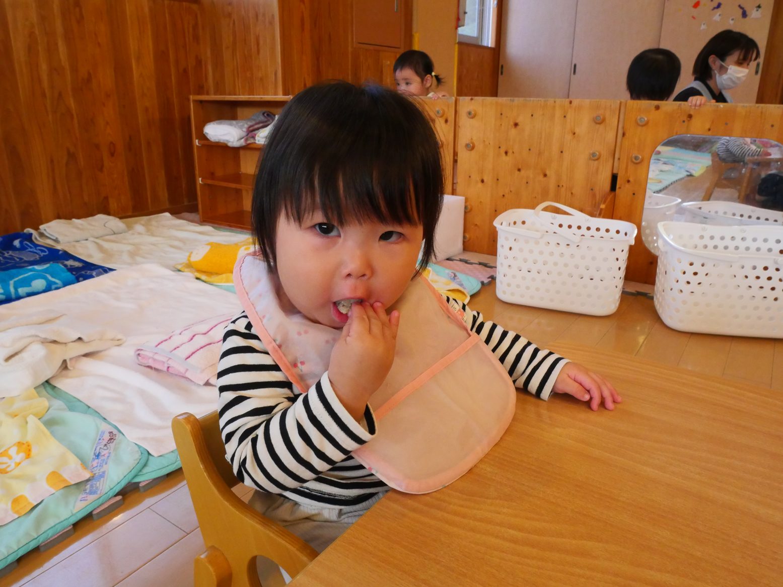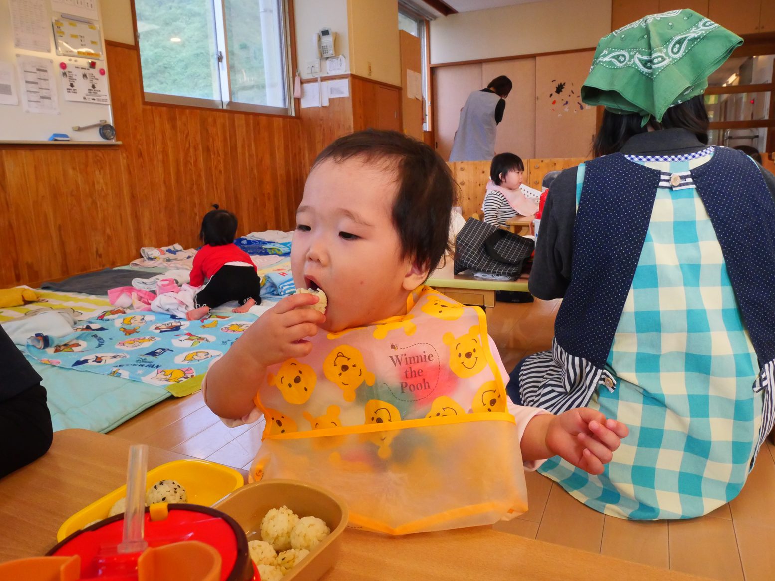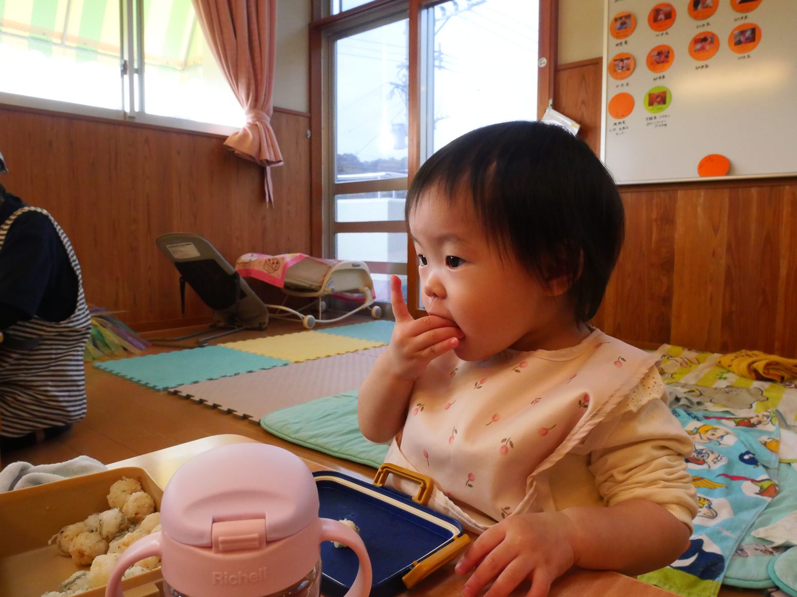 給食の時間が近付くと、いつも泣き出しそうになりながら「早く食べたいよ」と訴えてくる子どもたち。 おむすびの日はいつも以上に食べたいアピールが絶えません。 椅子に座ると、保育者が何も言わなくても「いただきます」をして食べる準備万端です! 弁当箱の蓋を開けると「あー!」と嬉しい叫び声が聞こえてきます。 自分の手で上手につかんだら、大きく口を開けてパクパク食べ進めるひよこ組さん。 今月のおむすびの日も、ぺろりと完食でした。 おむすびのご準備ありがとうございました。