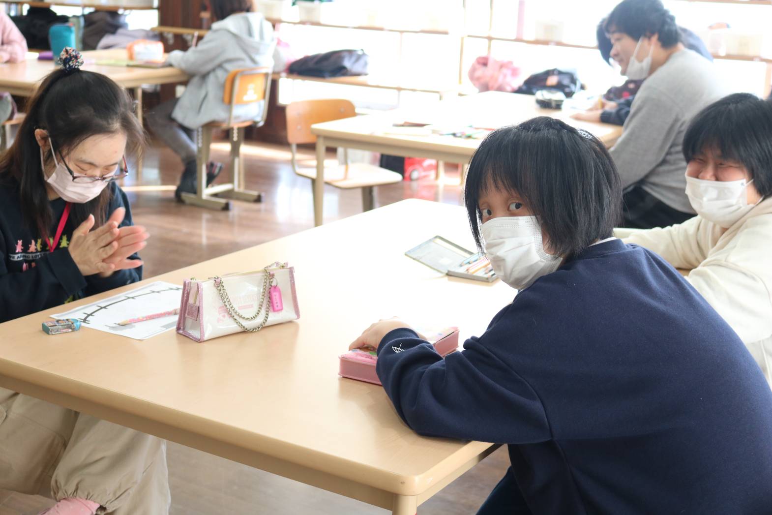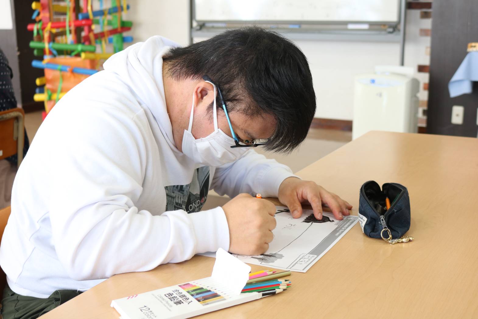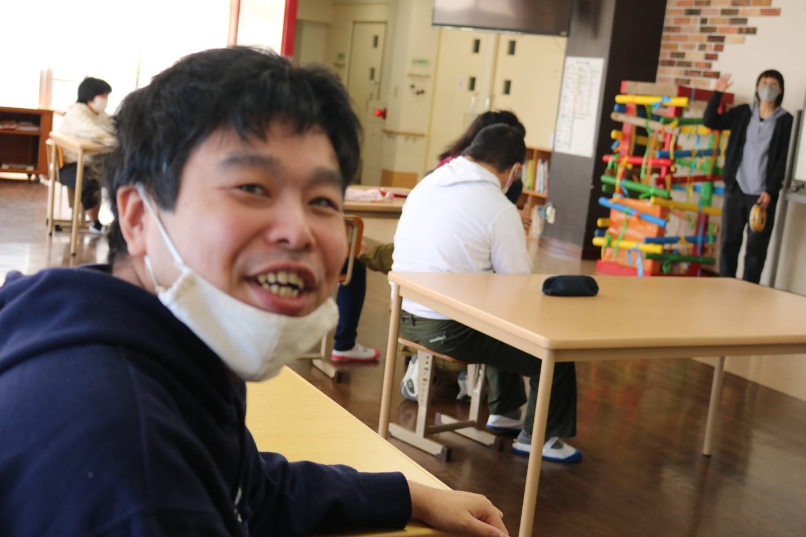「英語で遊ぼう」にて、牧場の動物やその鳴き声について、 歌など通して楽しく学びました。 牧場の動物について学んだあとは、 皆さん自由に好きな動物の絵を描いて過ごされました。 なかには、支援員が何の動物を描いたのか、質問をすると 「cow!」と歌で学んだ英単語を使って返答して下さる方もいて 皆さんから拍手で称賛される場面もありました。