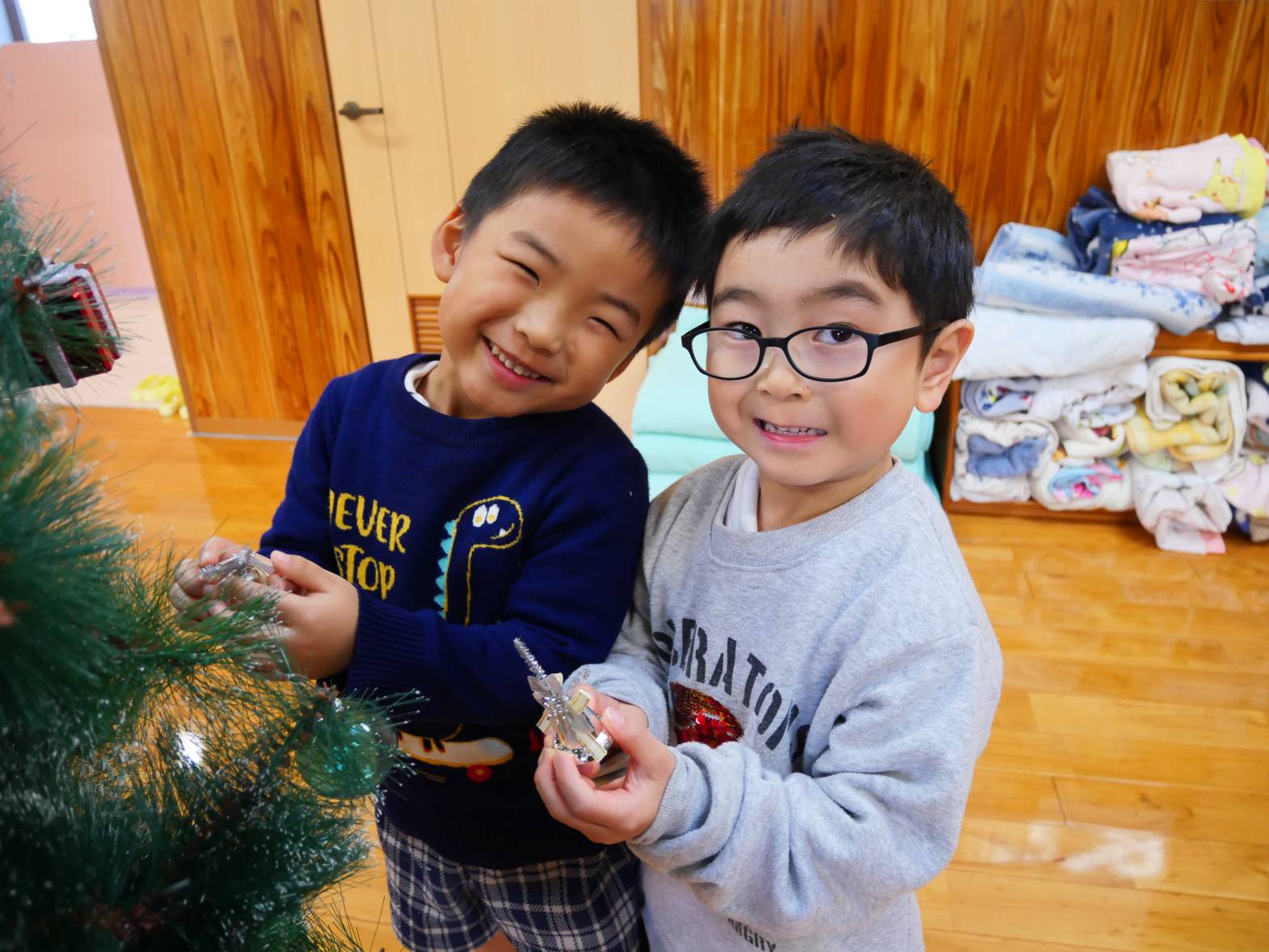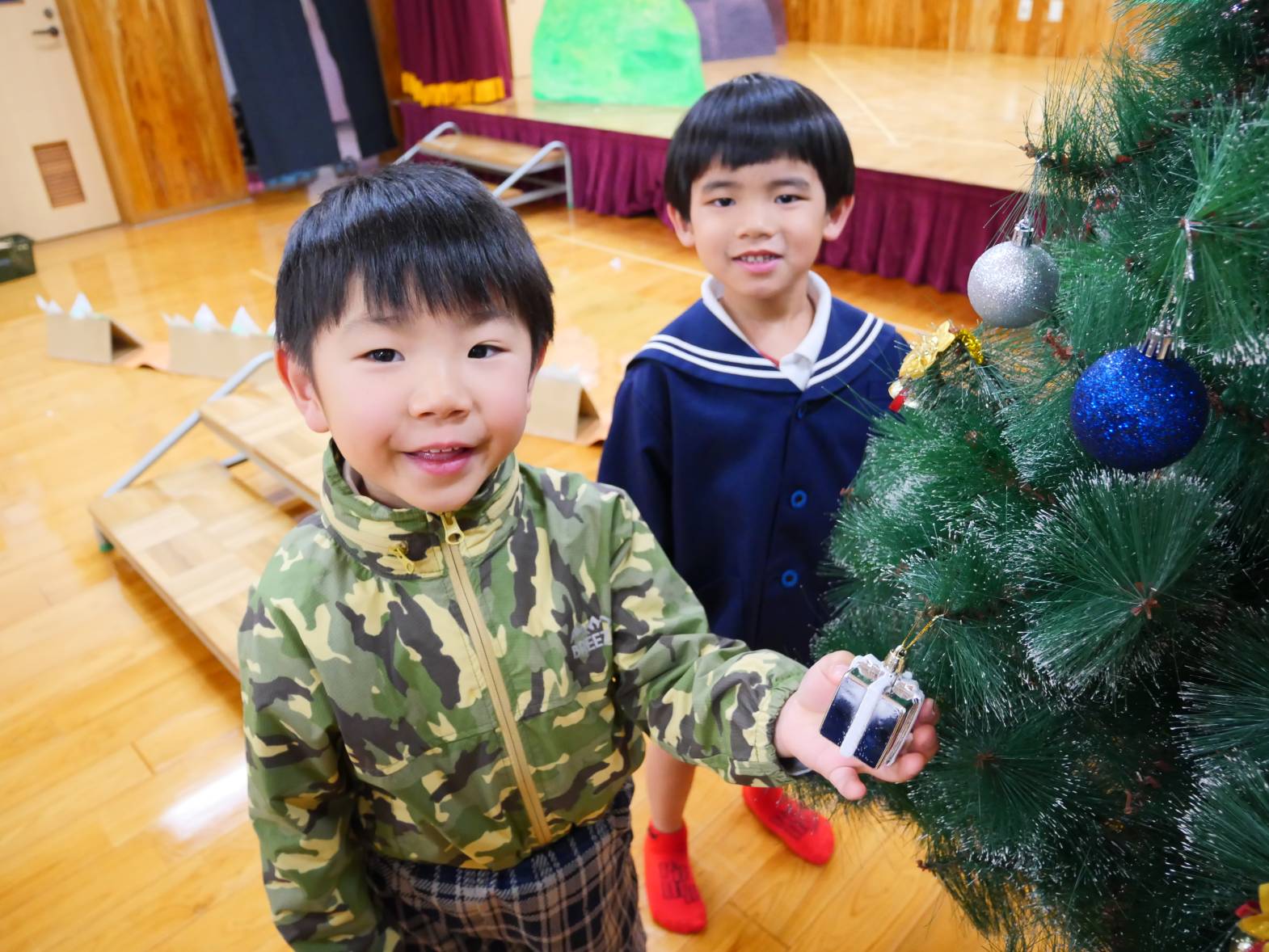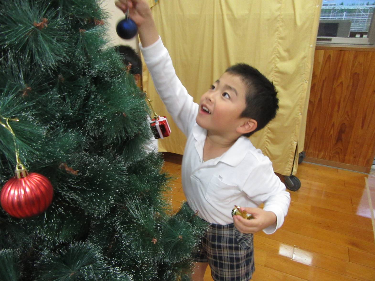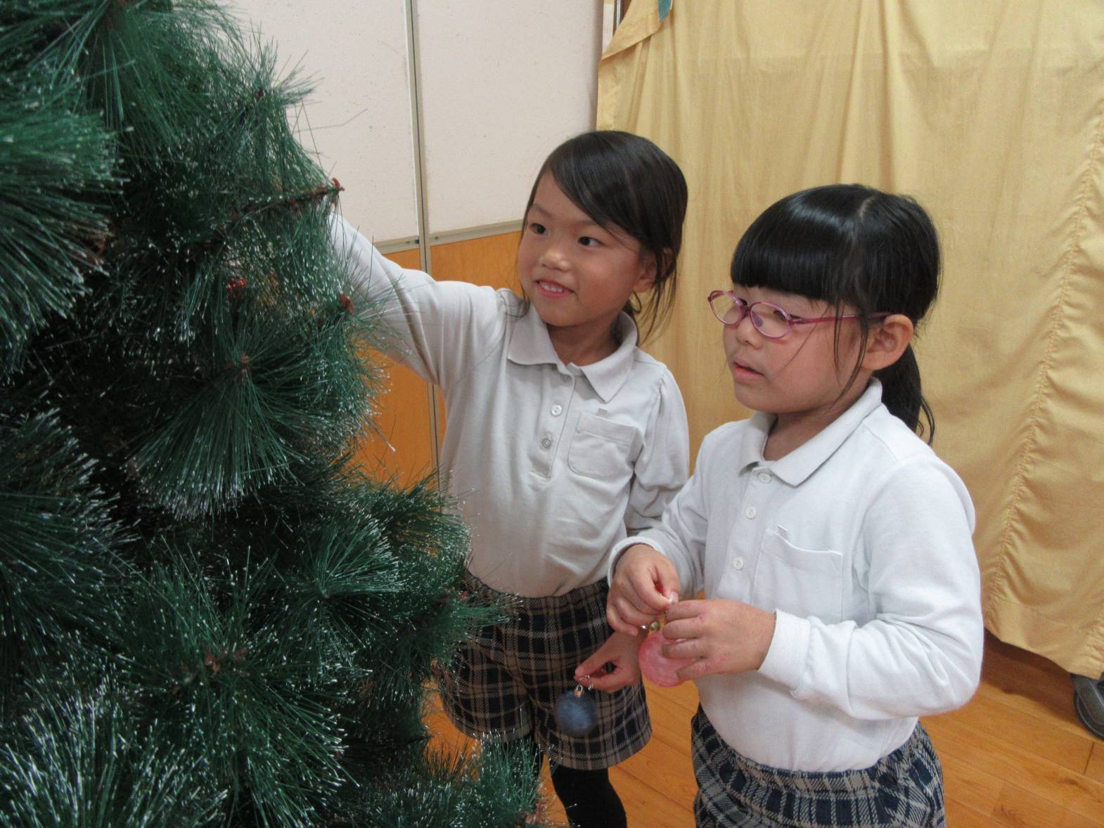 うさぎ組さんときりん組さんでクリスマスツリーの飾りつけをしました。 「きらきらしている飾りをつけたらかわいいかも!」、「僕は、サンタさんからプレゼントをもらいたいからプレゼントの飾りをつけようかな!」と、会話を弾ませる子どもたち。 「みんなで一緒に飾りつけをしたからかわいいクリスマスツリーになったね。」、「サンタさんも見てくれると嬉しいな。」と、楽しく飾り付けをすることができました♪