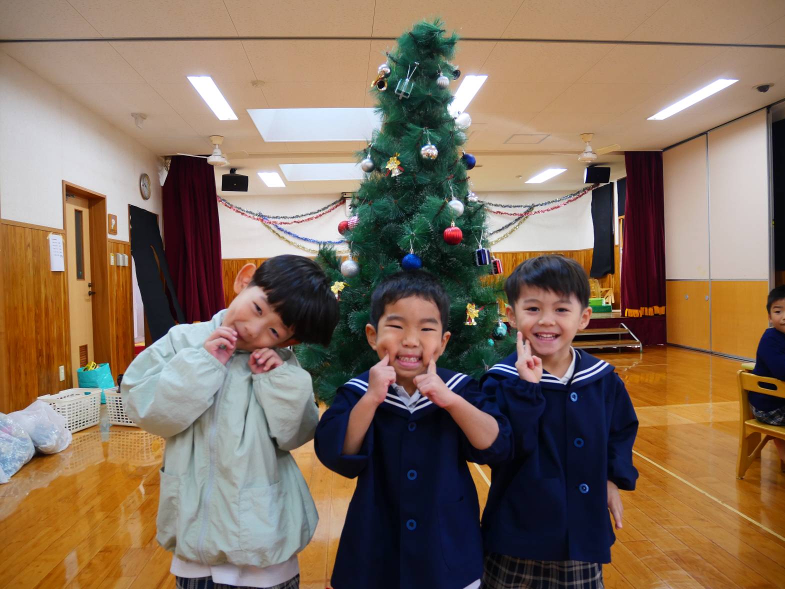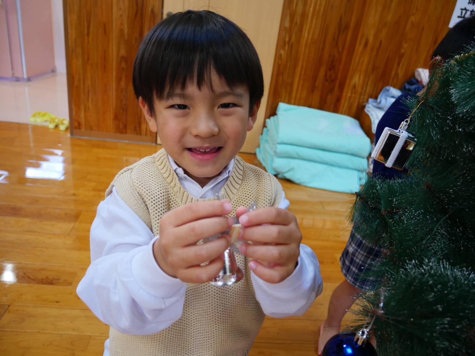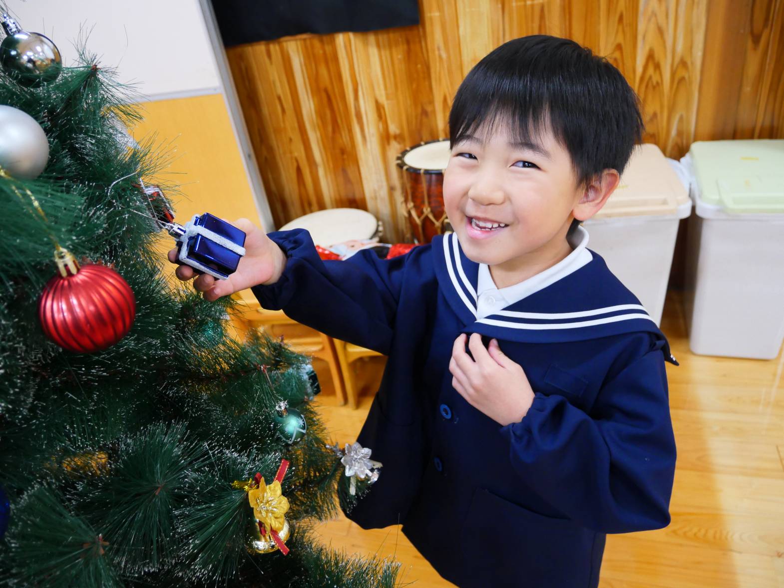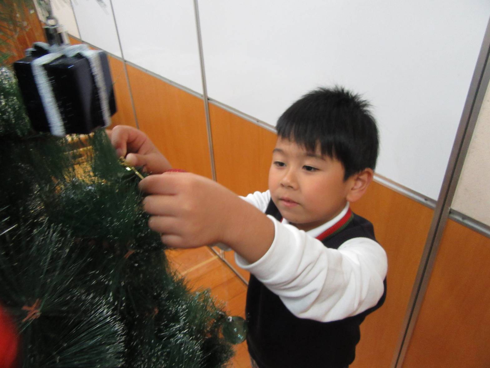 うさぎ組さんときりん組さんでクリスマスツリーの飾りつけをしました。 「きらきらしている飾りをつけたらかわいいかも!」、「僕は、サンタさんからプレゼントをもらいたいからプレゼントの飾りをつけようかな!」と、会話を弾ませる子どもたち。 「みんなで一緒に飾りつけをしたからかわいいクリスマスツリーになったね。」、「サンタさんも見てくれると嬉しいな。」と、楽しく飾り付けをすることができました♪