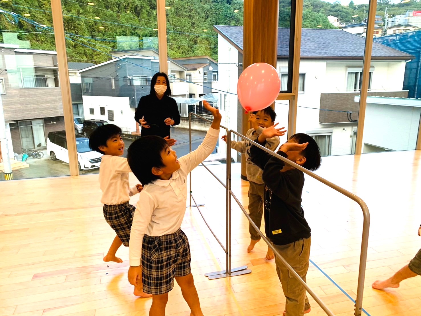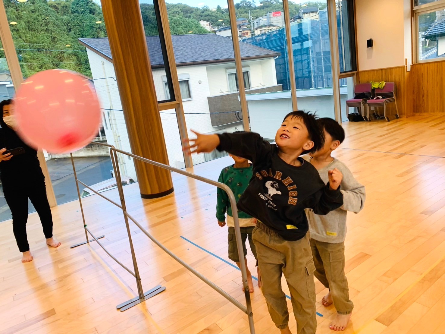 風船バレーを行いました! お友だち同士で落とさないようにラリーを続ける練習では、 風船の動きをよく見て追いかける様子が見られました! チームをつくってゲームをすると、どちらのチームも「まけないぞー!」と気合十分! 同じチームのお友達と声をかけ合いながら相手チームのコートに風船を打ち返すことができました♪ 勝っても負けても笑顔いっぱいで、楽しむ子どもたちでした☆