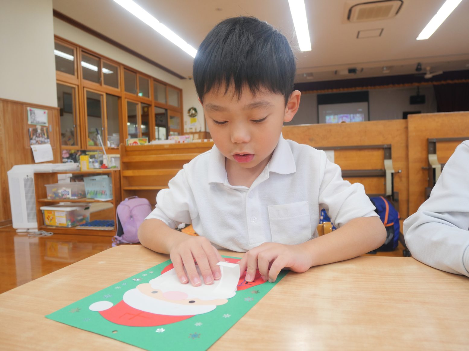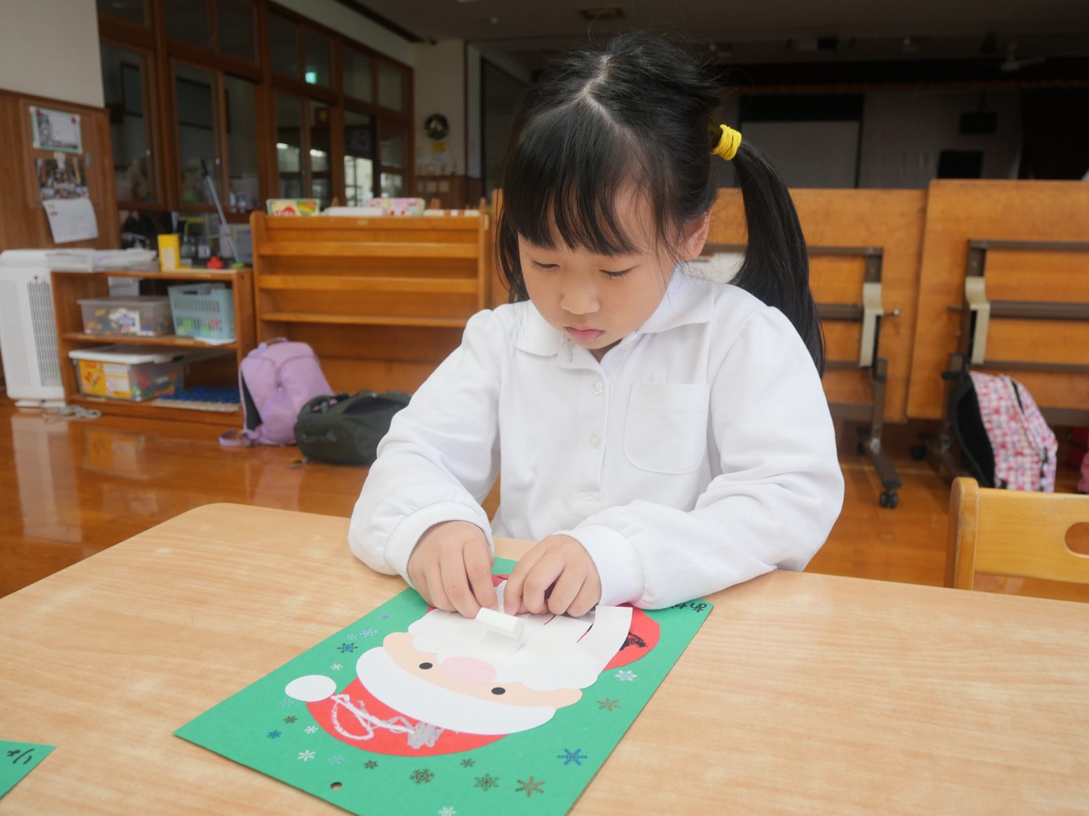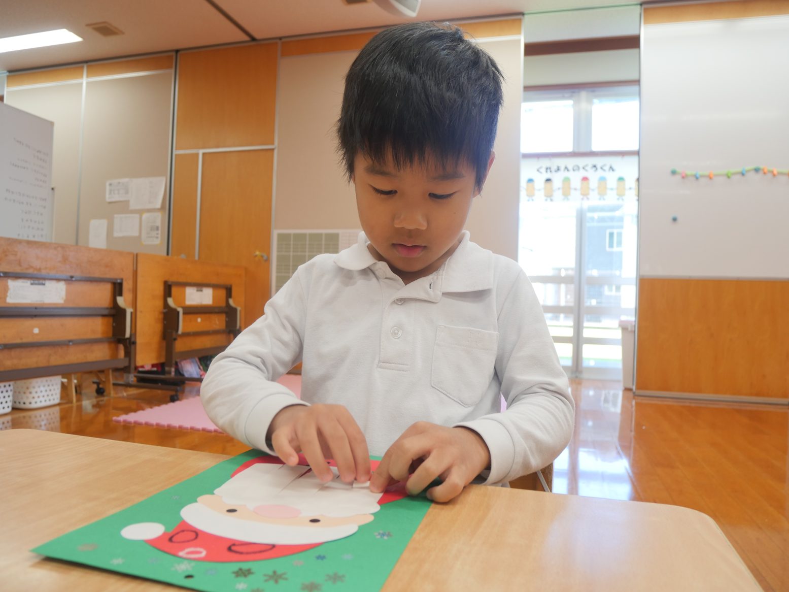 クリスマスの製作では、サンタを作りました。 白い紙をくるくると丸めていき、サンタの髭を作っていく子どもたち。 「くるくる~」「どんどん丸くなってきた!」と、嬉しそうに話す姿が見られました。 途中で苦戦している子がいると、「こうやってしたらいいよ。」「こうどうするの?」と声を掛け合いながら取り組んでいきます。 完成すると「できたよ!」「サンタさんになった。」と、みんなで出来上がった作品を発表していたうさぎ組さんです。
