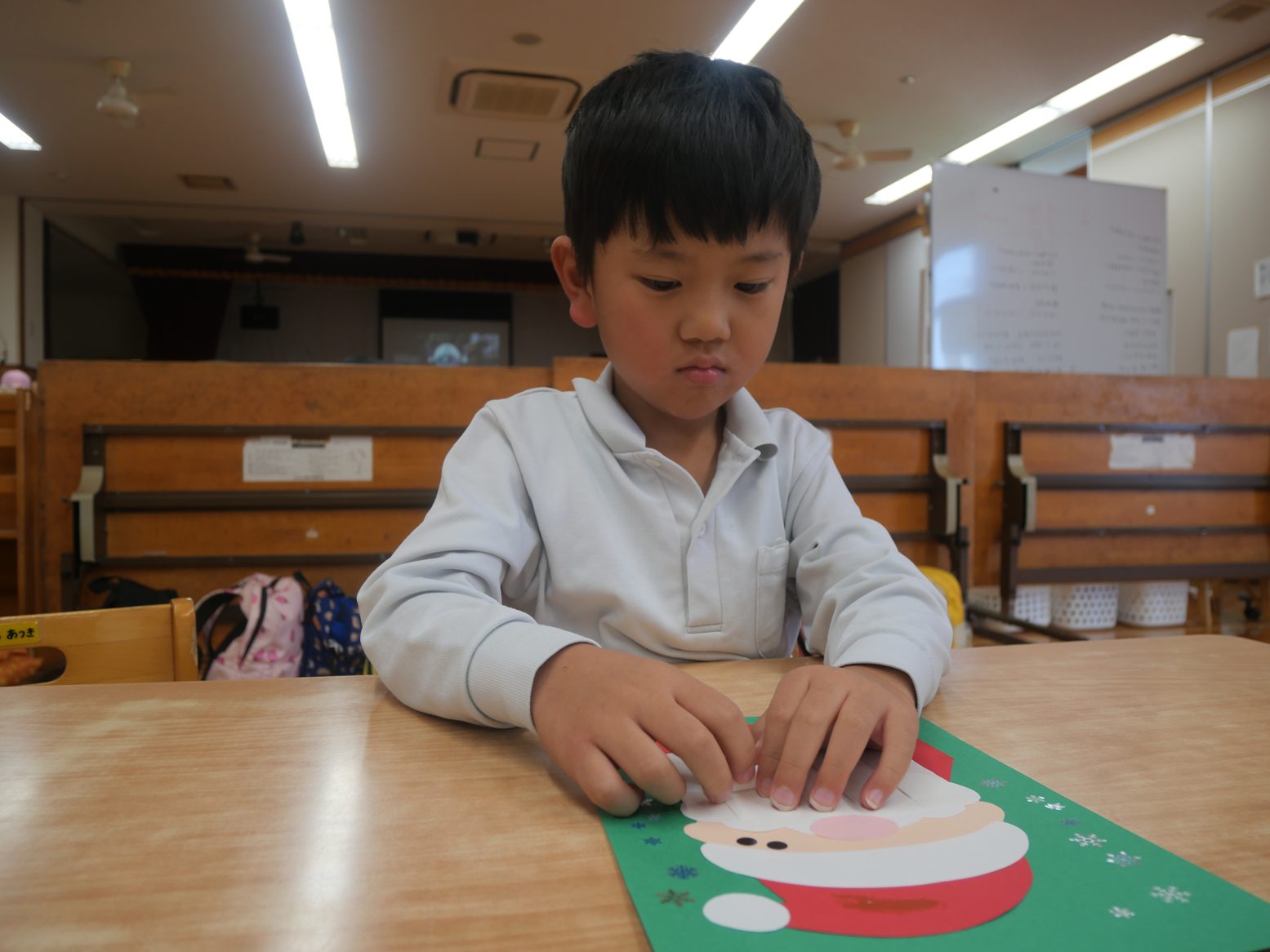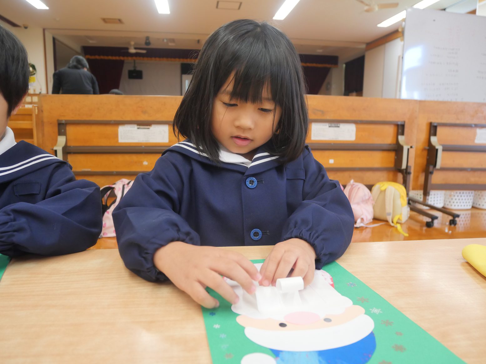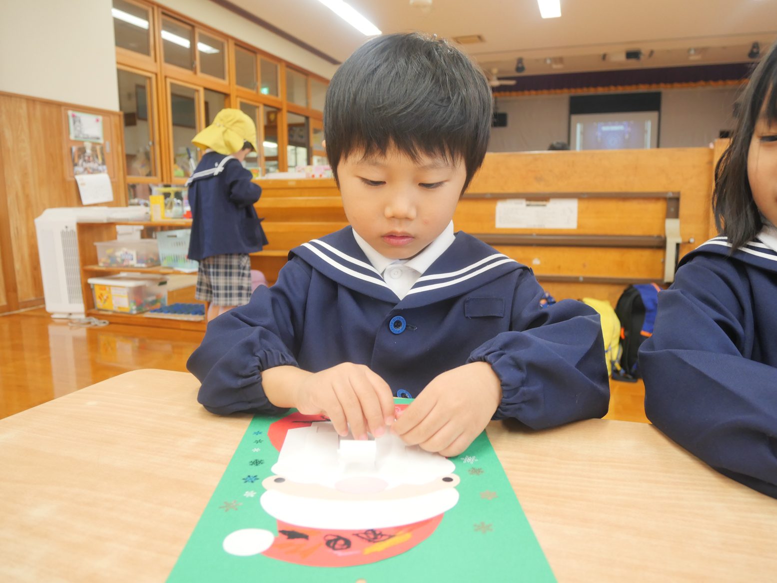 クリスマスの製作では、サンタを作りました。 白い紙をくるくると丸めていき、サンタの髭を作っていく子どもたち。 「くるくる~」「どんどん丸くなってきた!」と、嬉しそうに話す姿が見られました。 途中で苦戦している子がいると、「こうやってしたらいいよ。」「こうどうするの?」と声を掛け合いながら取り組んでいきます。 完成すると「できたよ!」「サンタさんになった。」と、みんなで出来上がった作品を発表していたうさぎ組さんです。