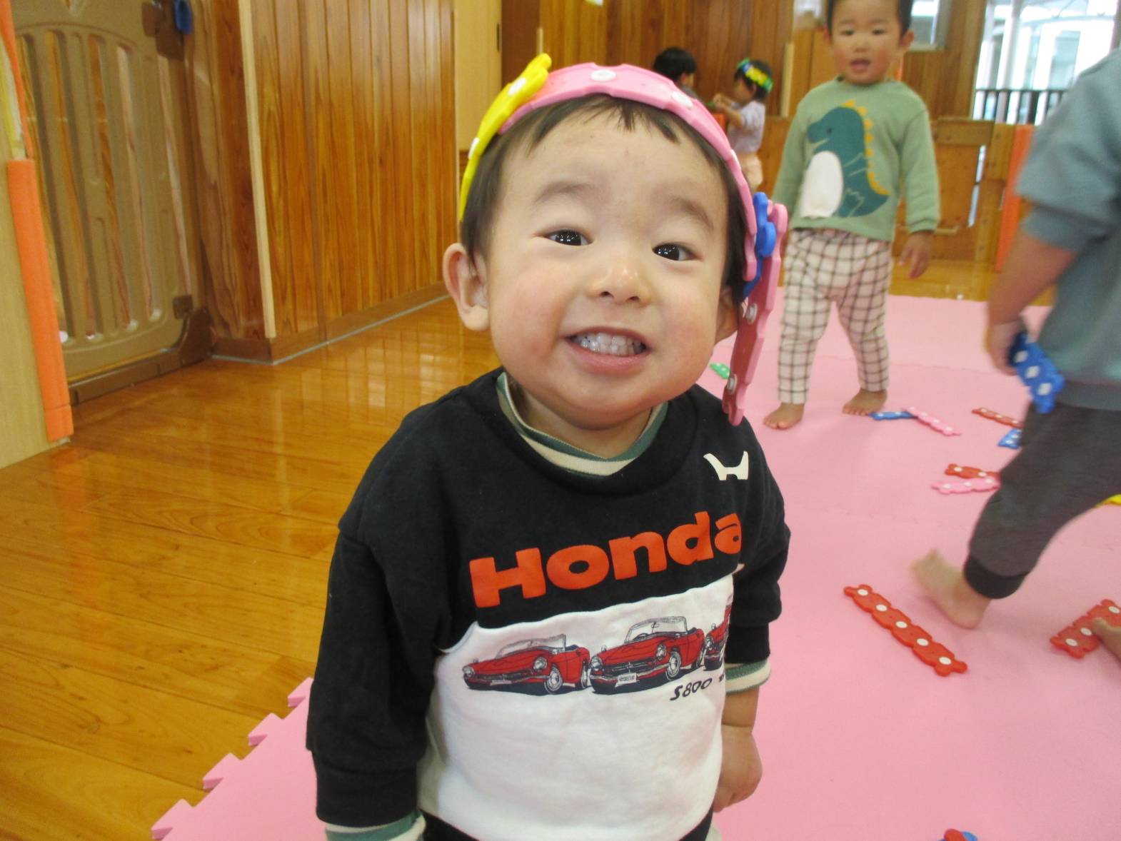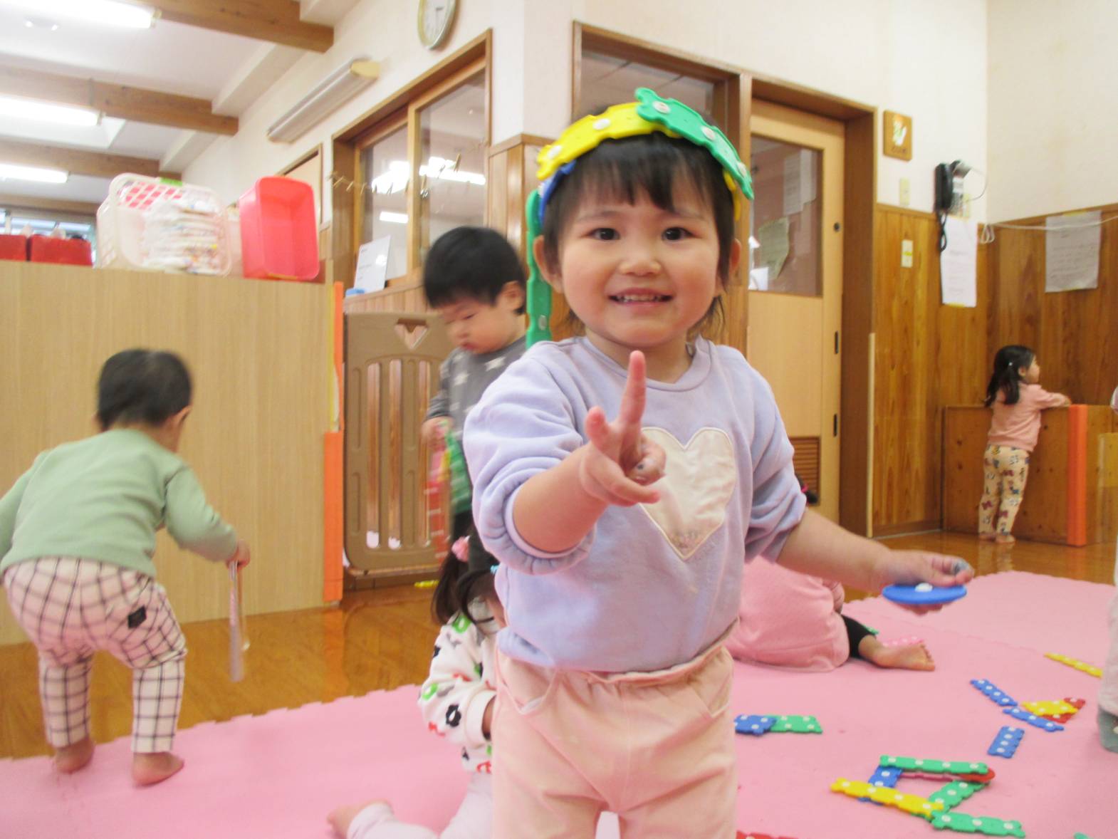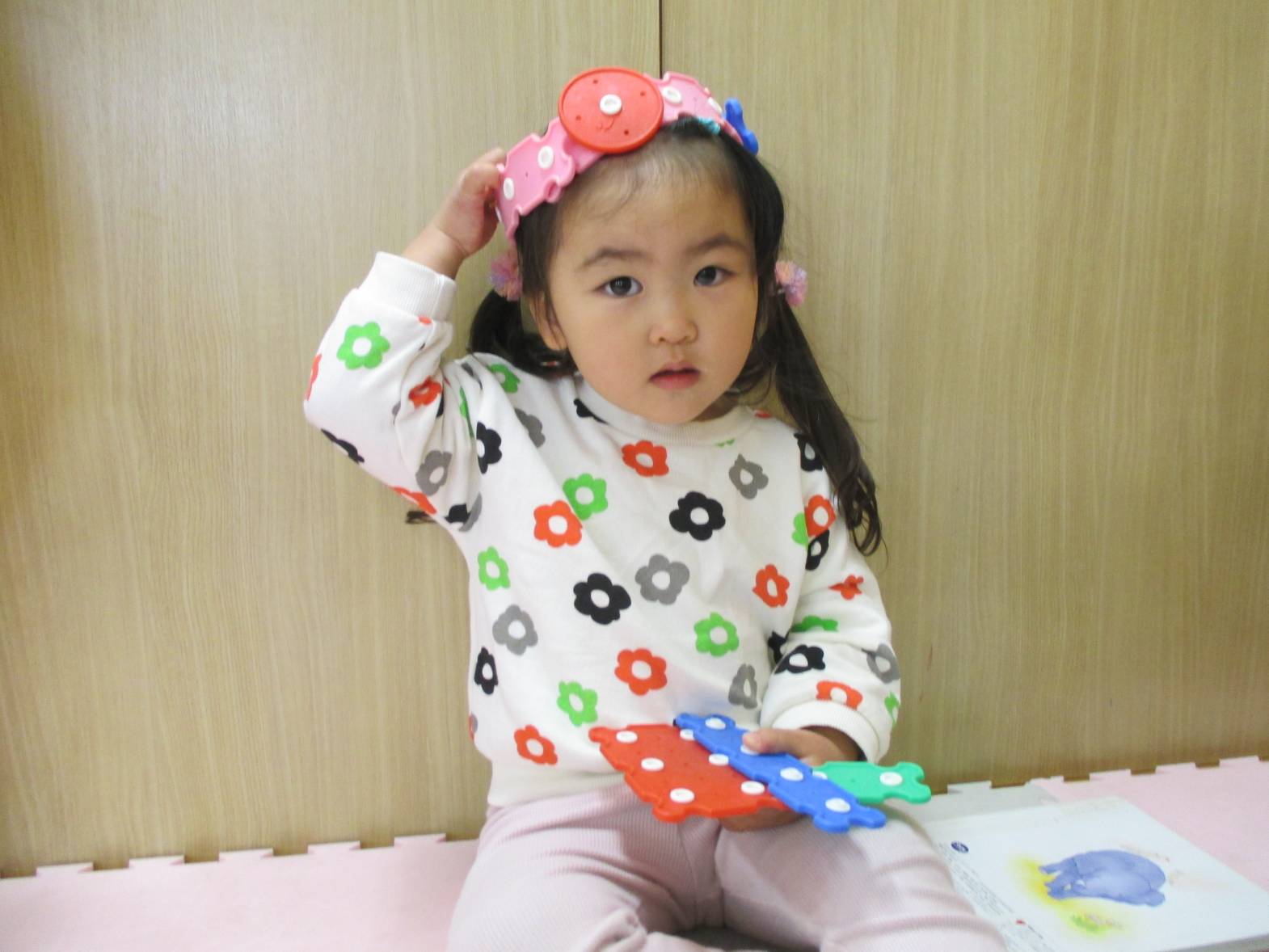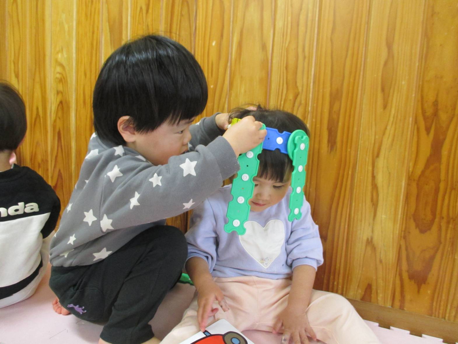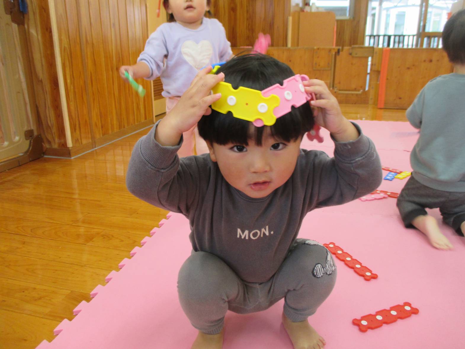 パチパチブロックに夢中のこあら組さん。 始めはうまくボタンを付けることができず「せんせいできない~」と言っていた子どもたちでしたが... 最近は試行錯誤しながら様々なものを作って楽しんでいます! お友だちと一緒に協力したり、助け合ったりしながら、「こうしよう!」や「これ使う?」などのやりとりも聞こえてくるようになりました。 上手に冠を作り、頭に付けてにこにこの子どもたちでした!!