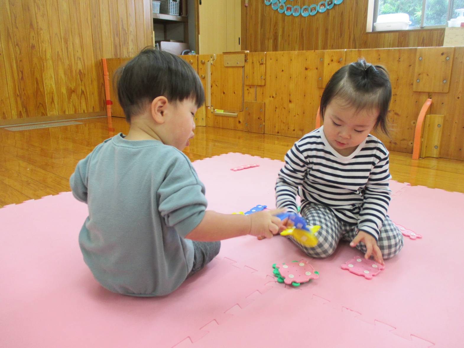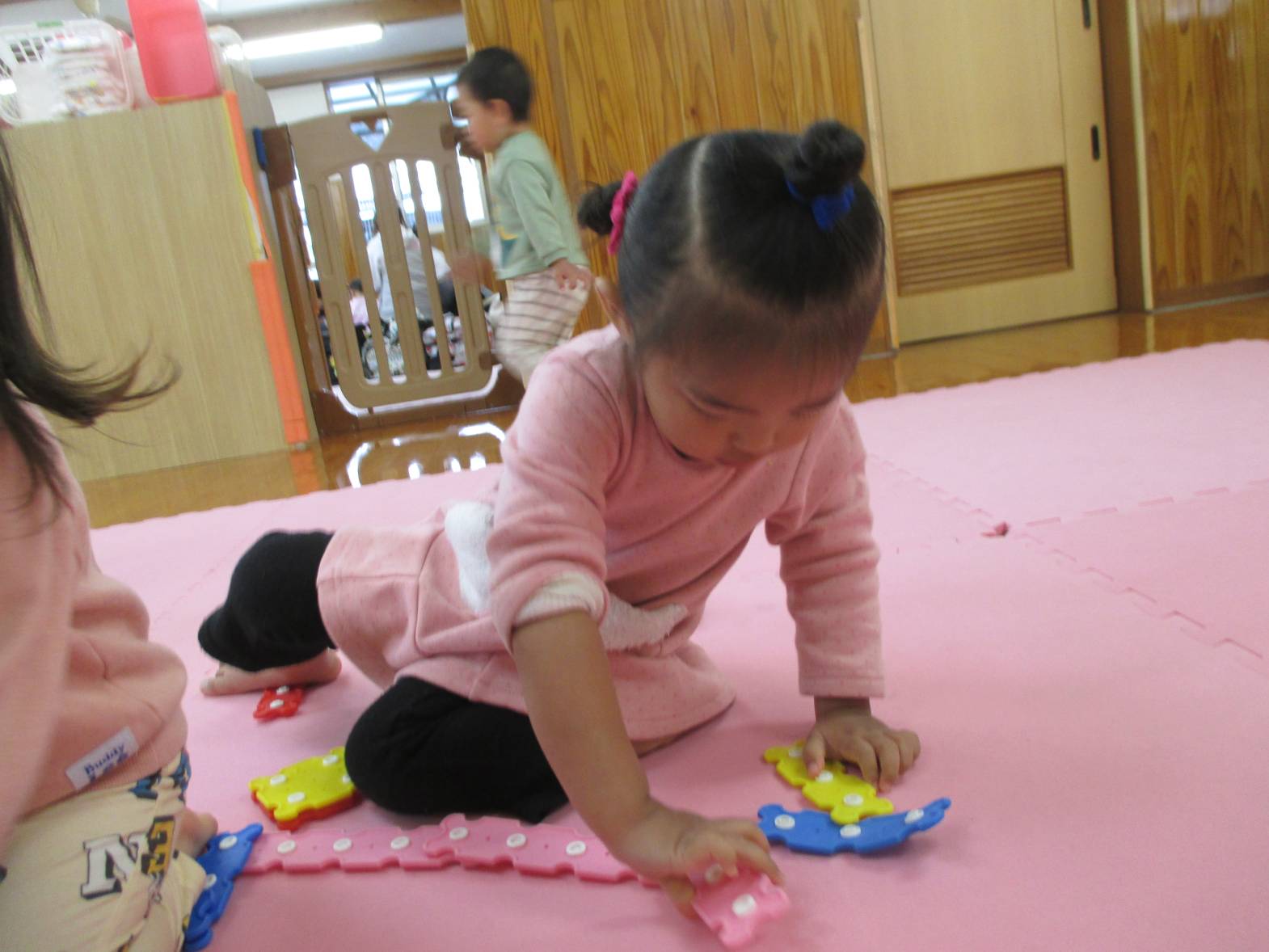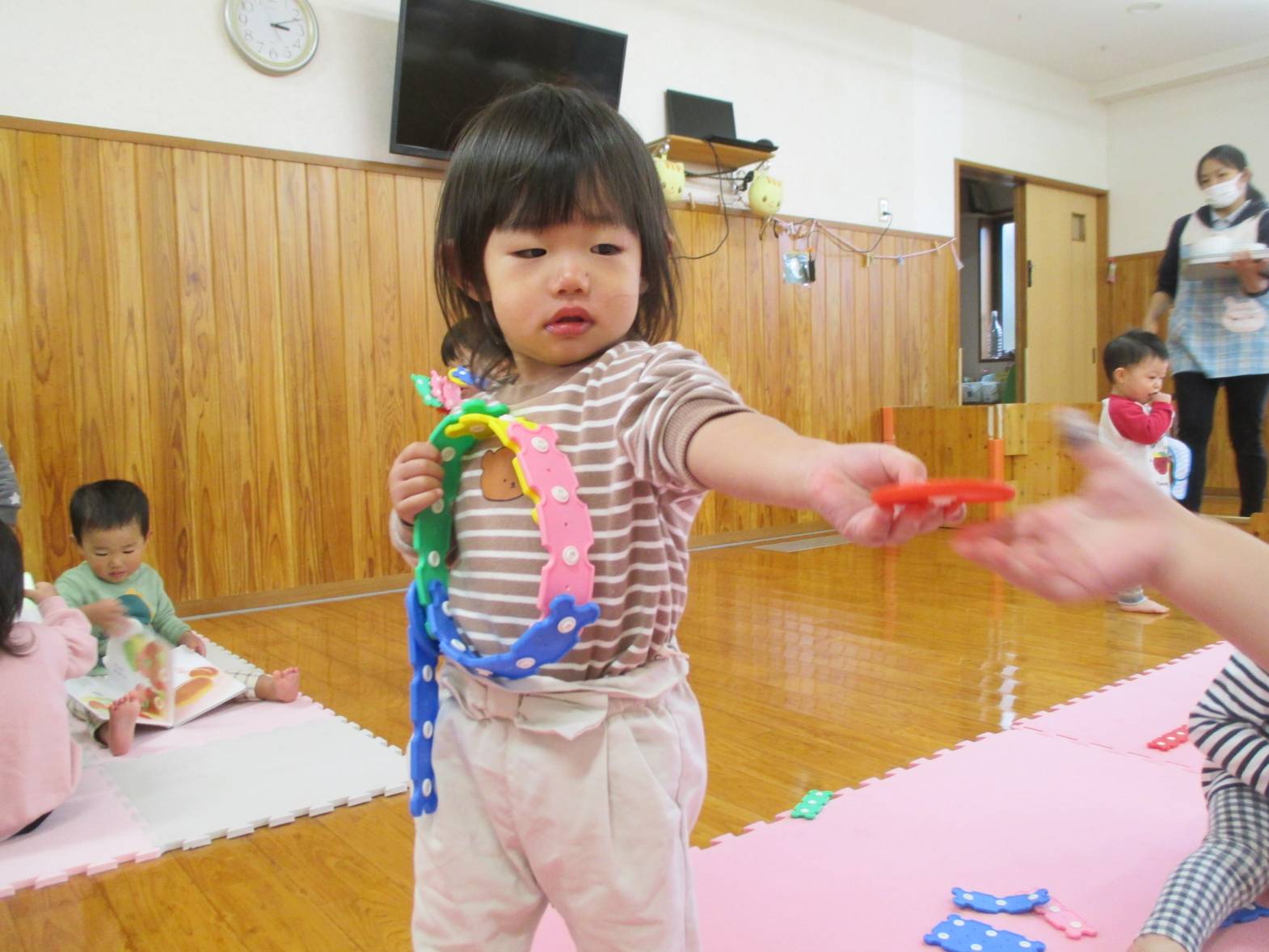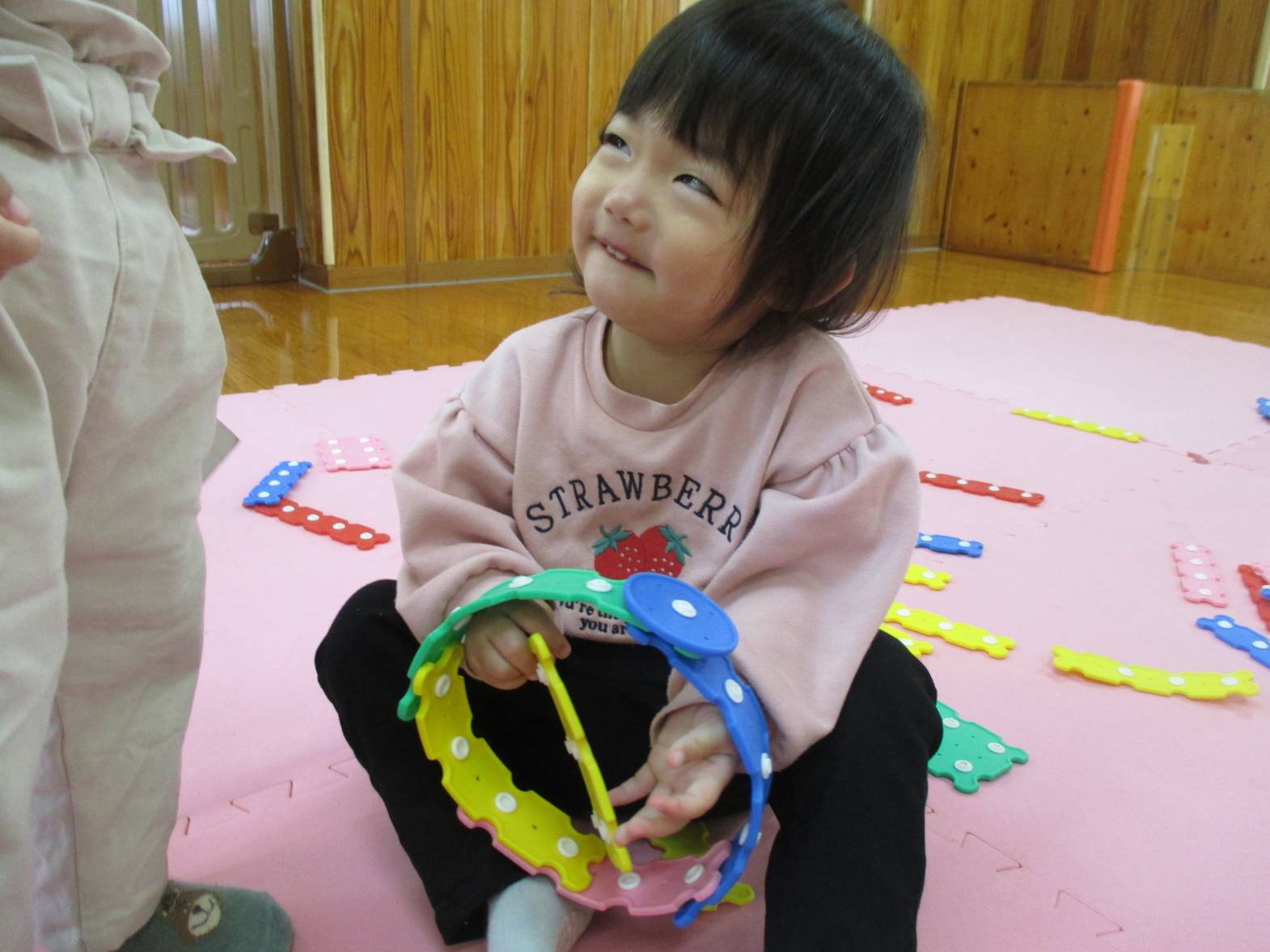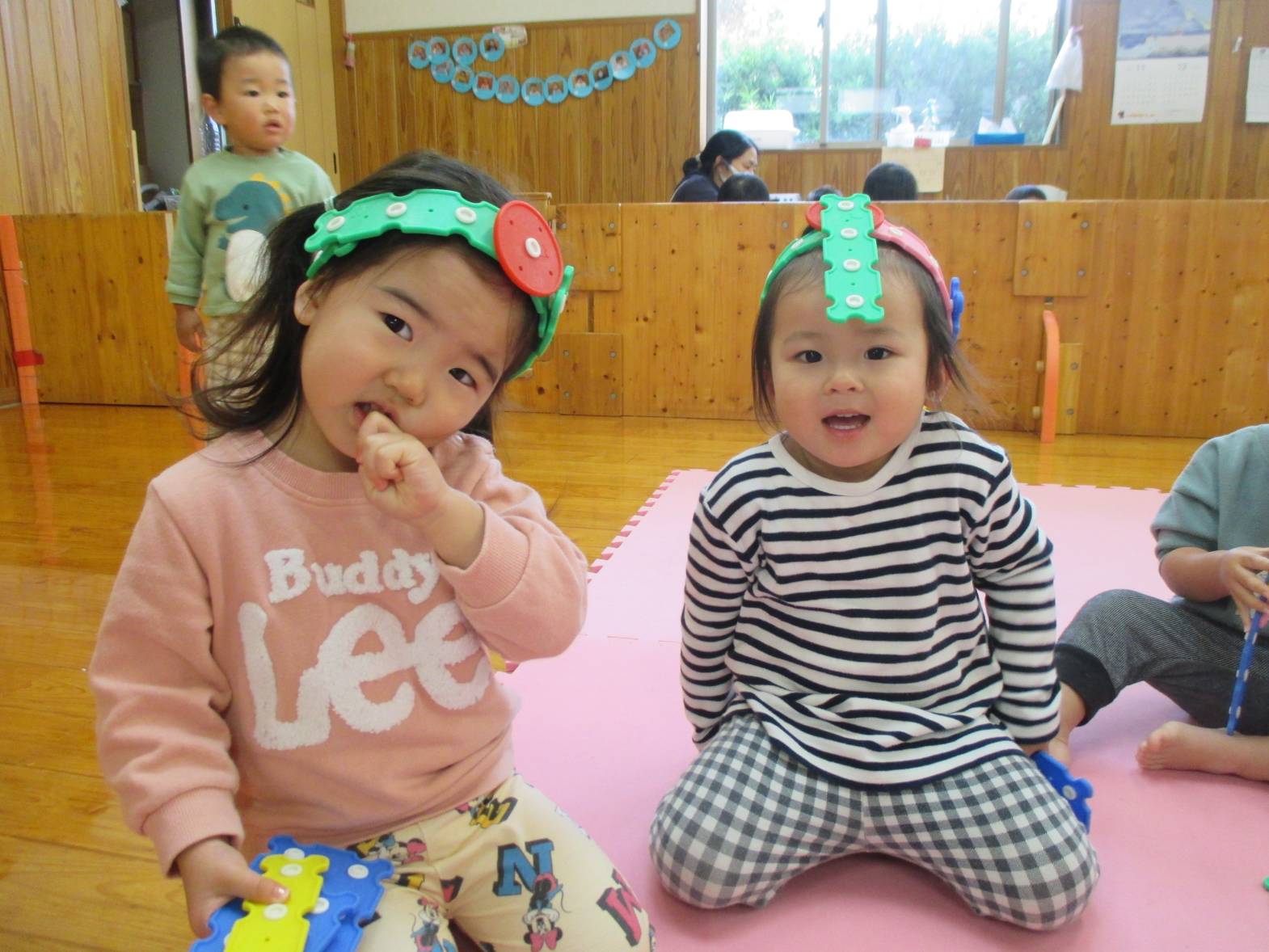 パチパチブロックに夢中のこあら組さん。 始めはうまくボタンを付けることができず「せんせいできない~」と言っていた子どもたちでしたが... 最近は試行錯誤しながら様々なものを作って楽しんでいます! お友だちと一緒に協力したり、助け合ったりしながら、「こうしよう!」や「これ使う?」などのやりとりも聞こえてくるようになりました。 上手に冠を作り、頭に付けてにこにこの子どもたちでした!!